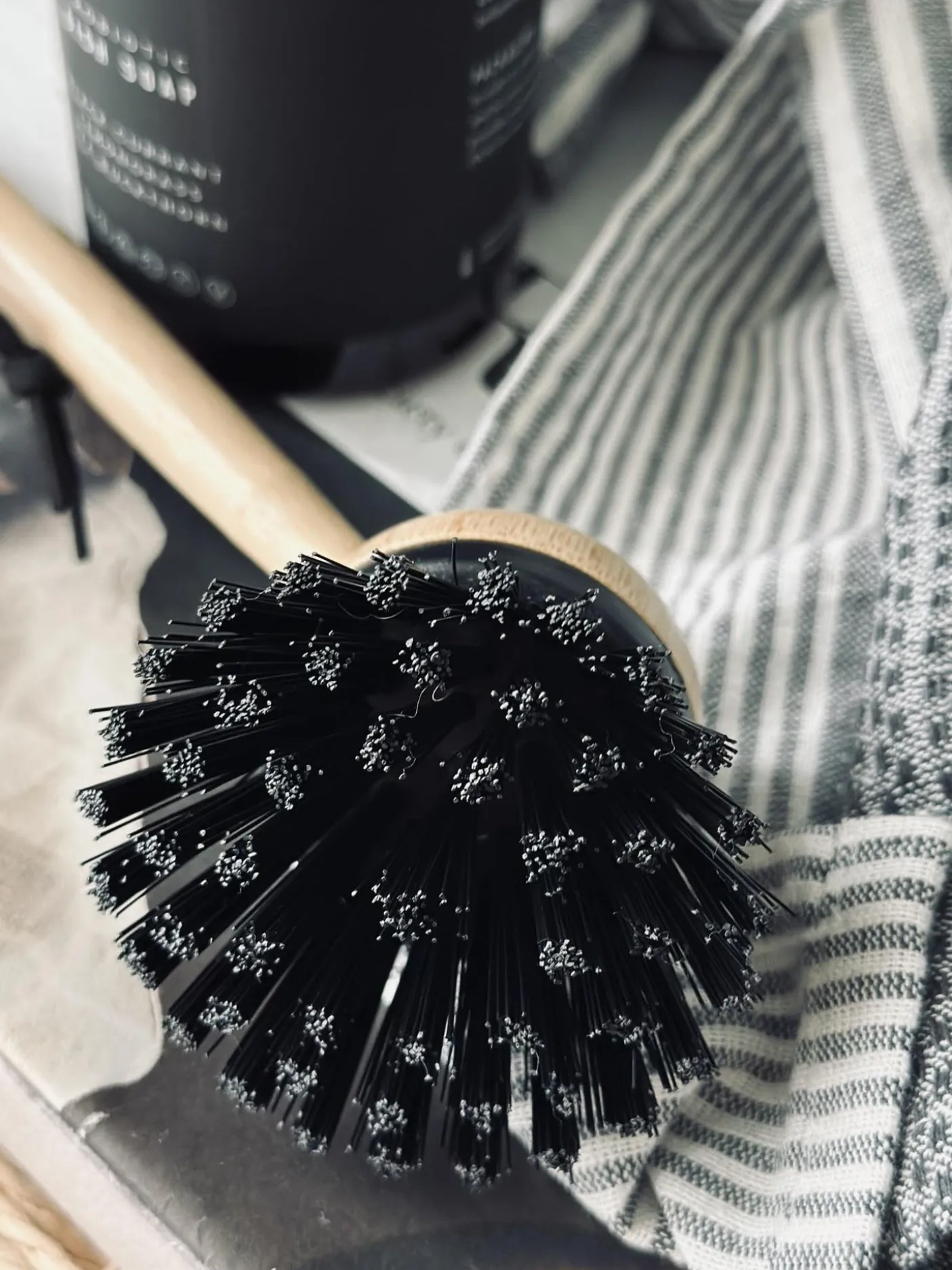 Opvaskebørste i bambus med læderstrop.