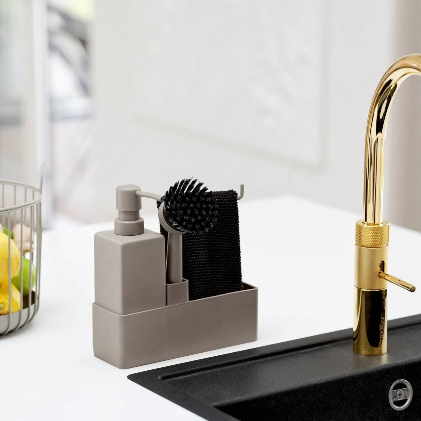 - Materialer : Sæbedispenser er fremstillet i solid keramik, er firkantet i form og har et rumindhold på 0,4 liter. Holder til dispenser og børste og karklud er fremstillet i silikone.