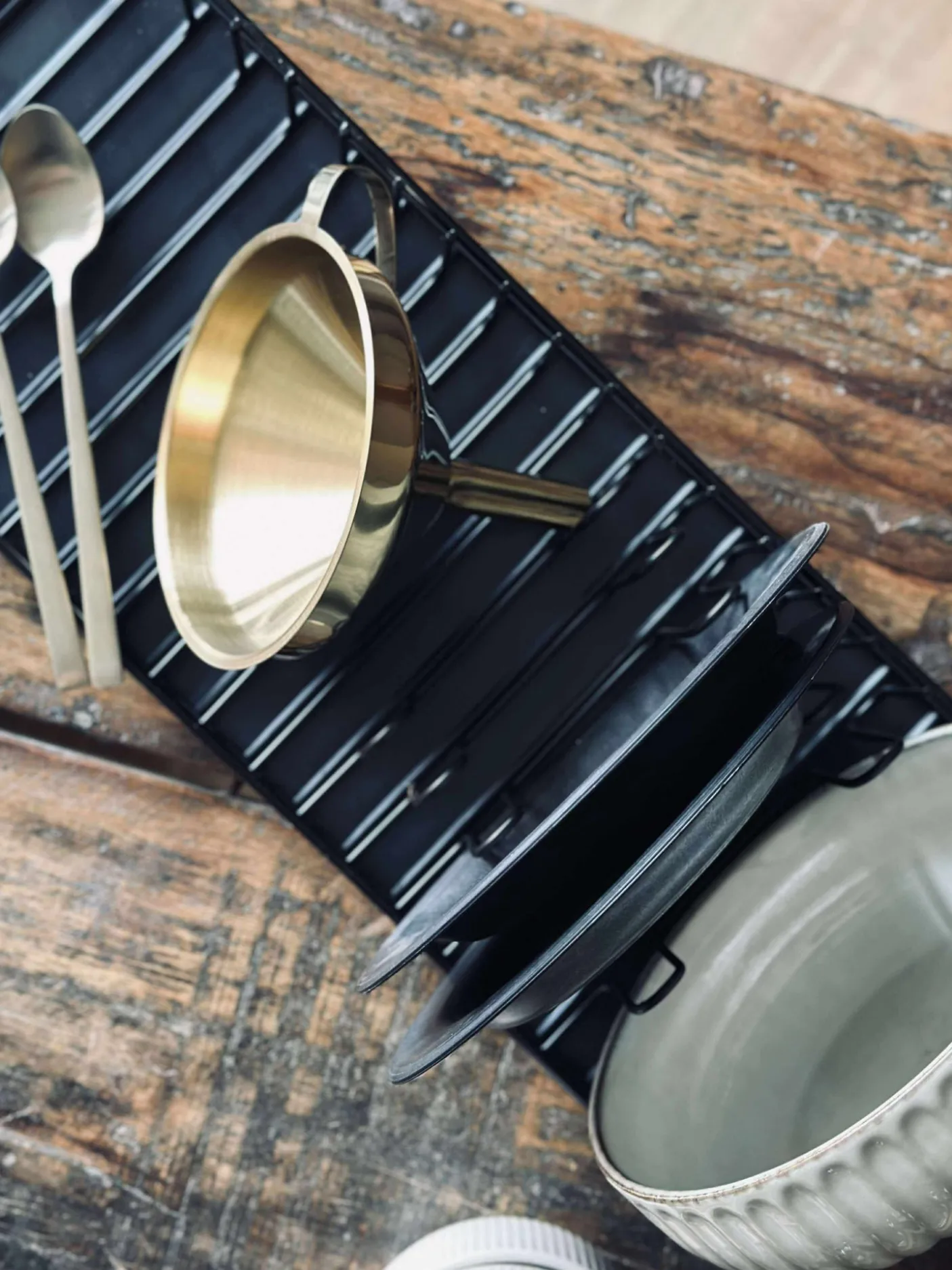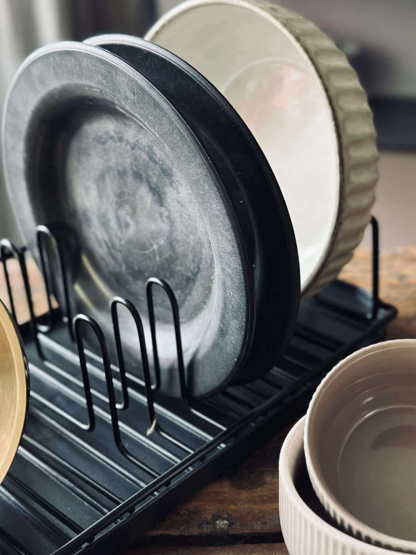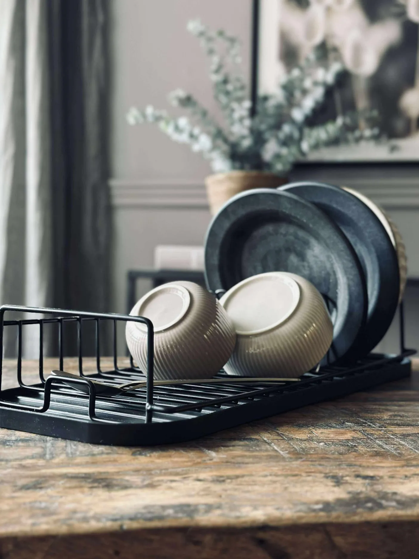 Opvaskestativ sort metal og plast.