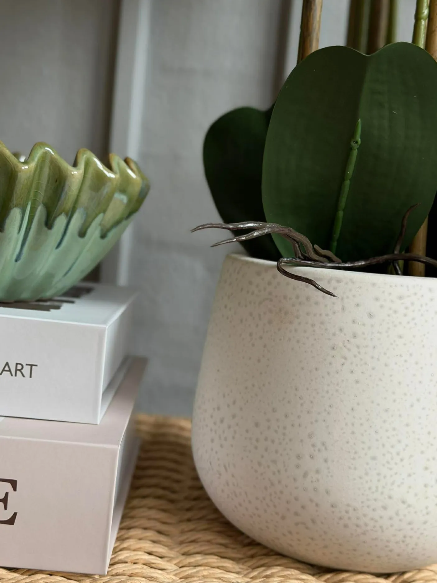 Naturtro orkidé i potte — et dekorativt element til stue, entré eller på kontoret. Højde: 65 cm. Potten medfølger. Udtrykket er afdæmpet og velegnet til neutrale farveskemaer.