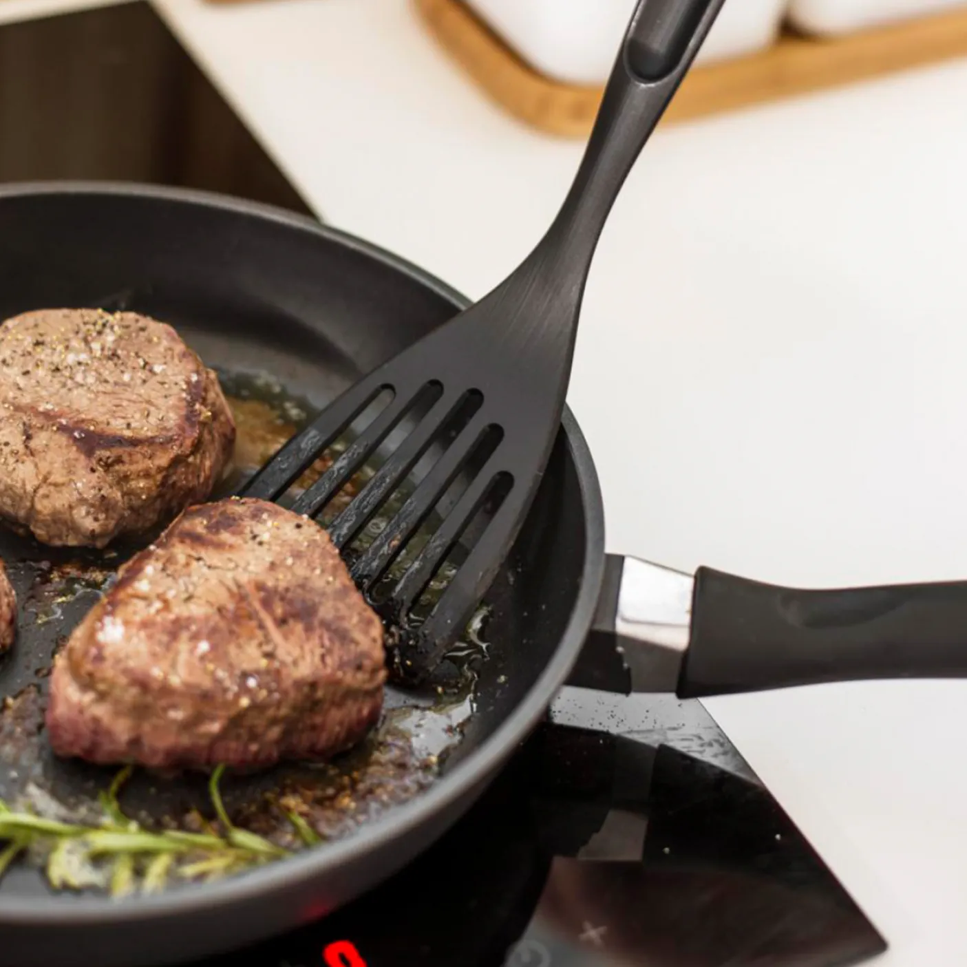 Fleksibel palet, der let glider ind under maden. Hullerne lader overskydende fedt løbe ud. Komfortabelt håndtag med tommelfingerstøtte for et godt greb. Paletten tåler temperaturer op til 230° C og er velegnet til non-stick køkkengrej.