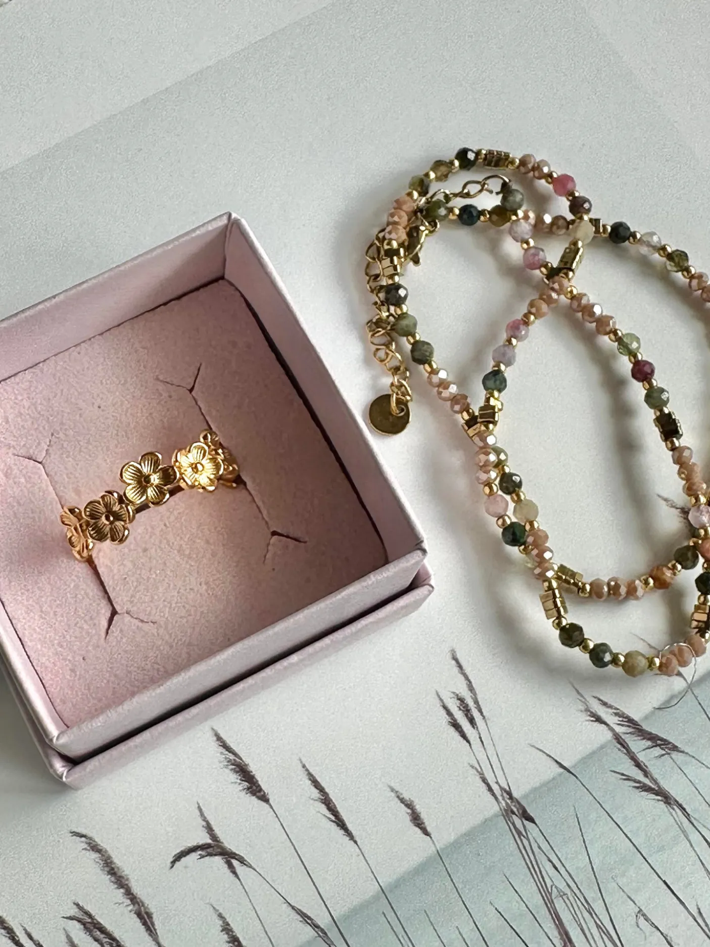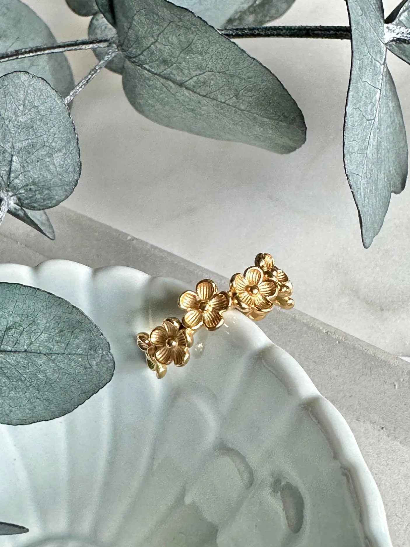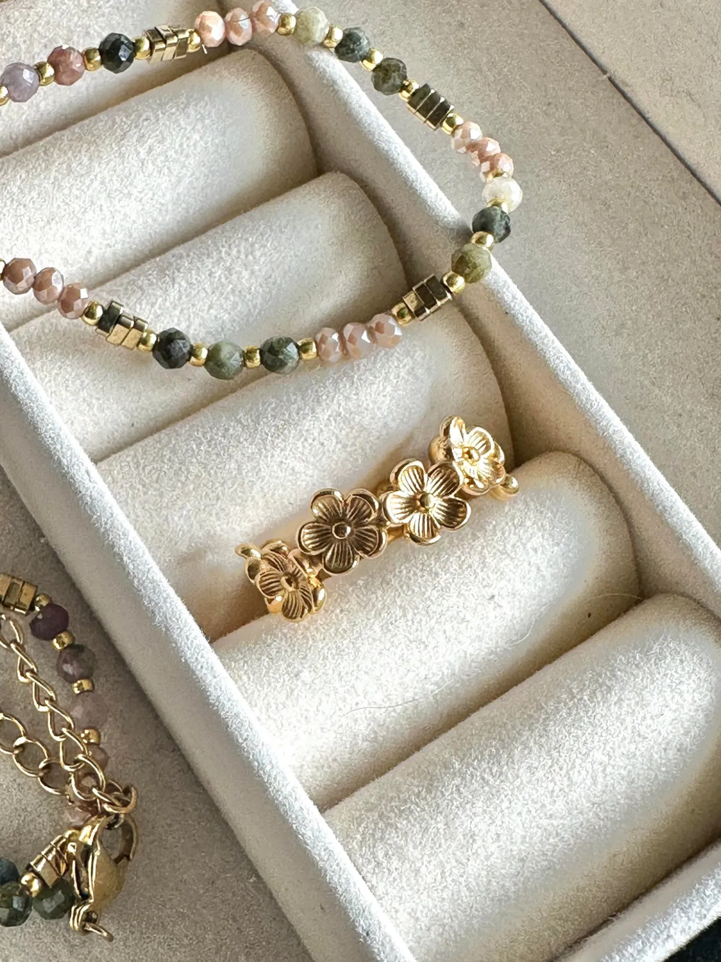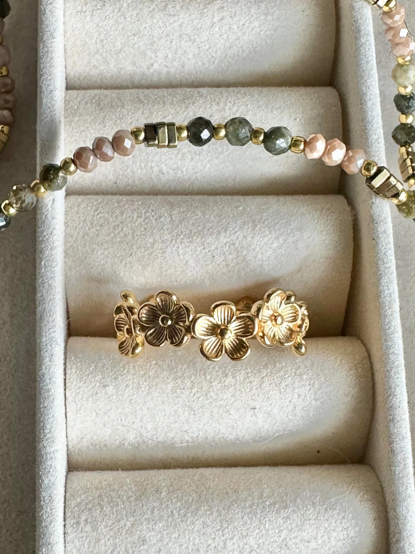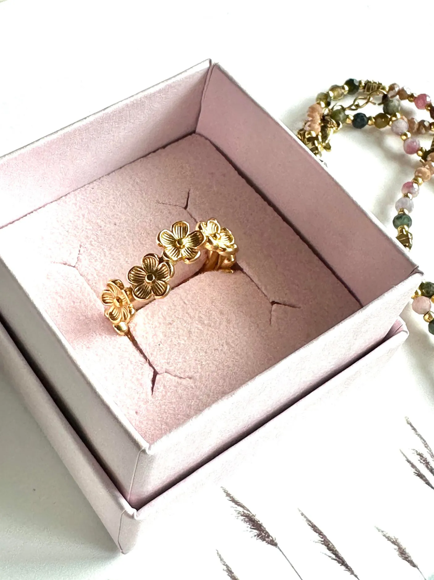 Den vandfaste ring i boheme stil er så let at have på. Den er smuk med sine små blomster. Ringen er fast i sin formgivning. Den er fleksibel i størrelse, dog kræver det at man trykker ringen sammen. Den stærke konstruktion og formgivning af ringen mister ikke form selvom den justeres. Den er vandfast, så tåler sved, vand og parfume.