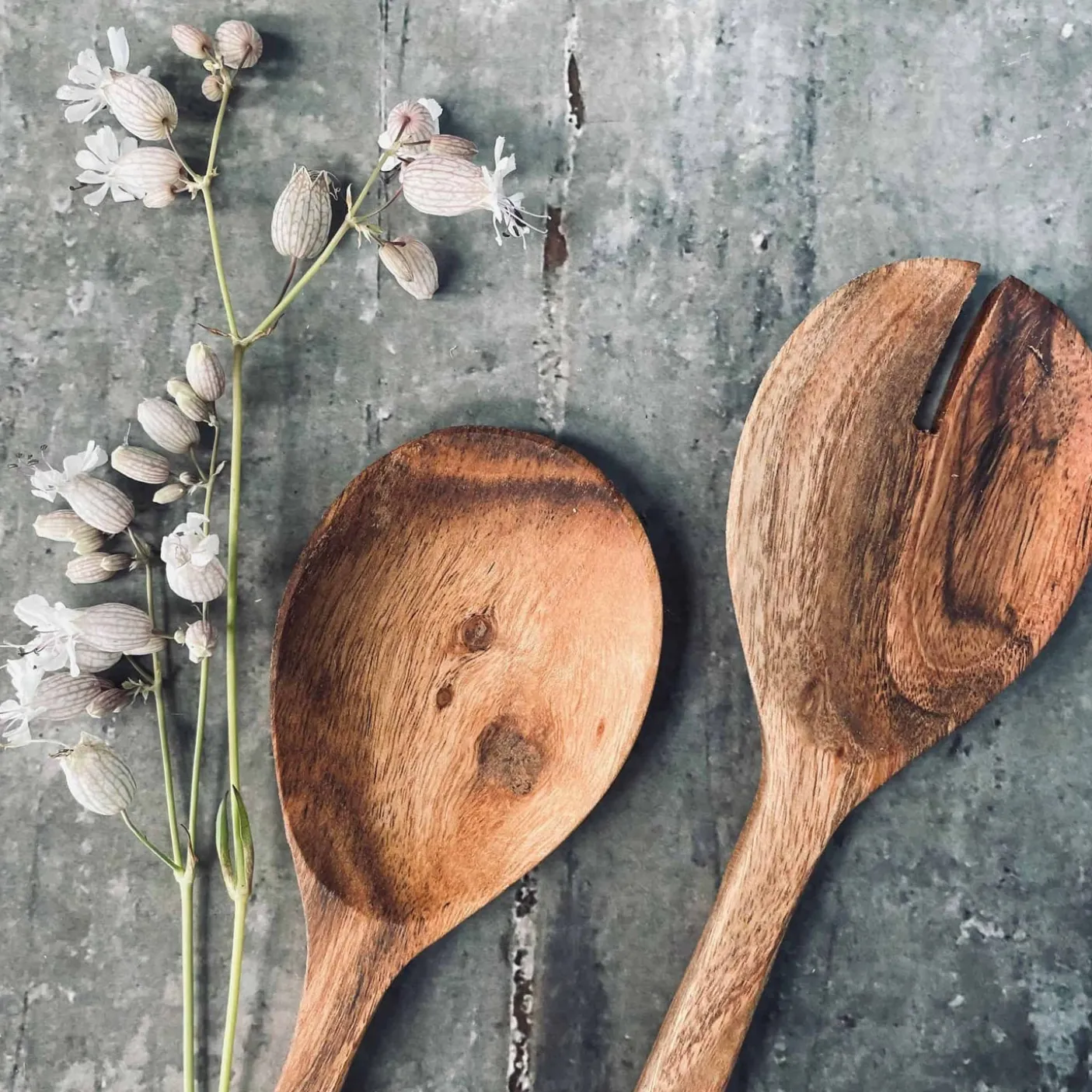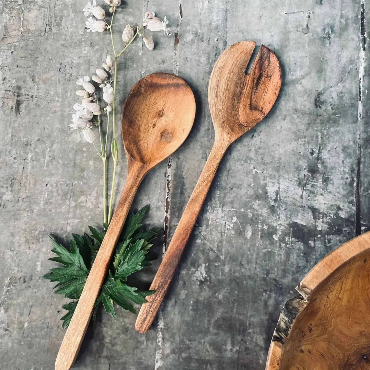 Salatbestik i olieret akacia træ.