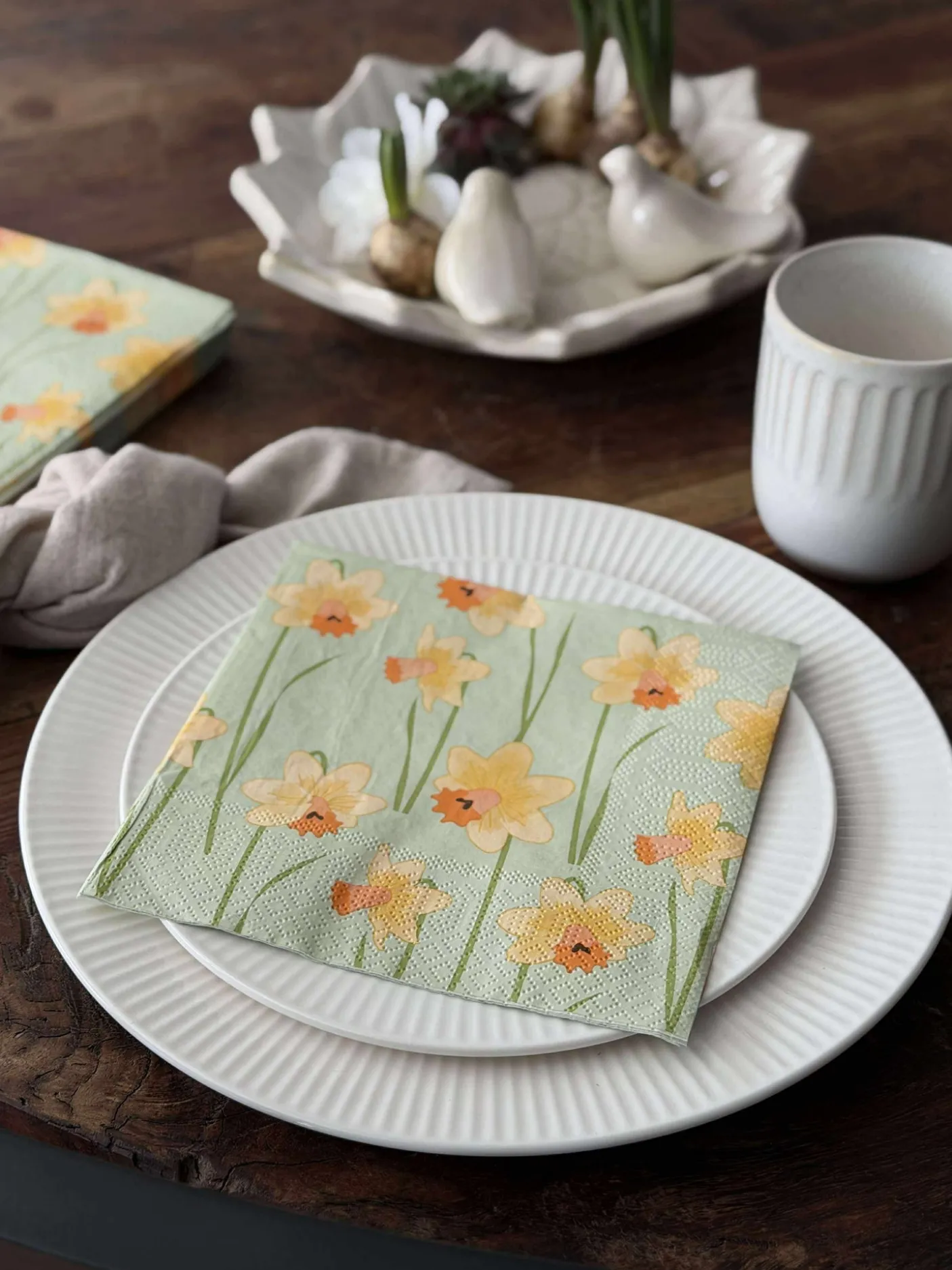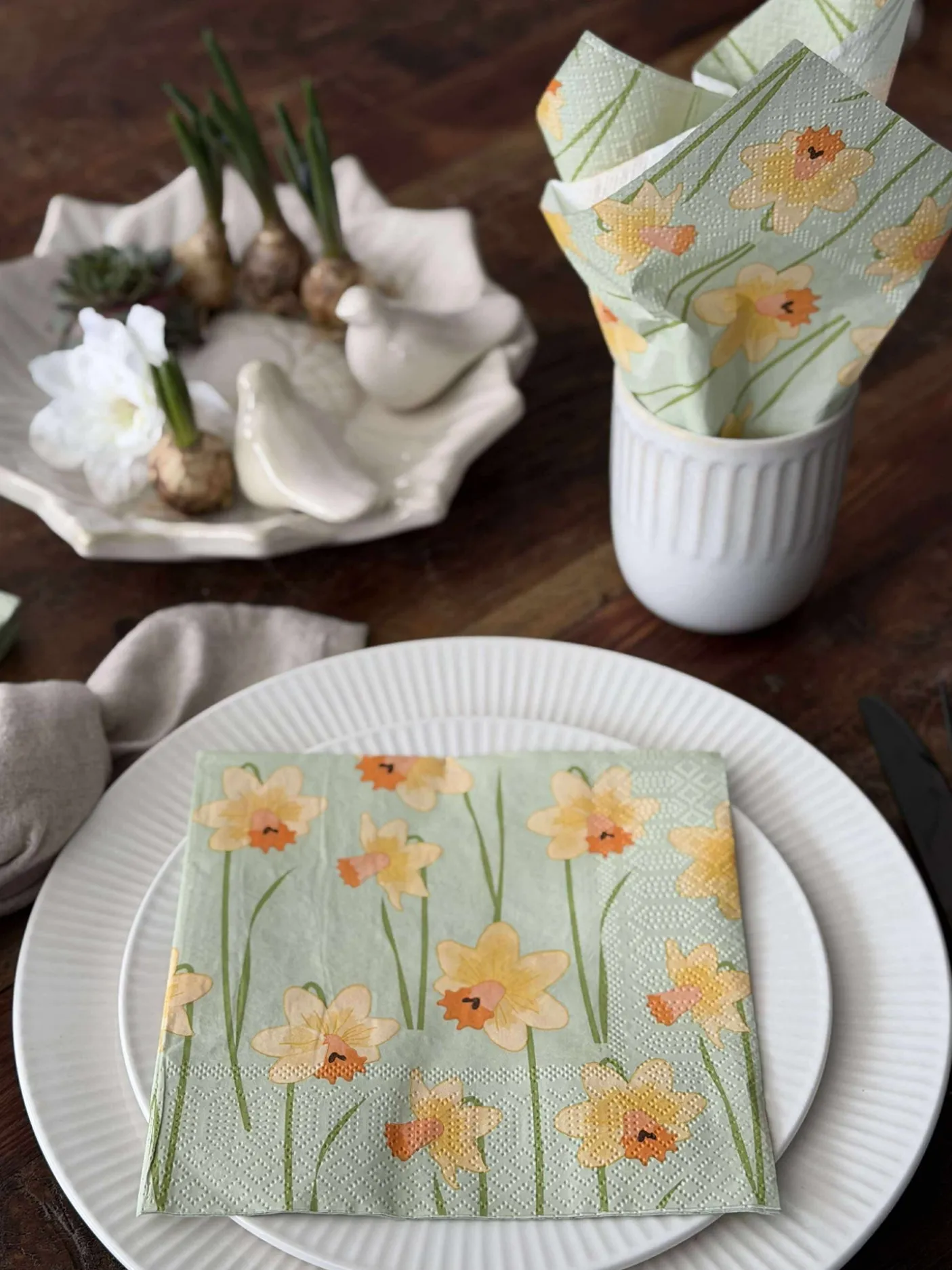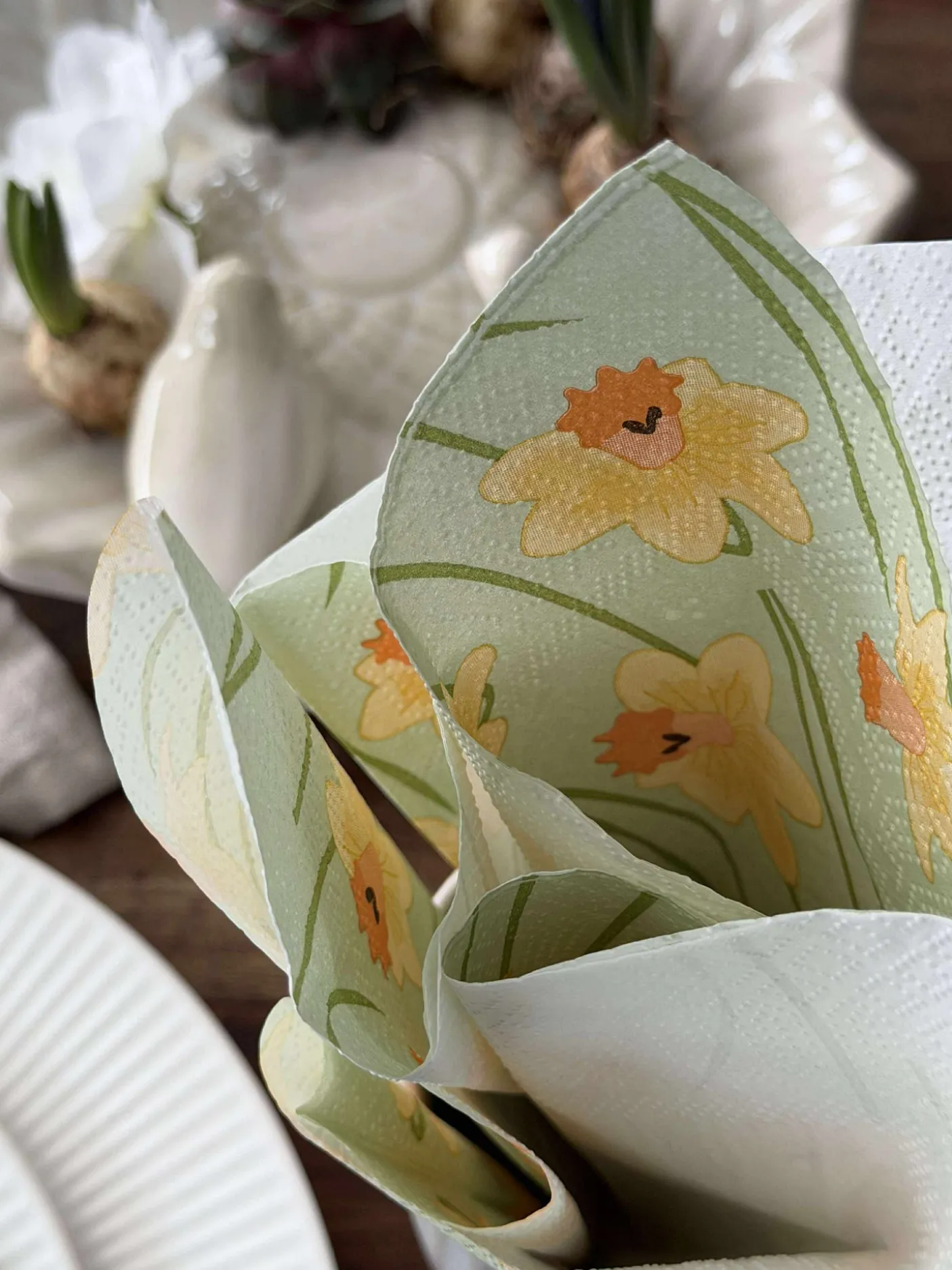 Forestil dig, hvordan dine gæster vil nyde et smukt dækket bord med disse miljøvenlige påskelilje-servietter. De tilføjer ikke kun elegance til enhver højtid, men viser også dit engagement i bæredygtighed. Gør dine festlige sammenkomster mindeværdige med denne perfekte kombination af stil og ansvarlighed.