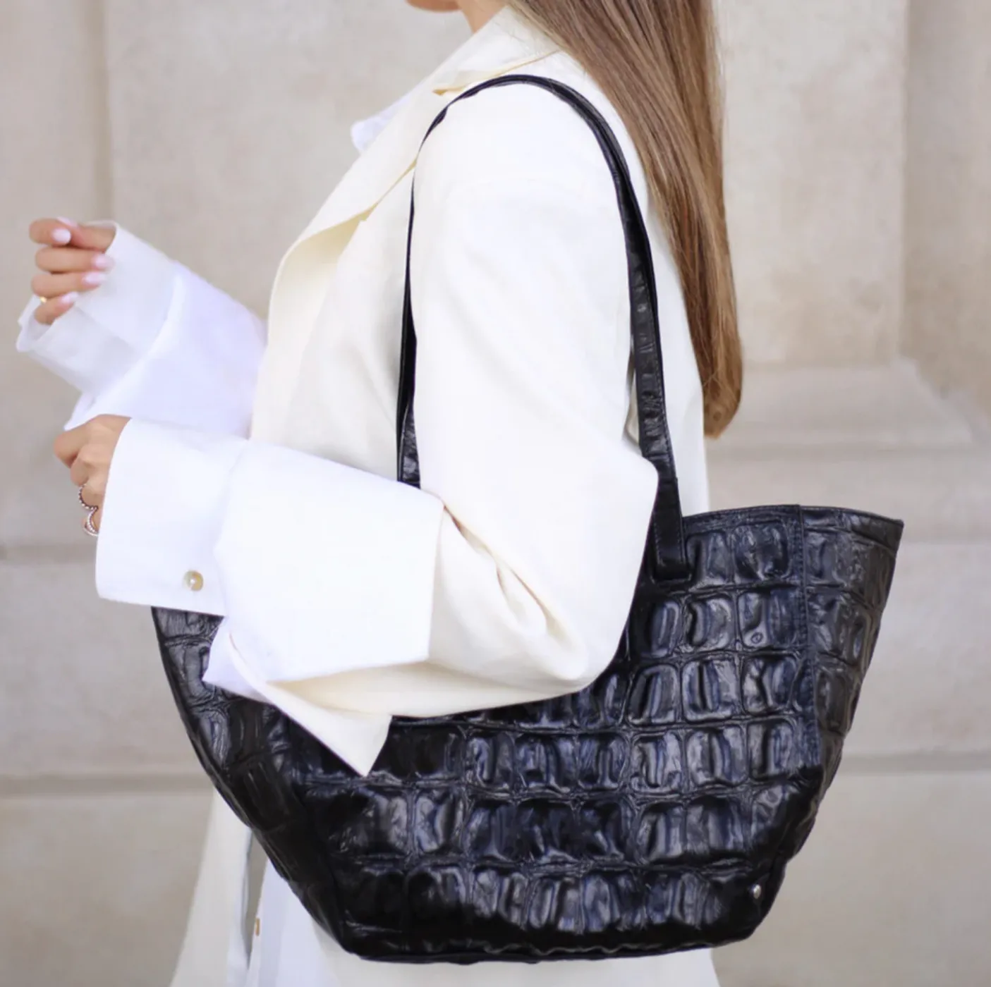 Det prægede skind tilføjer struktur og karakter til det tidløse design, hvilket gør tasken til et iøjnefaldende accessorie, uanset om du bruger den til arbejde, shopping eller på farten i hverdagen.