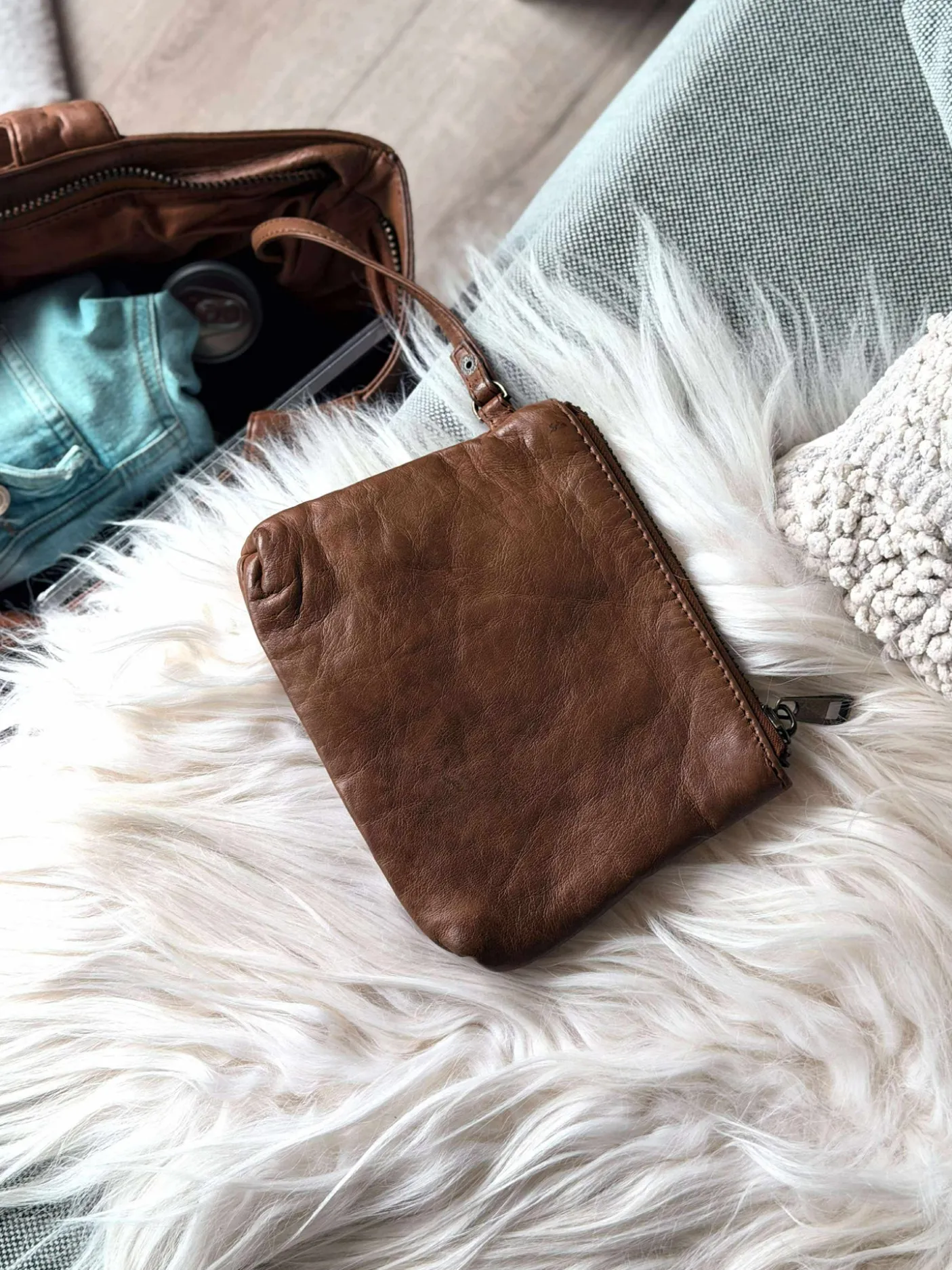 Tasken har et smukt vintage look, med en flot struktur i skindet og den lukkes i toppen med lynlås.