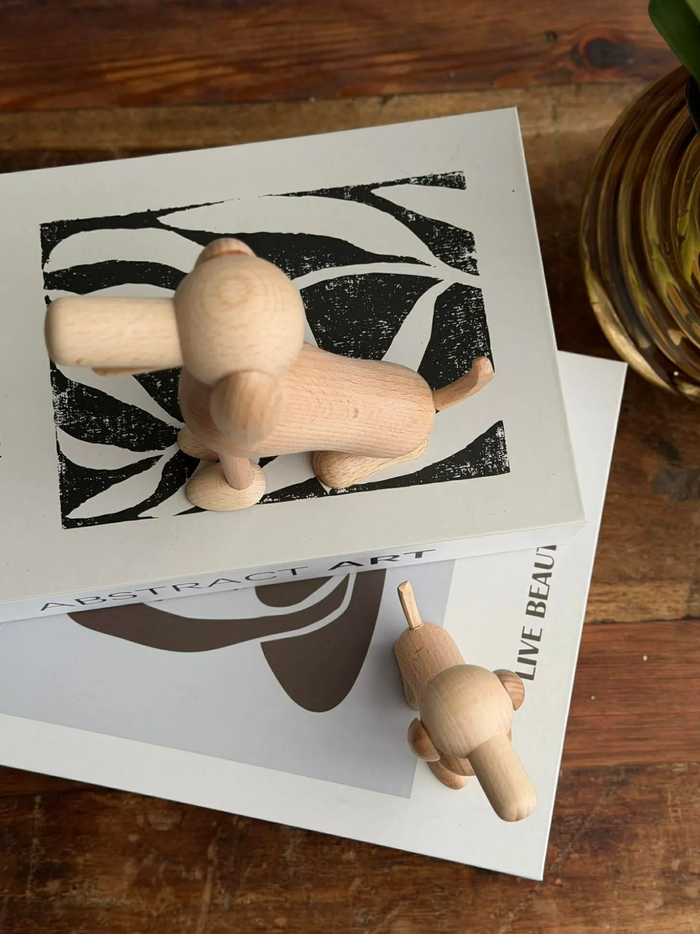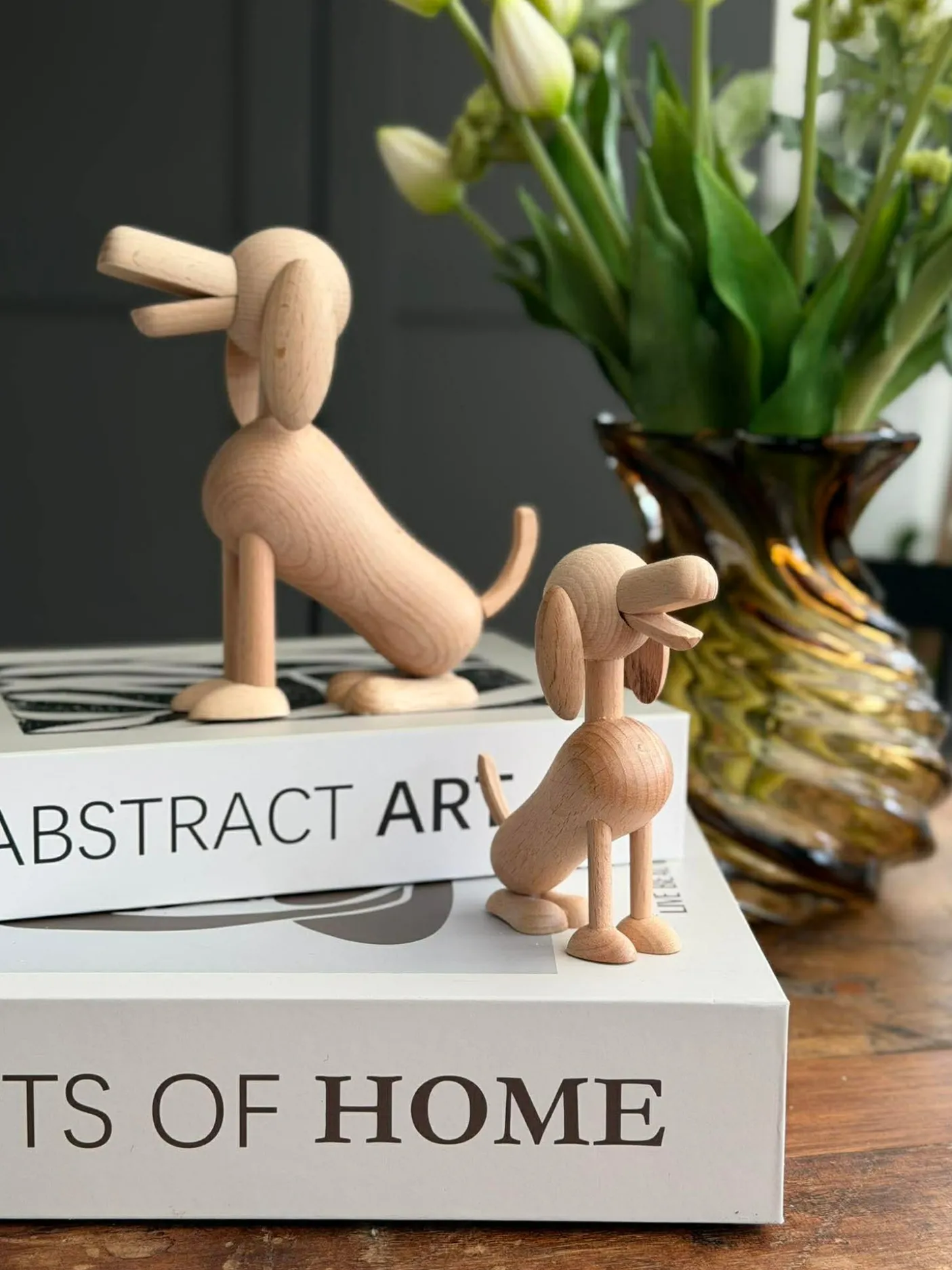 Siddende Hund Wood er en dekorativ træfigur skåret i massiv træ med et simpelt, naturligt udtryk. Den fås i to højder, så du kan vælge mellem en diskret variant eller en lidt større version. Figurens varme materialevalg passer godt som pynt på hylde, sidebord eller i vindueskarmen, også som del af sæsonens påskedekoration.