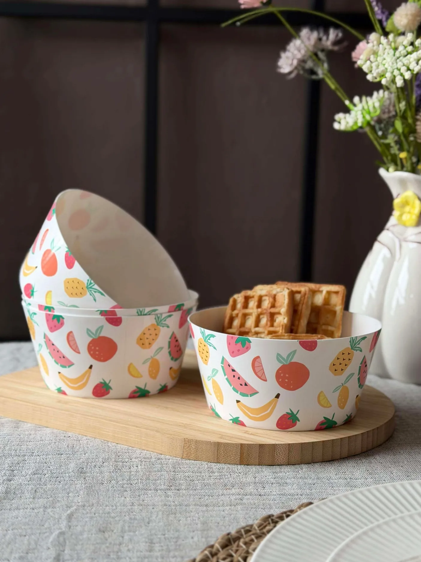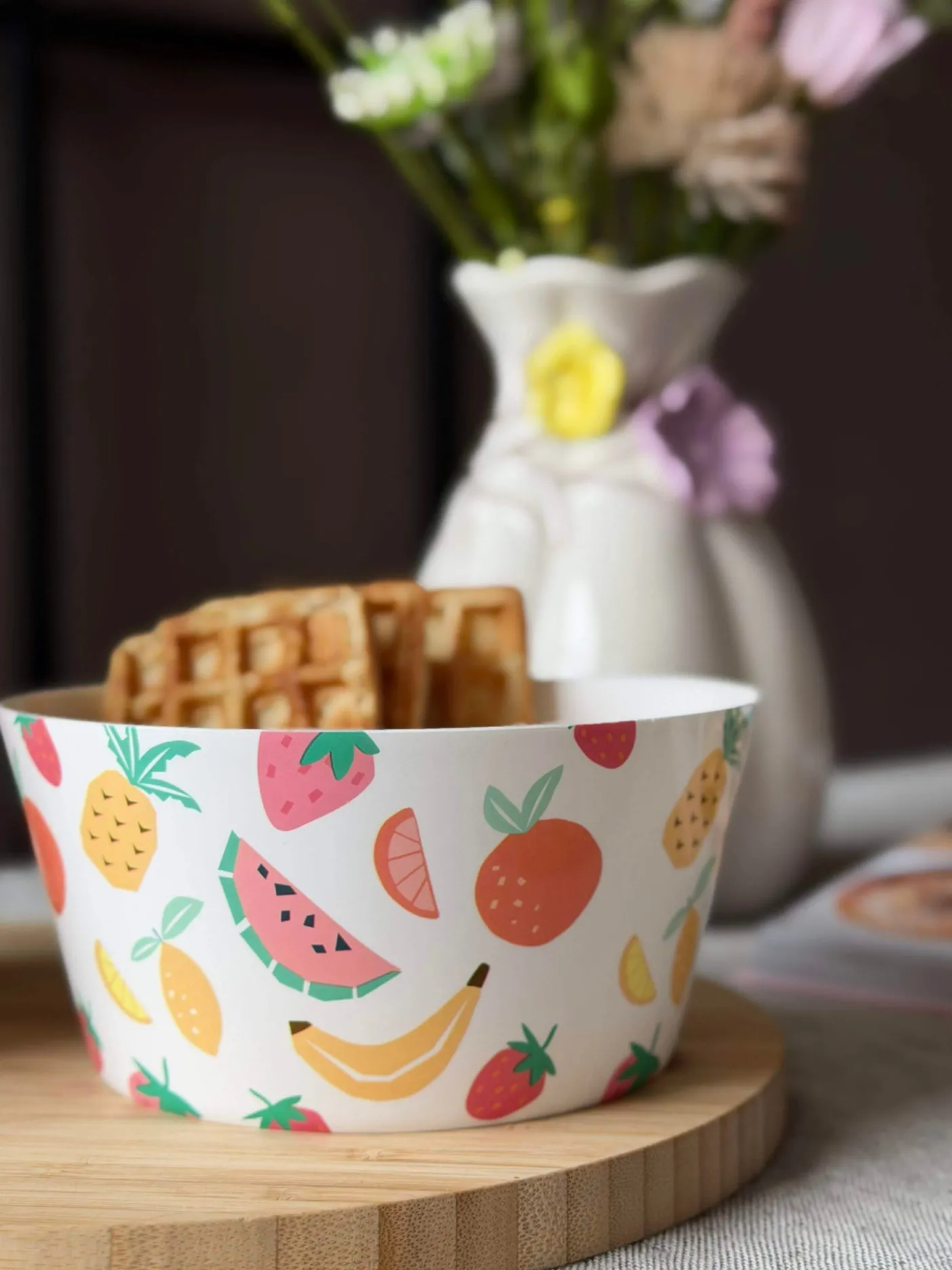 Det frugtmønstrede print skaber et muntert og indbydende look, fint til uformelle måltider og sommerlige sammenhænge.