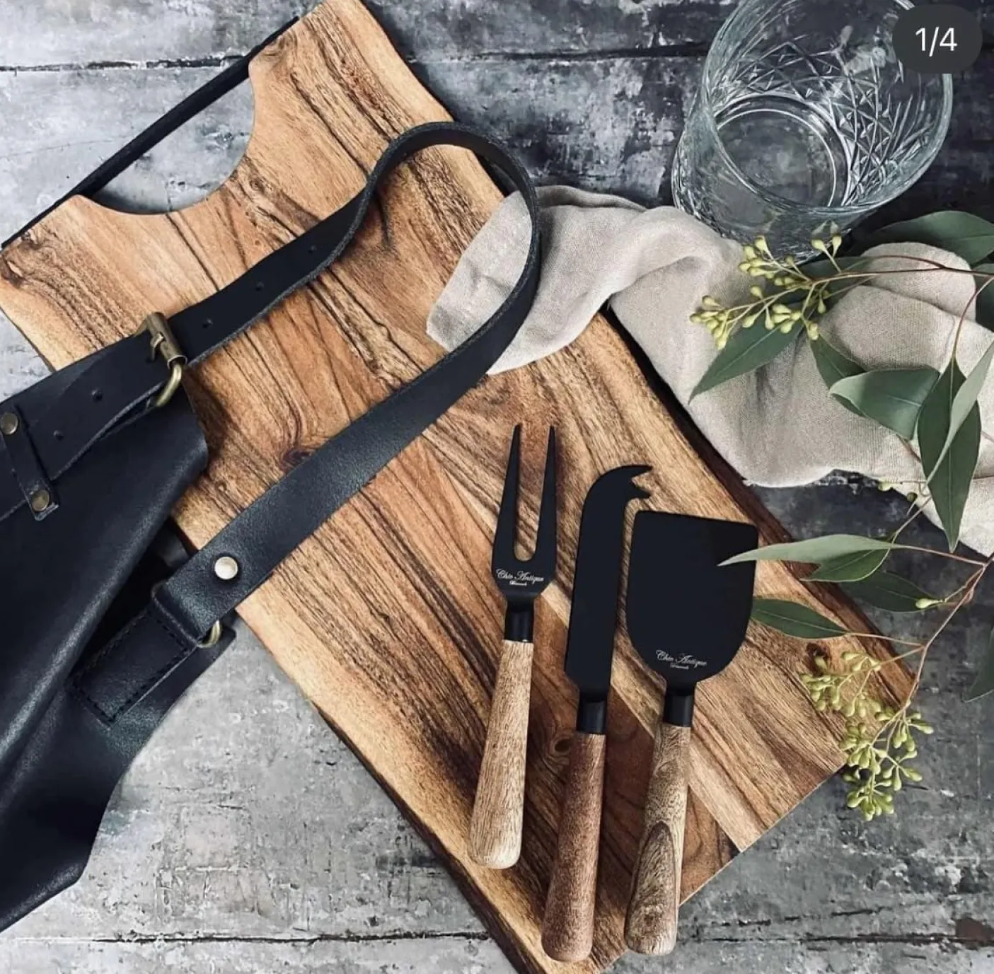 Lækkert skærebræt i akaciatræ med læder ophæng.