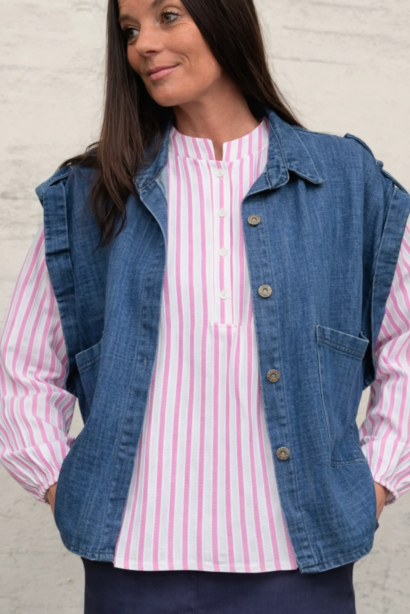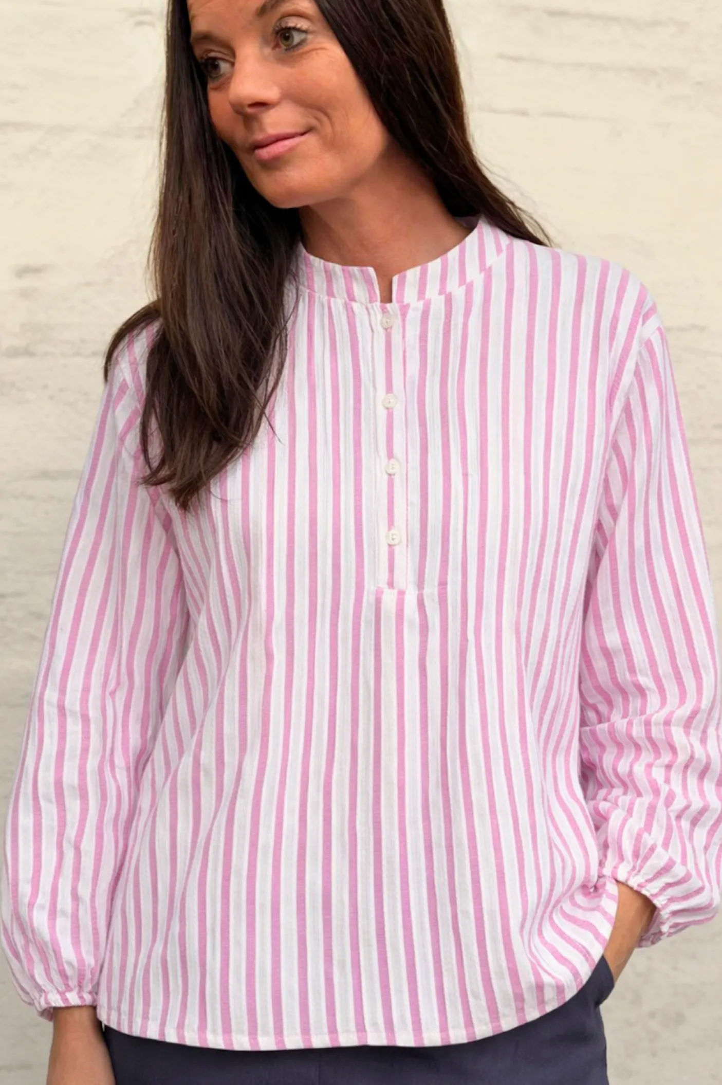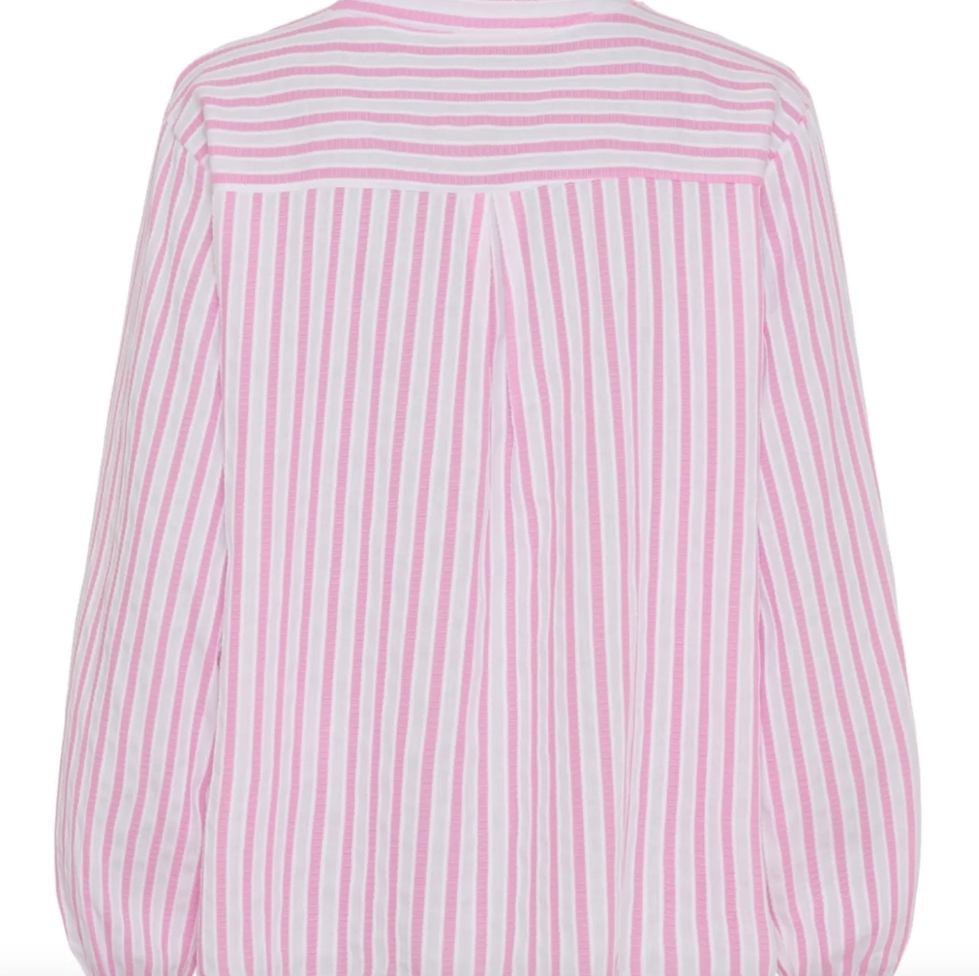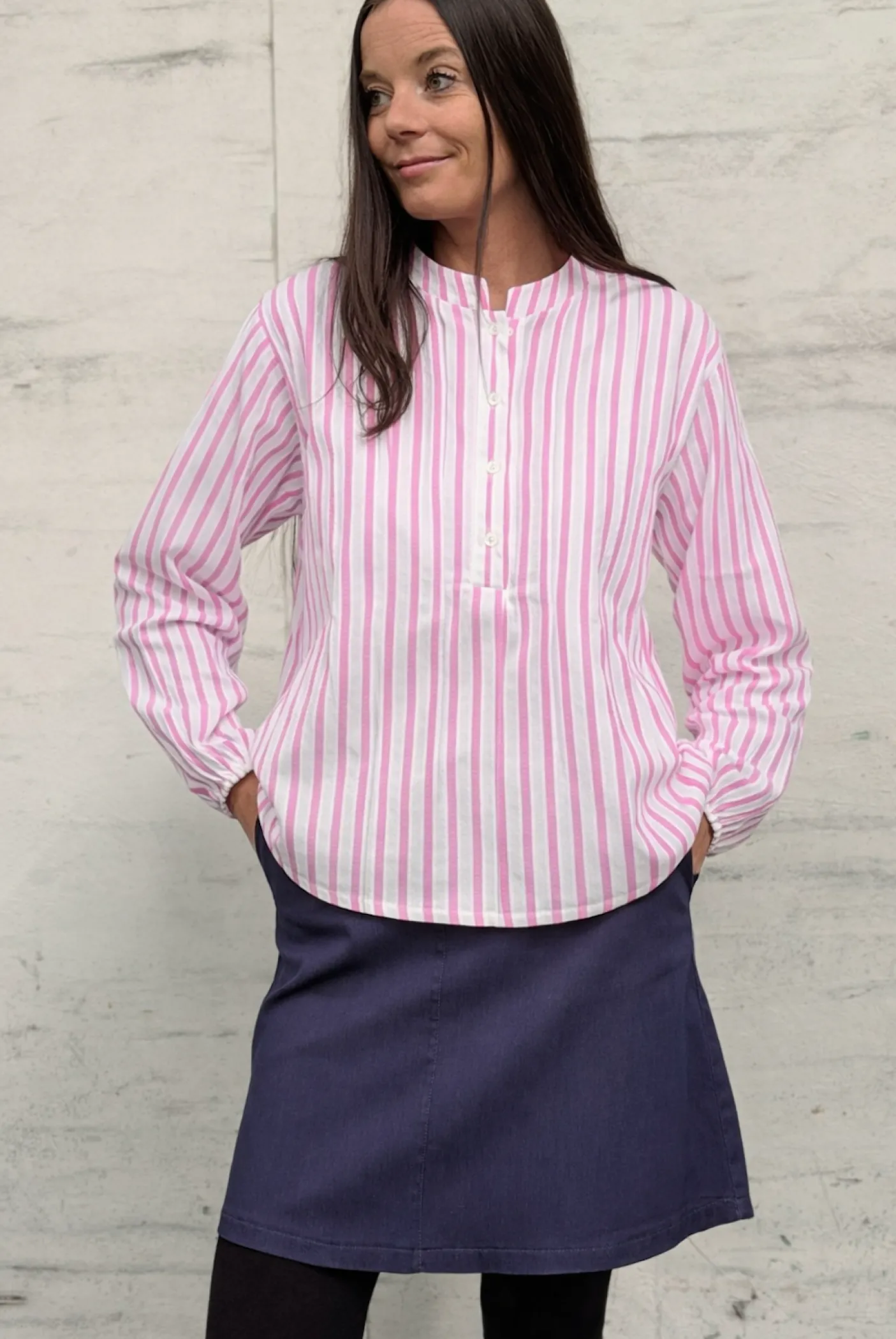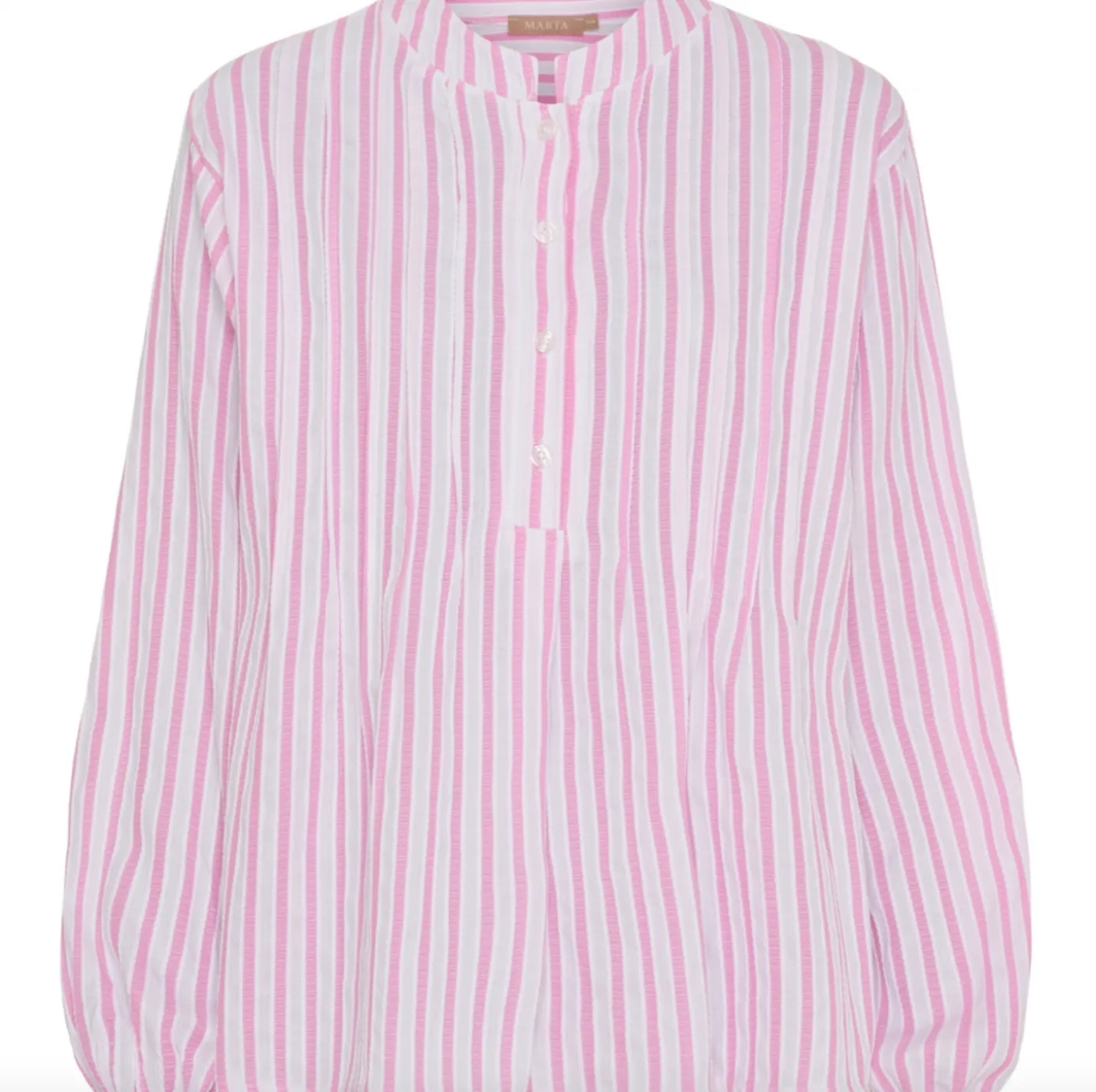 Skjortebluse med striber i et enkelt og tidsløst snit. En let overdel, der kan bæres alene eller under en jakke på kontoret. Materialet er 100% bomuld, og det stribede mønster giver et roligt, struktureret udtryk. Leveres i to størrelsesgrupper med forskellige længder for et mere afstemt fit.