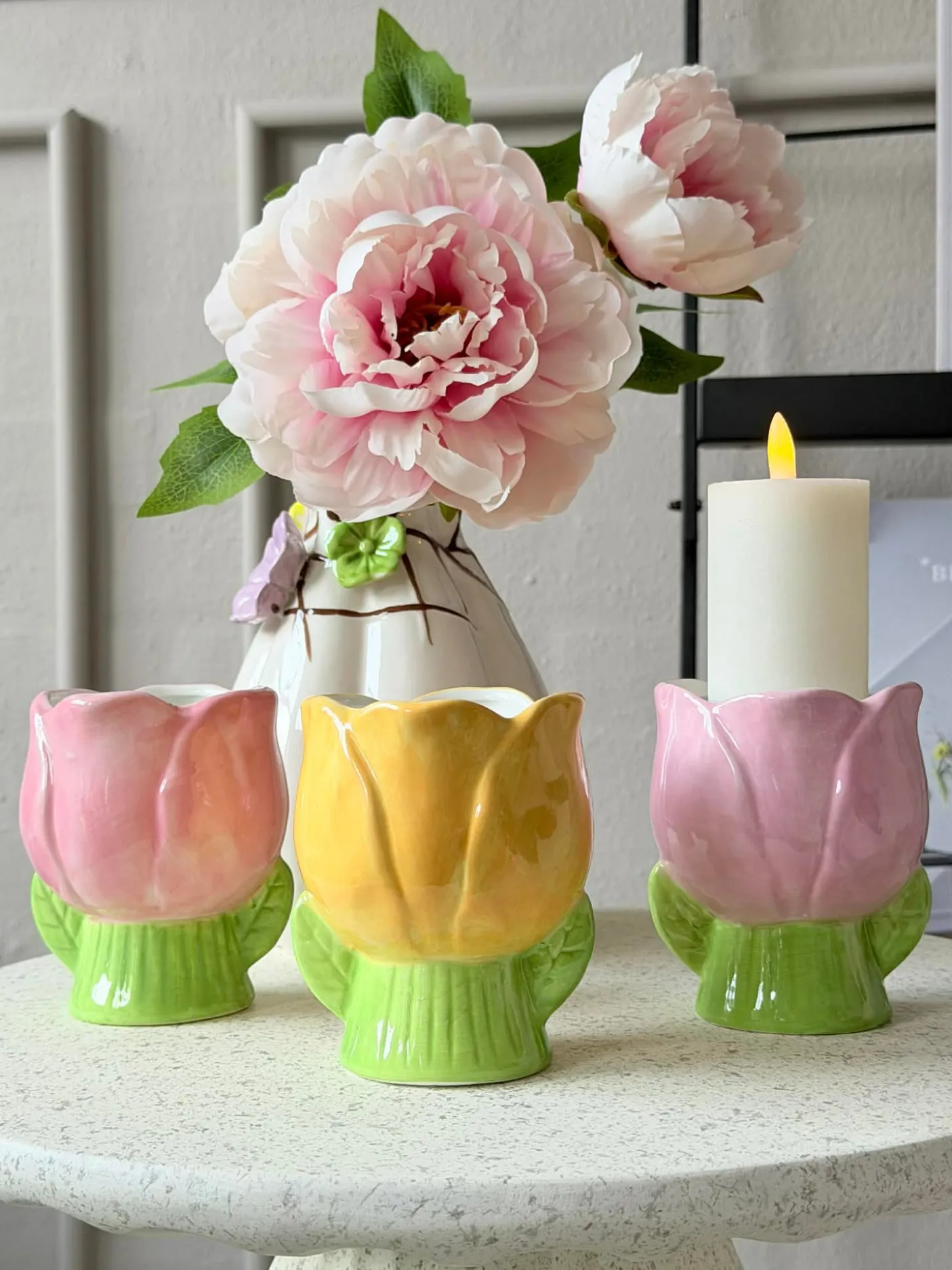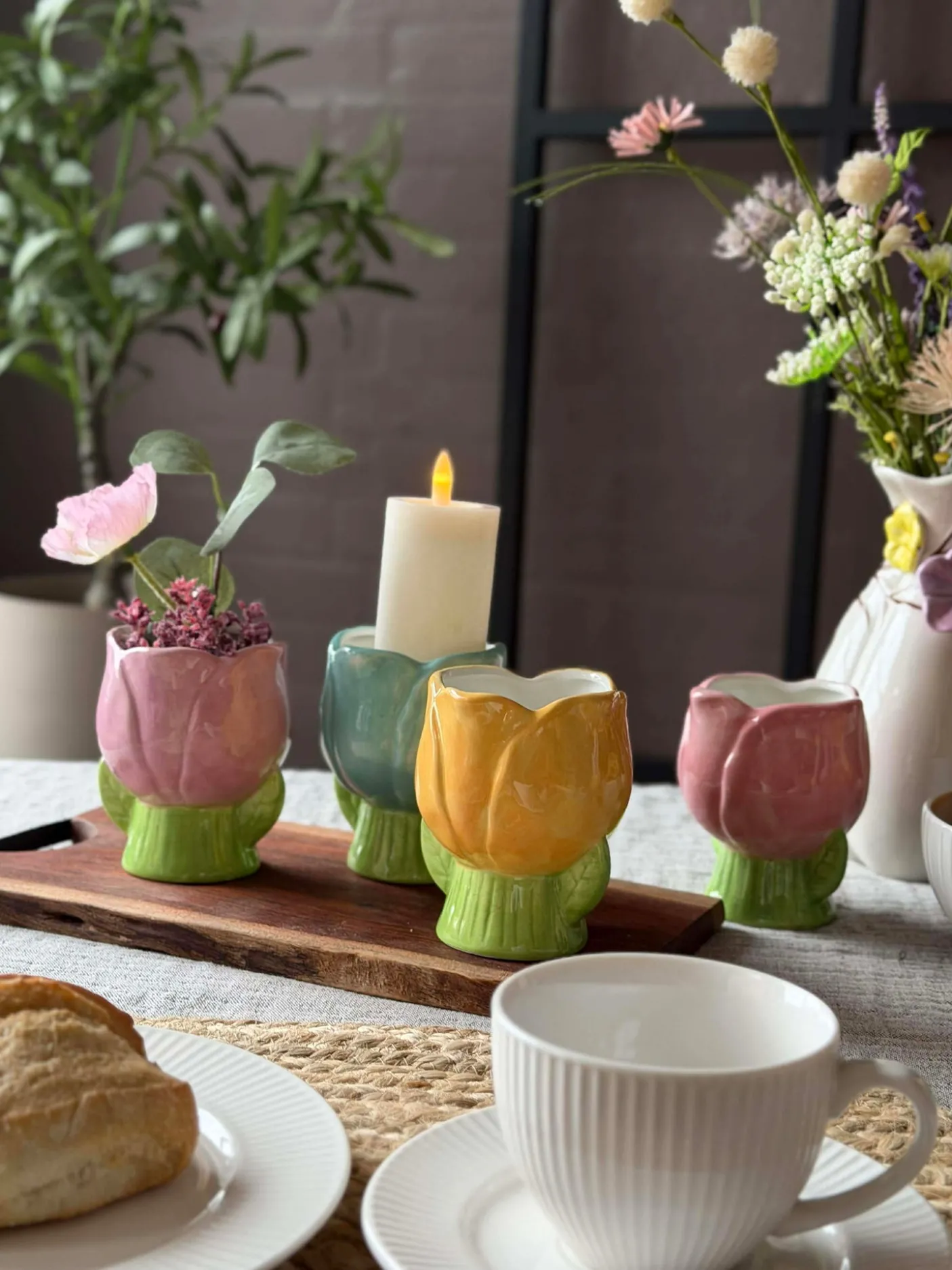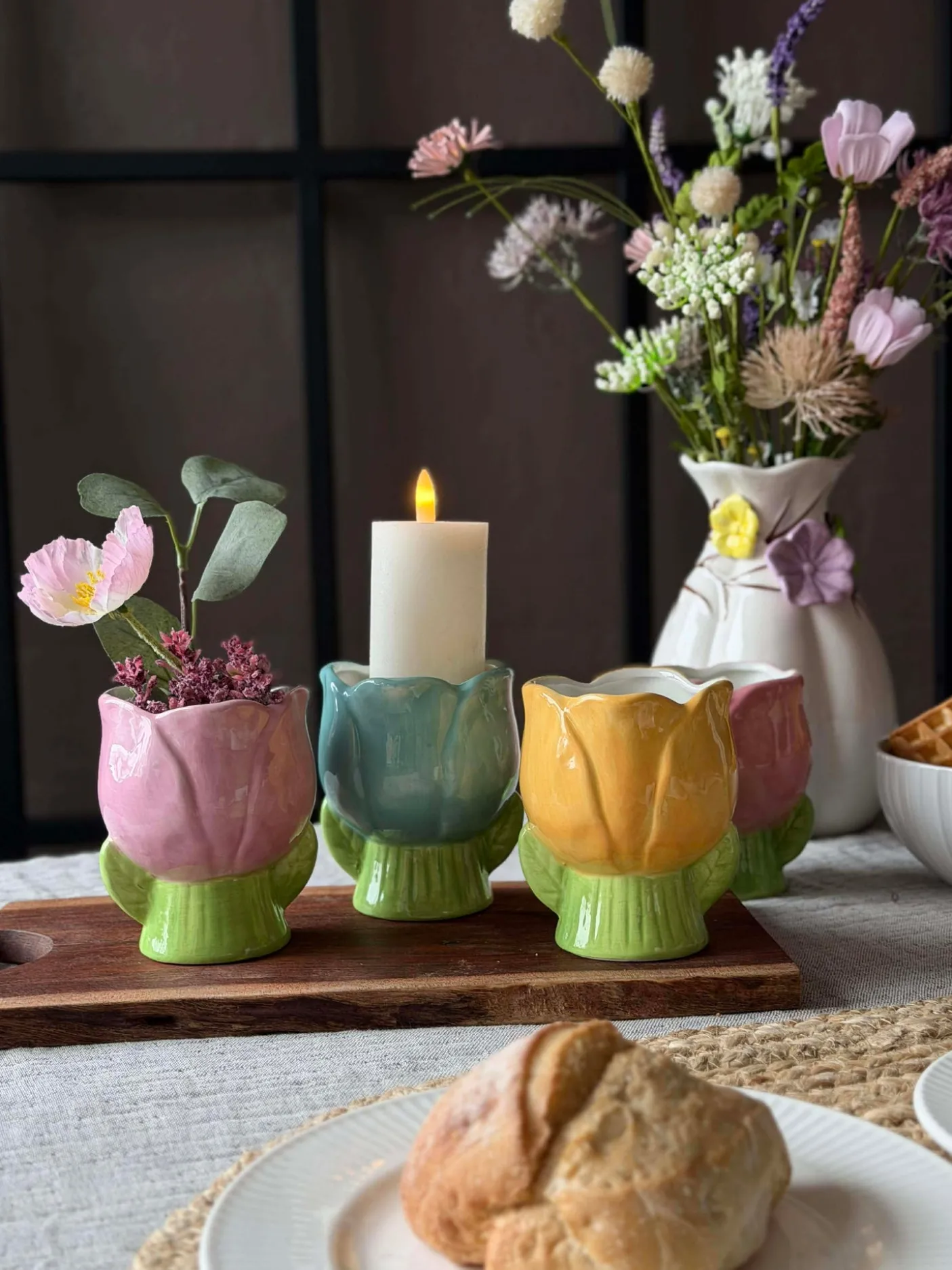 Materiale: keramik. Tulipanformen giver et blødt, dekorativt udtryk, hvor silhuetten fungerer som et lille blikfang uden at dominere rummet. Farvepaletten lægger sig i en lys, forårsagtig tone, der kan skabe subtil farveeffekt i både køkken og stue.