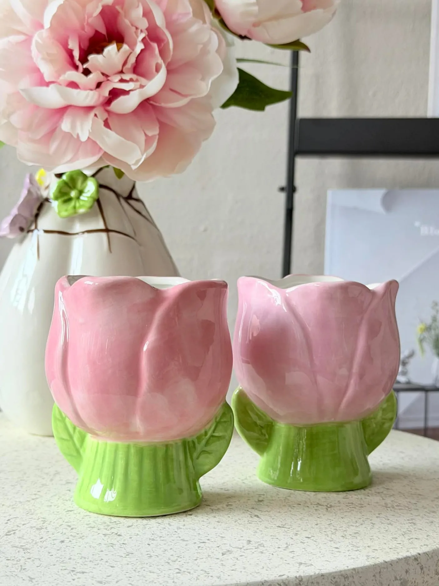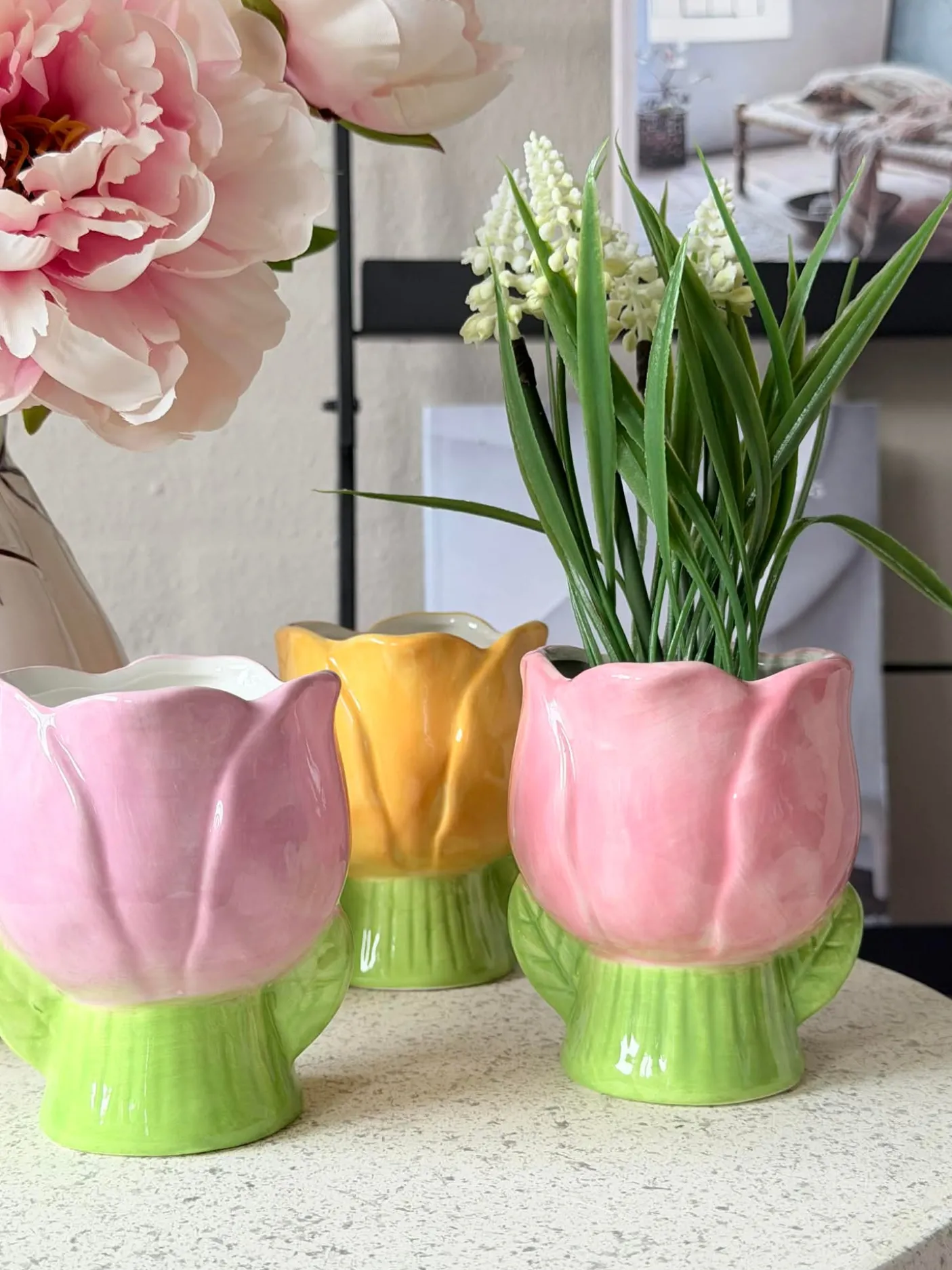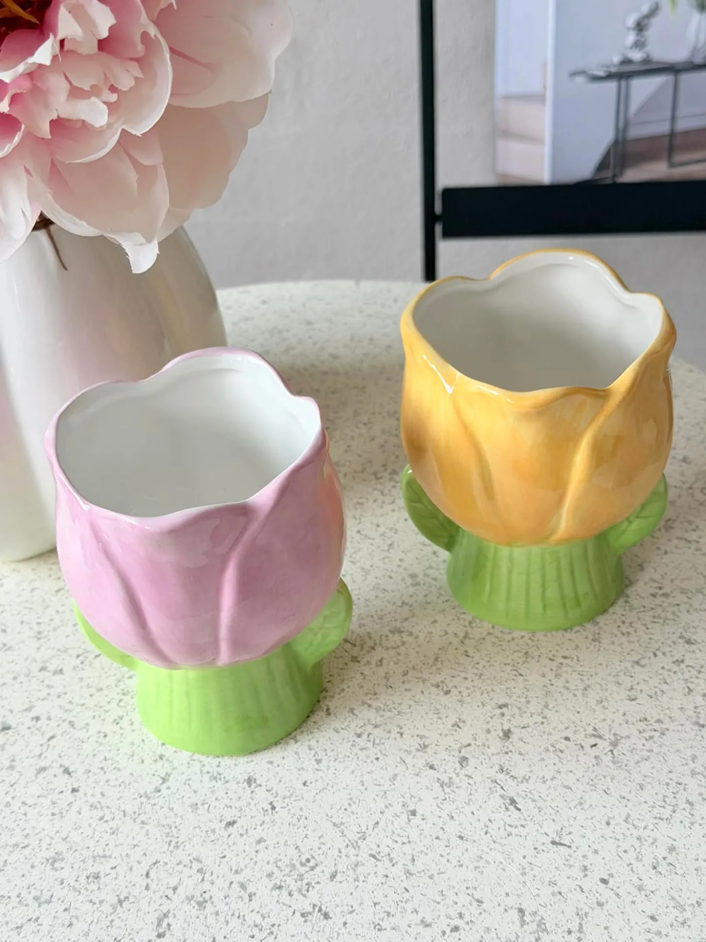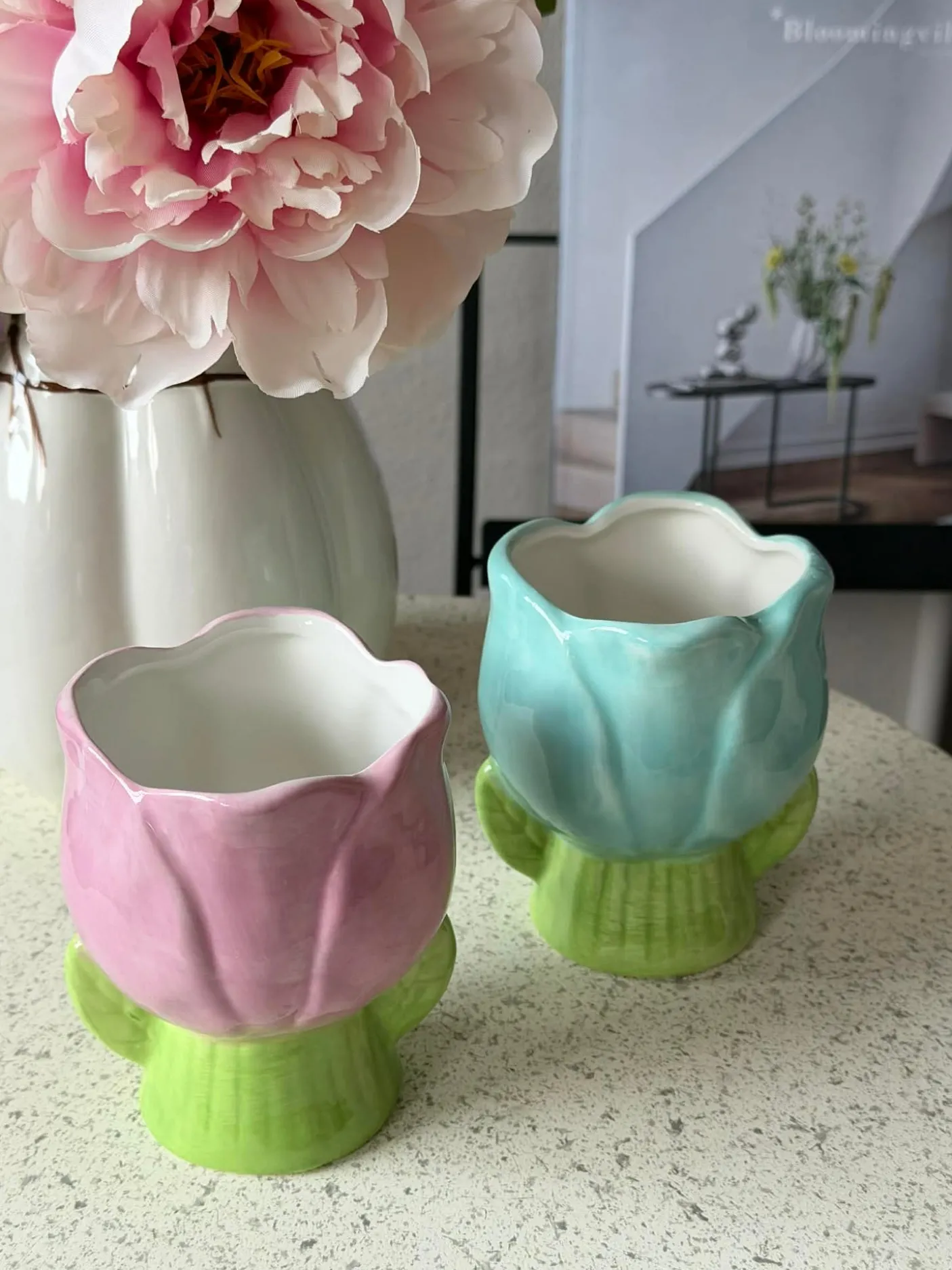 Materiale: keramik. Tulipanformen giver et blødt, dekorativt udtryk, hvor silhuetten fungerer som et lille blikfang uden at dominere rummet. Farvepaletten lægger sig i en lys, forårsagtig tone, der kan skabe subtil farveeffekt i både køkken og stue.