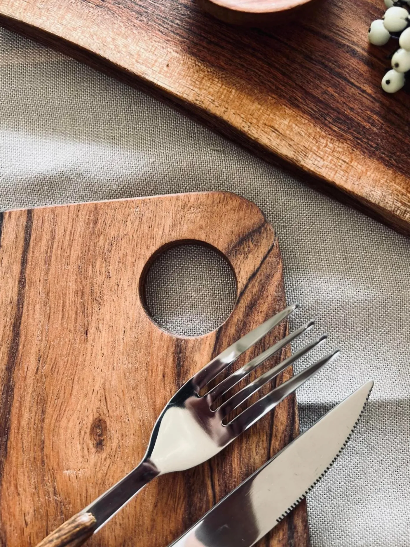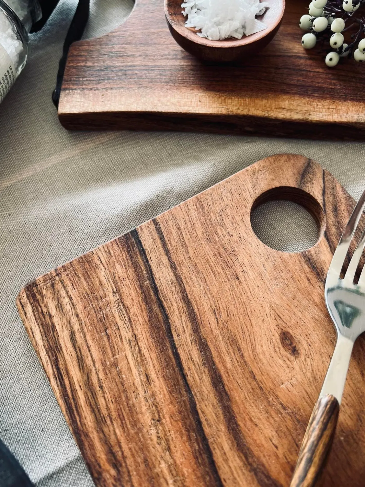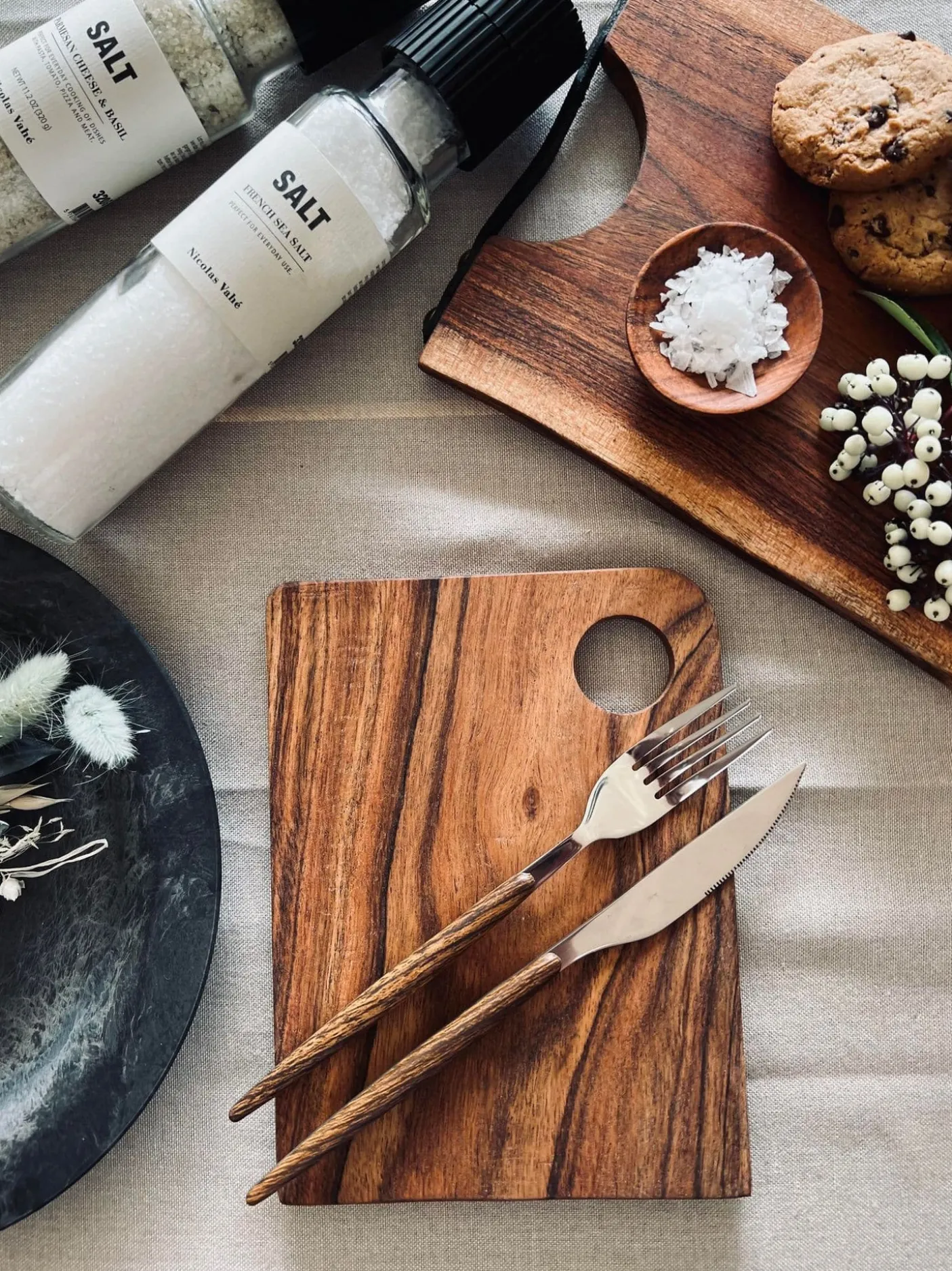 Smørrebrættet er i naturfarvet akacietræ med en olieret finish, der fremhæver træets struktur.