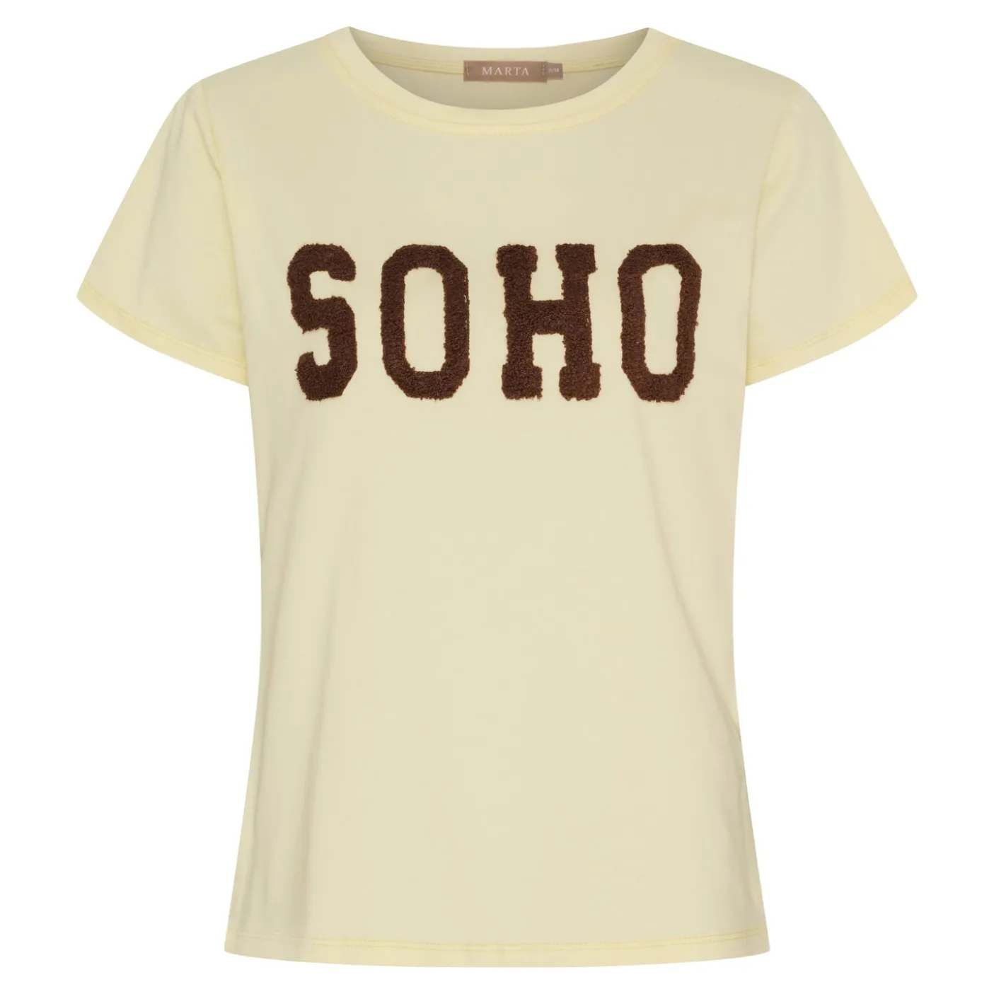 Skønneste T-shirt fra Marta i Yellow / Moro udført i 100% bomuld. En enkel, kortærmet overdel der fungerer som en grundlæggende del af garderoben, tilgængelig i to størrelser (S/M og L/XL). Farven Yellow / Moro giver et klart og karakterfuldt udtryk uden at tage fokus fra resten af outfittet.