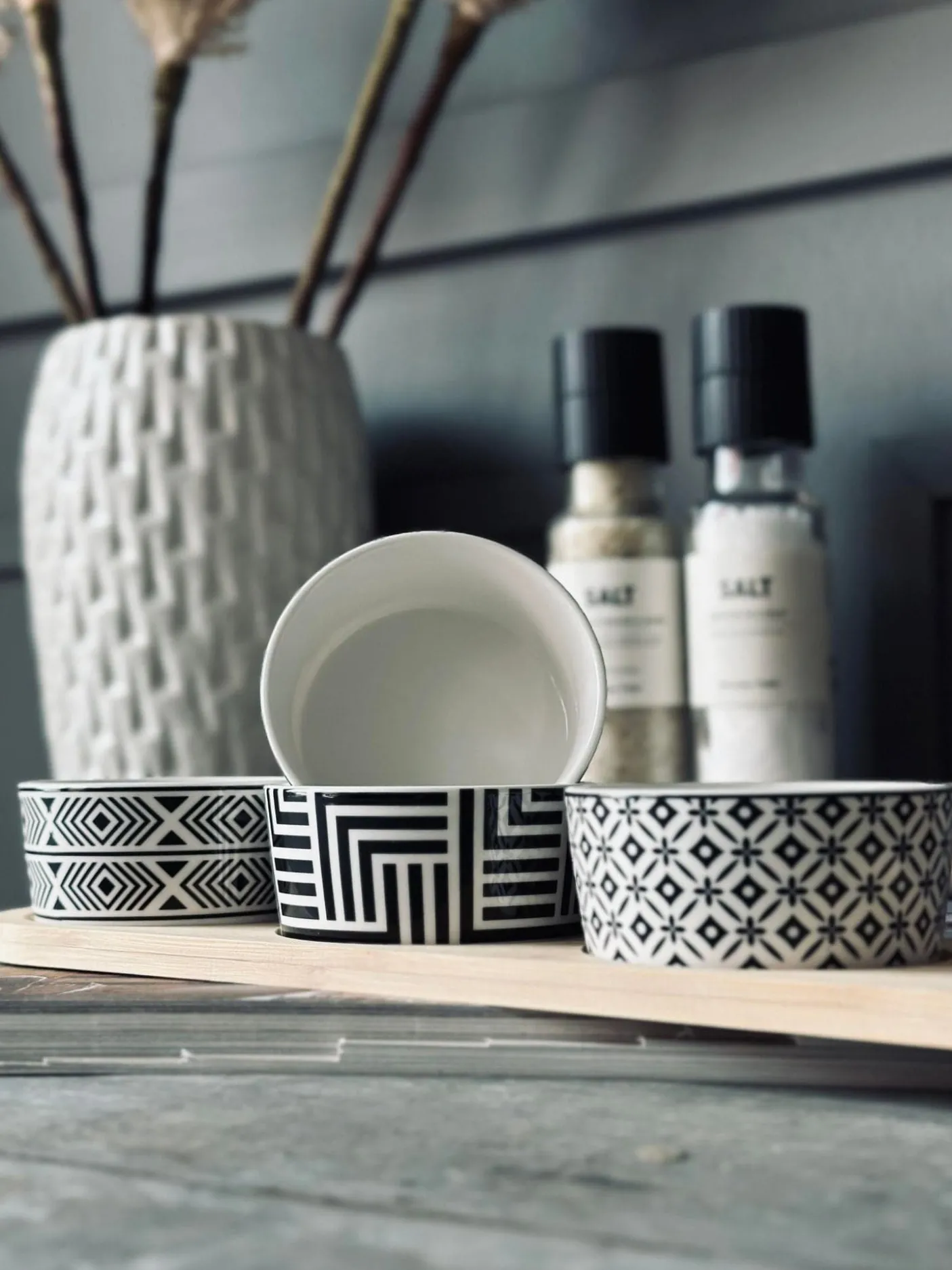 Skåle og bakke er udført i porcelæn i en hvid farve med grafisk/geometrisk mønster.