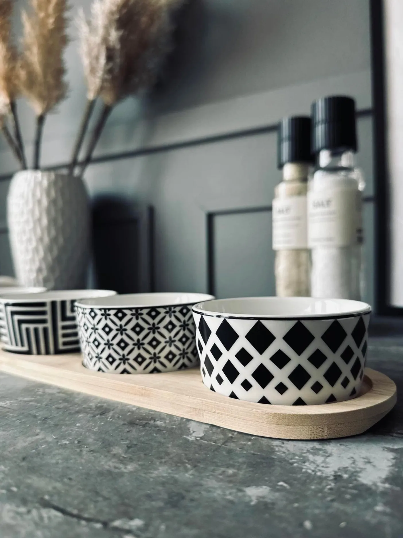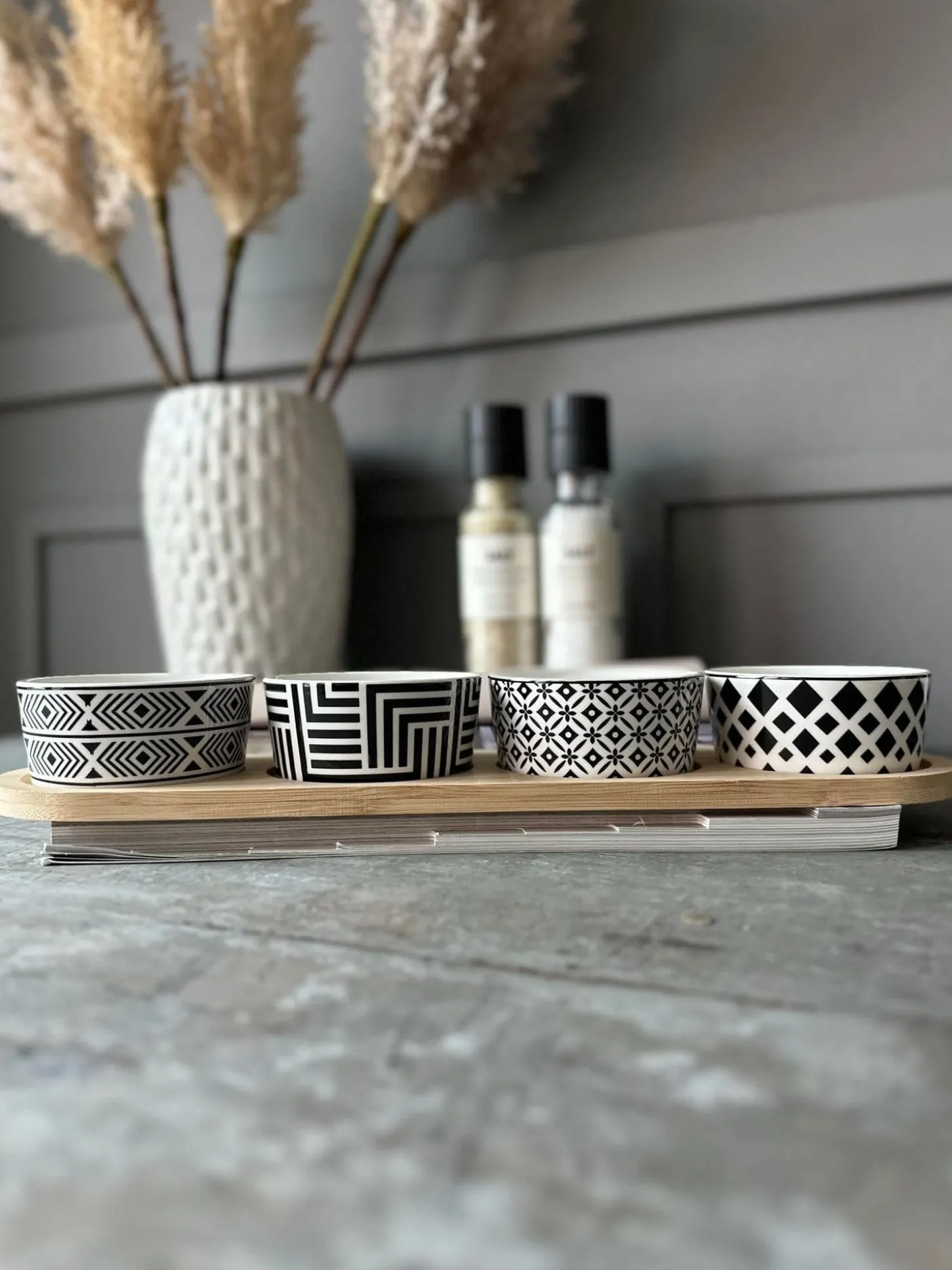 Et fint tapas-sæt med firkantet bakke og 4 matchende skåle i hvid porcelæn. Det grafiske/geometriske mønster giver et enkelt, moderne udtryk, der passer flot til servering af små anretninger.