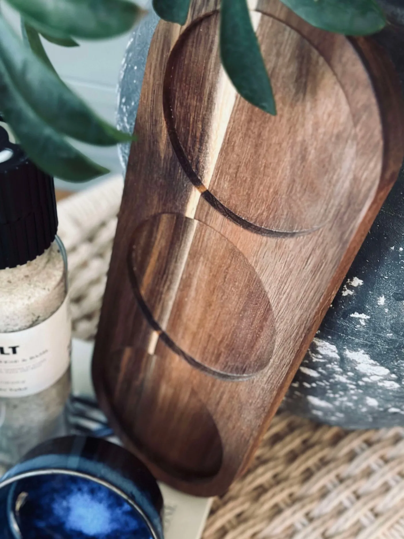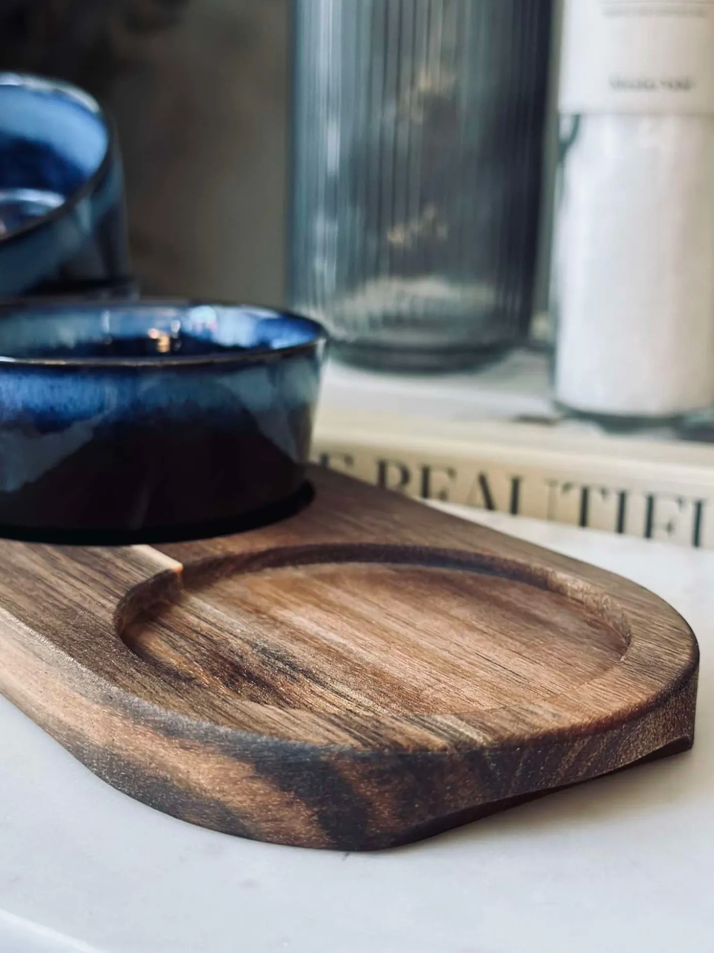 Skålene er i ensfarvet blåt stentøj, som giver et enkelt og sammenhængende look på bordet. Bakken er i bambus og skaber en fin kontrast til det blå stentøj.