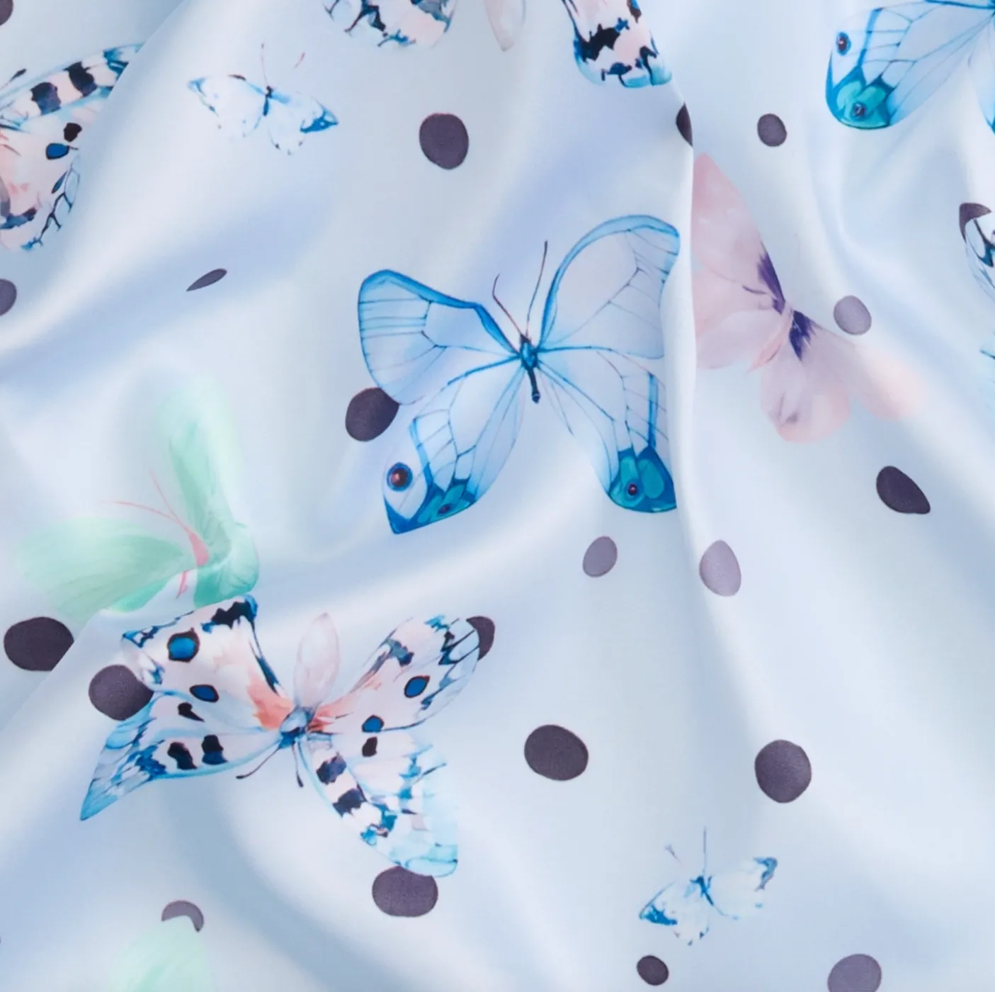 Tørklædet er fremstillet i 100% polyester. Det blå farvespil kombineret med det trykte mønster skaber et levende udtryk, hvor shine-detaljen tilfører en let, elegant finish.
