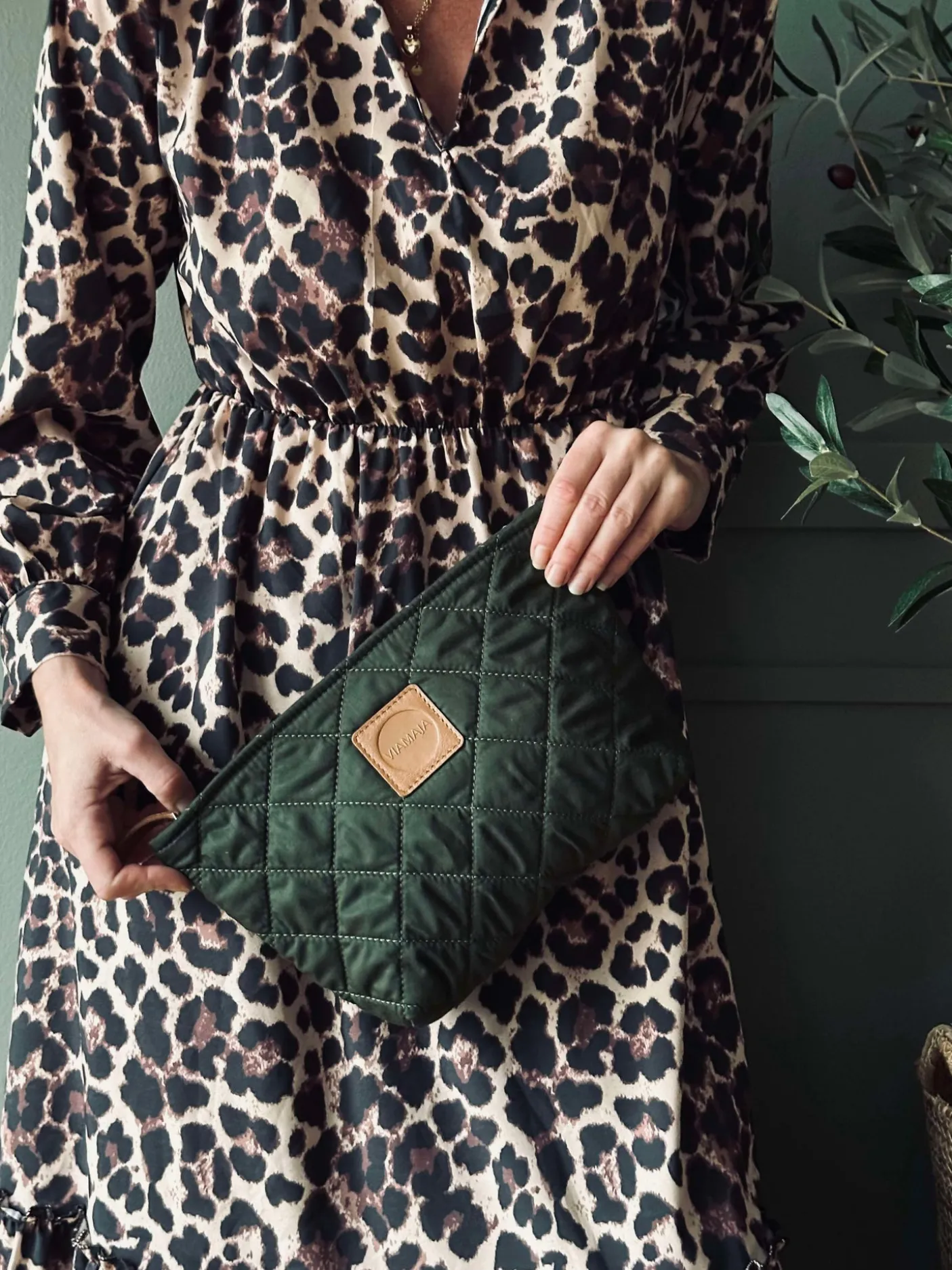 Grøn bomuld og cognac læder.