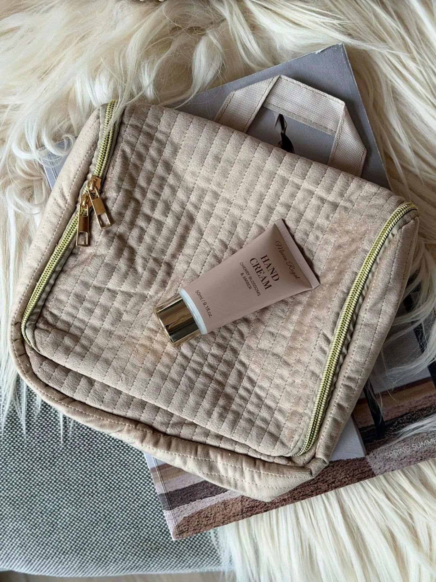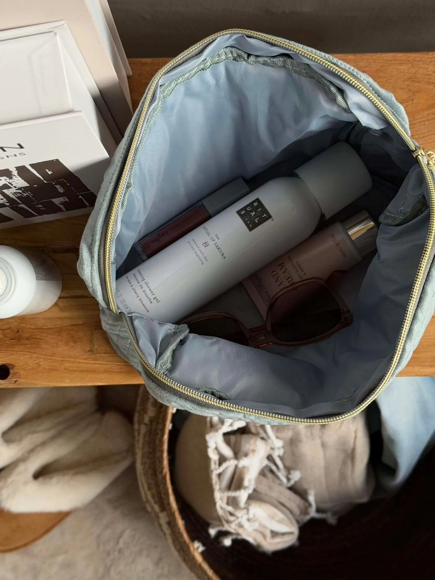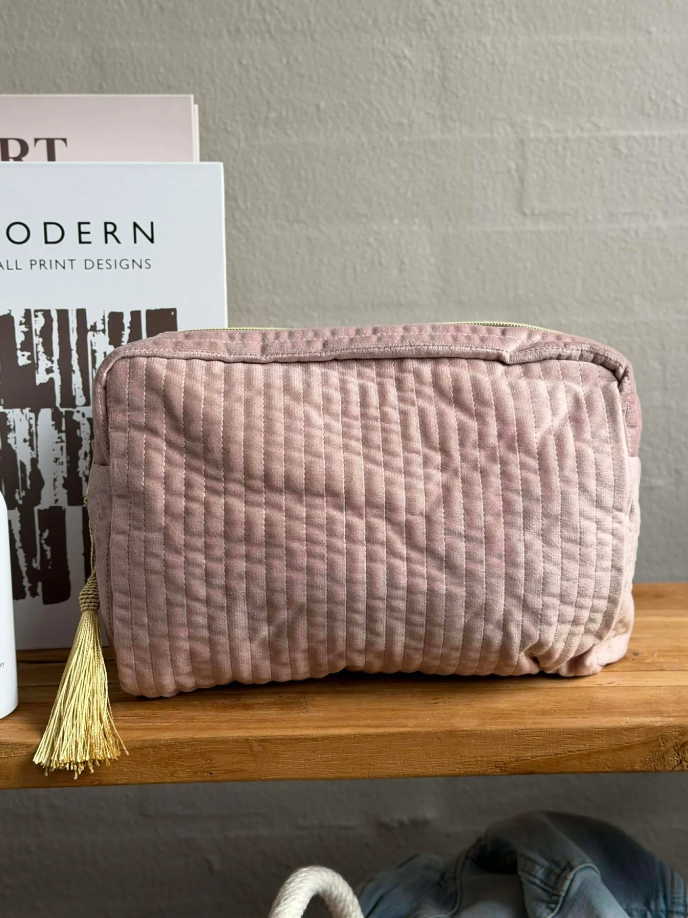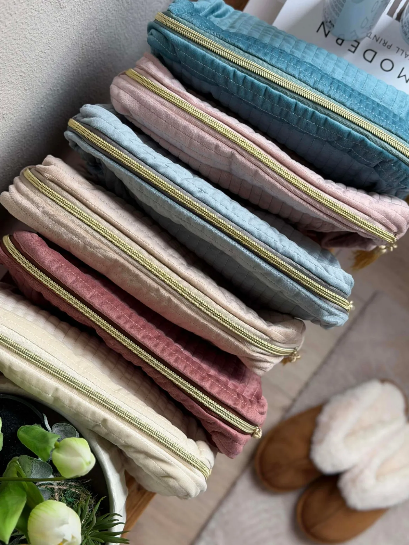Toilettaske Gia er en blød toilettaske til opbevaring af toiletartikler på rejse eller i hjemmet. Udført i babyfløjl med målene L 26cm x H 20cm x D 7cm. Tilkøb evt. rejsetasken der matcher.