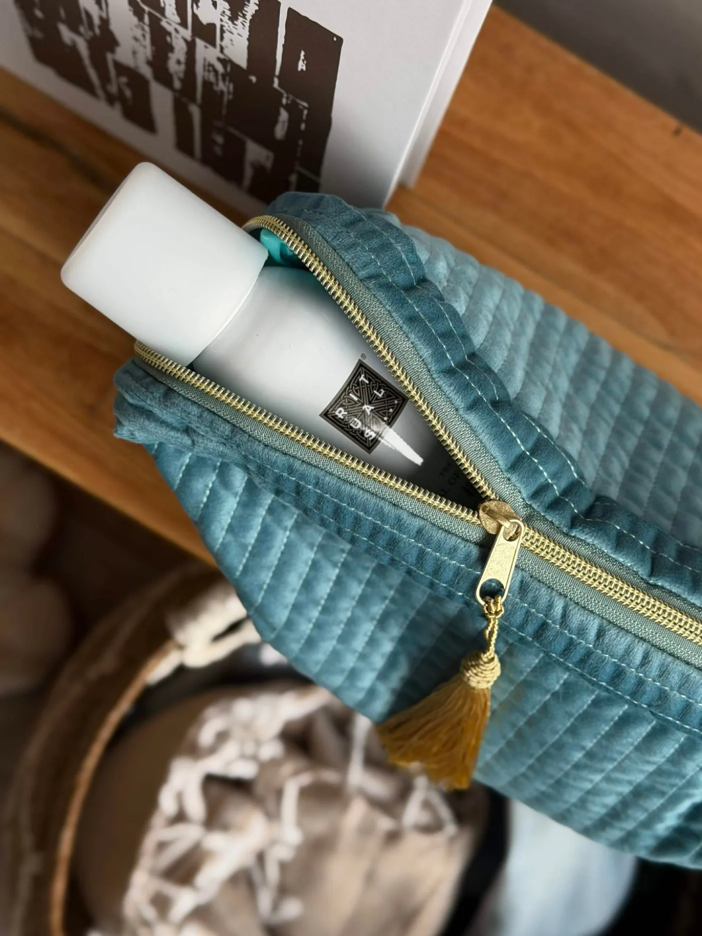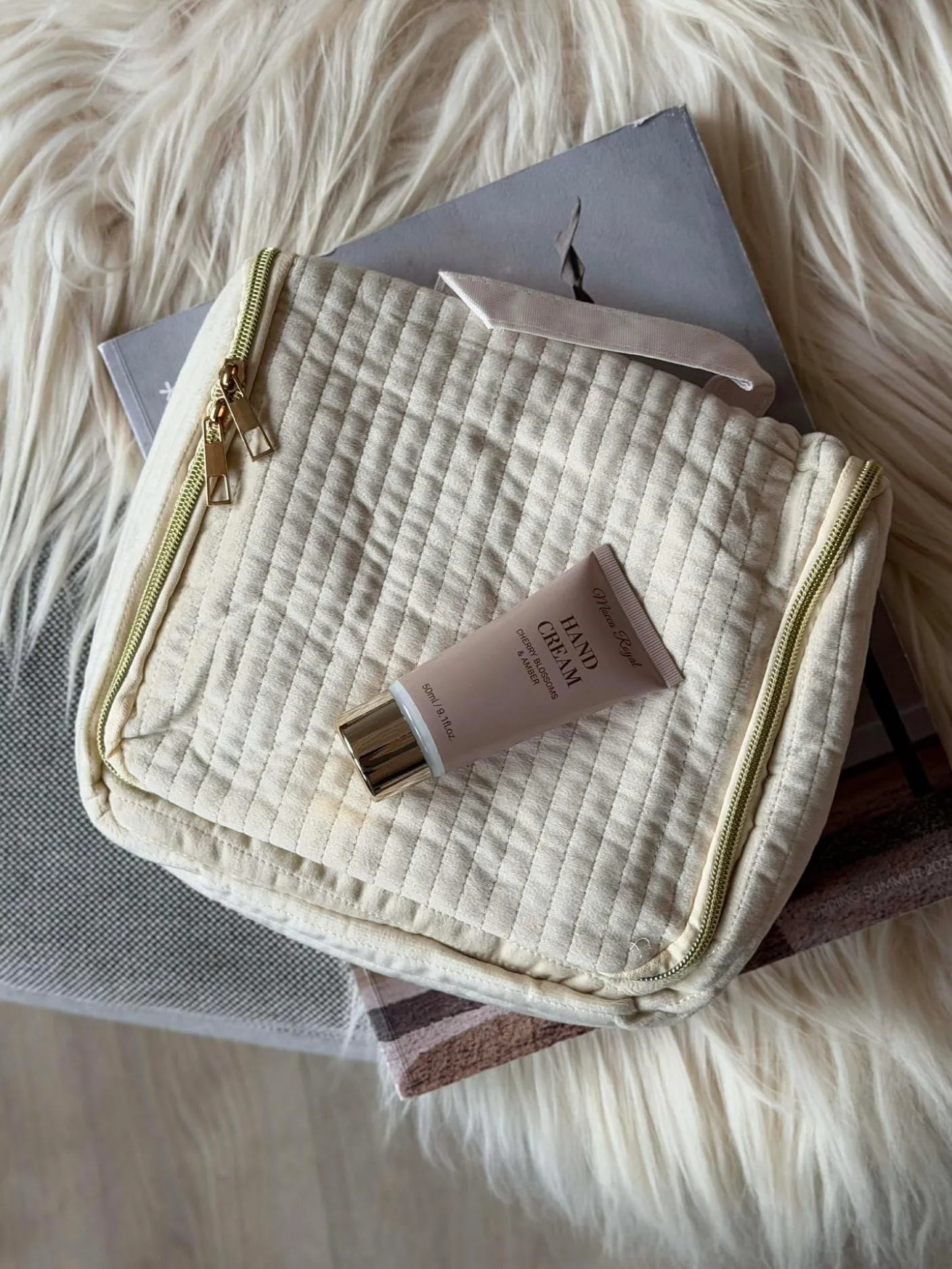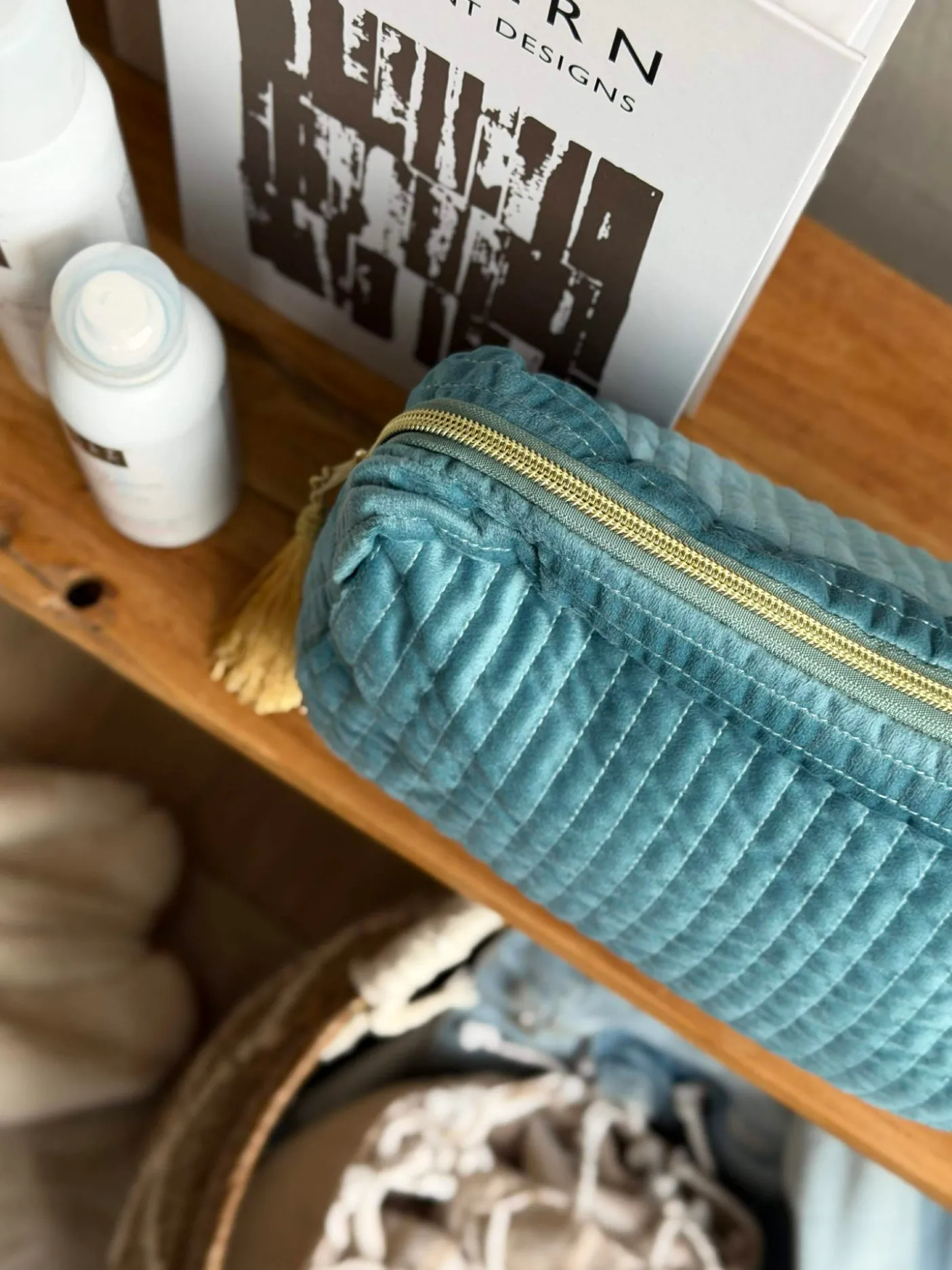 Toilettaske Gia er en blød toilettaske til opbevaring af toiletartikler på rejse eller i hjemmet. Udført i babyfløjl med målene L 26cm x H 20cm x D 7cm. Tilkøb evt. rejsetasken der matcher.