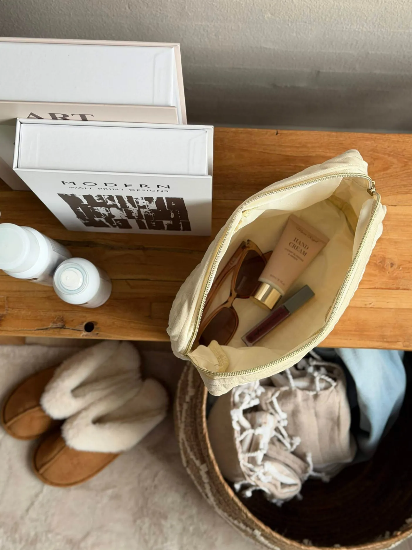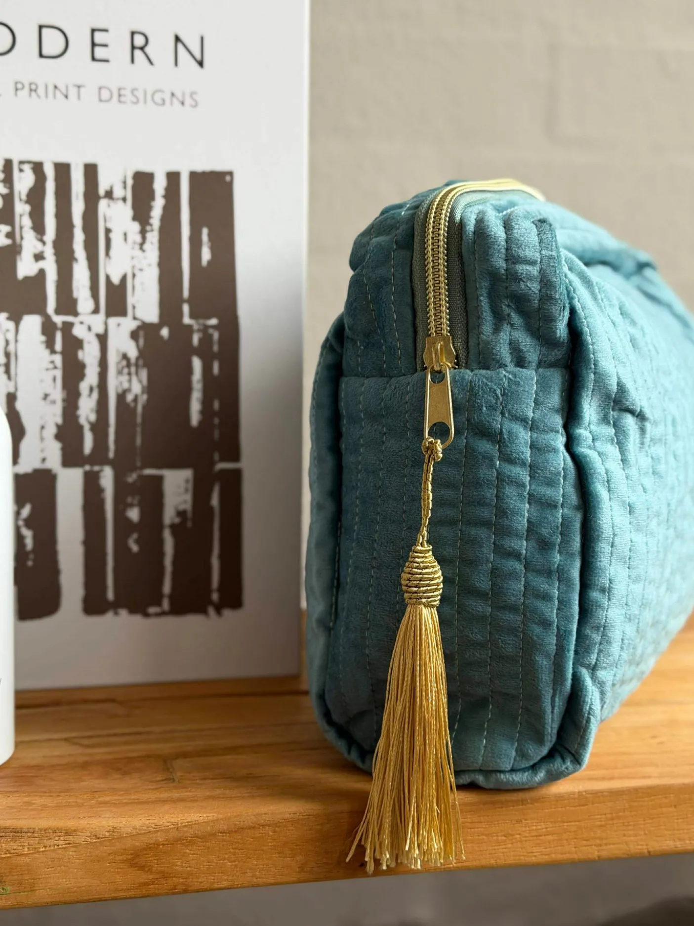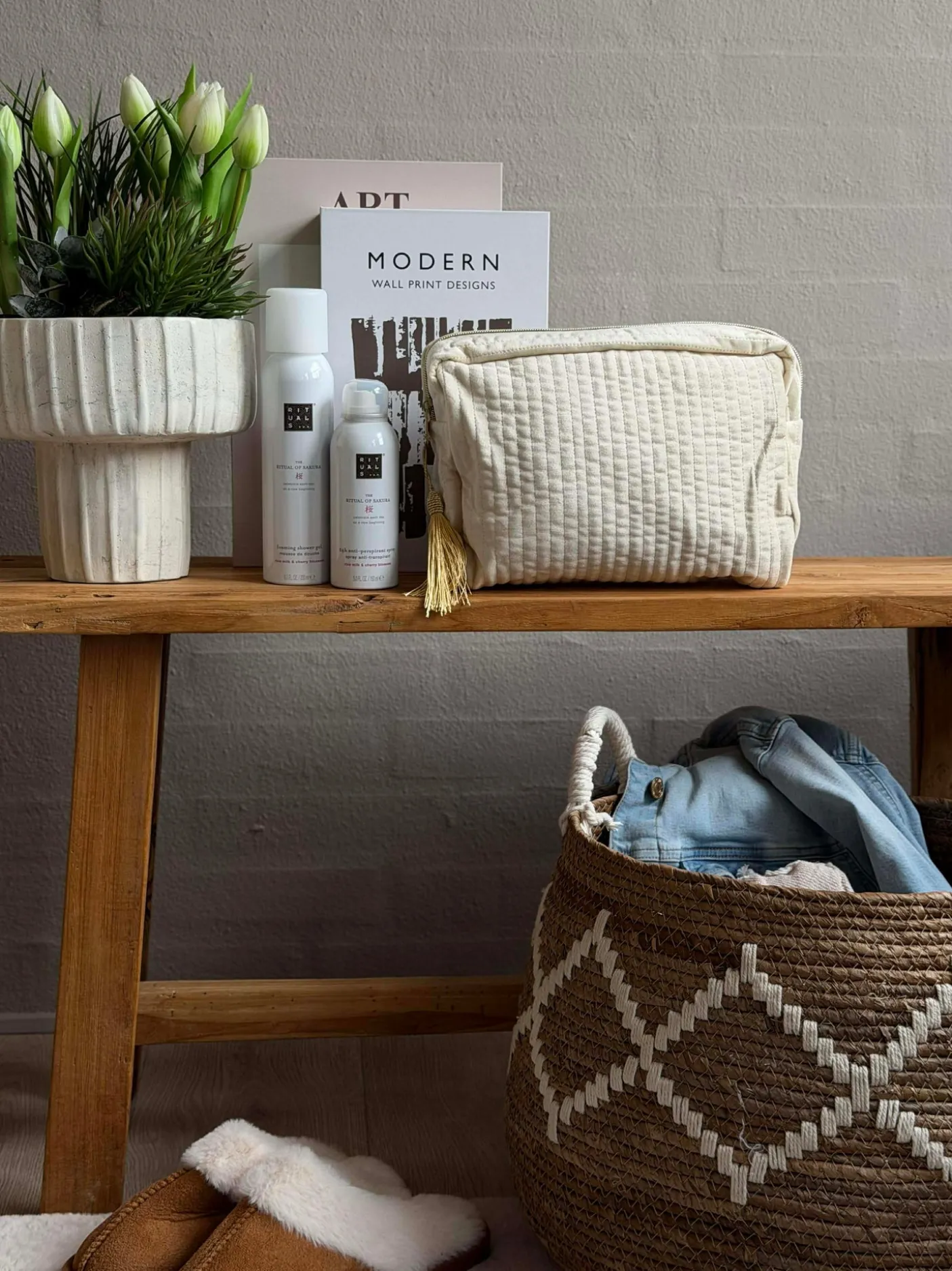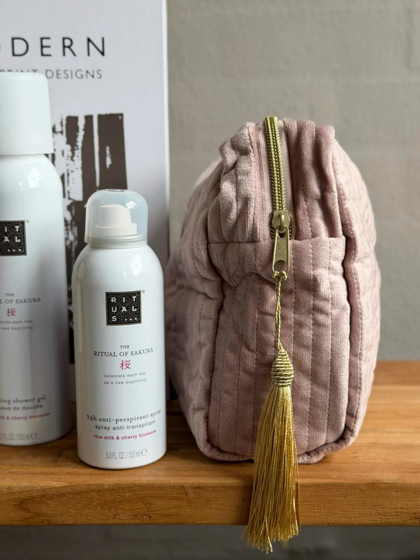 Toilettaske Gia er en blød toilettaske til opbevaring af toiletartikler på rejse eller i hjemmet. Udført i babyfløjl med målene L 26cm x H 20cm x D 7cm. Tilkøb evt. rejsetasken der matcher.