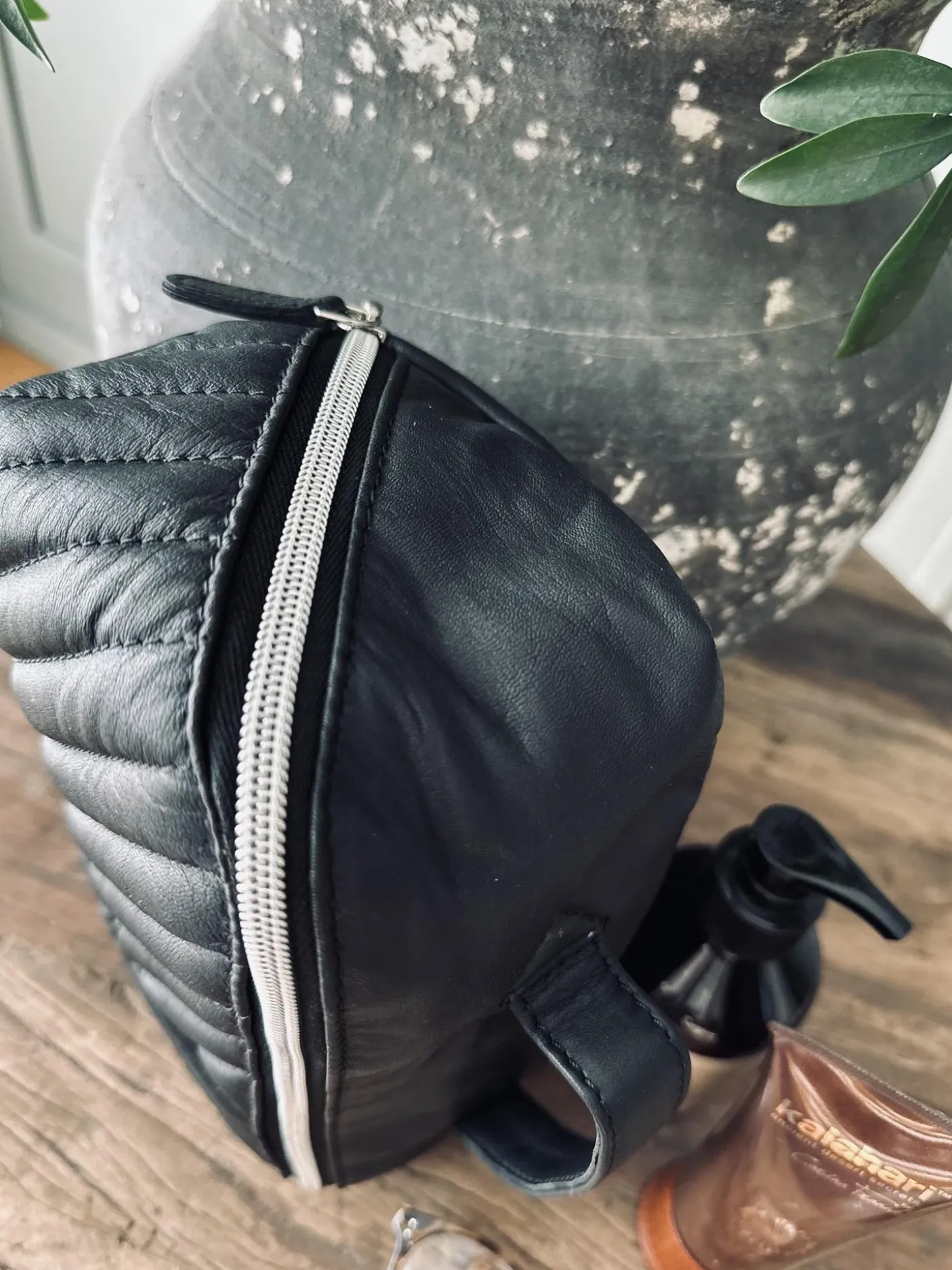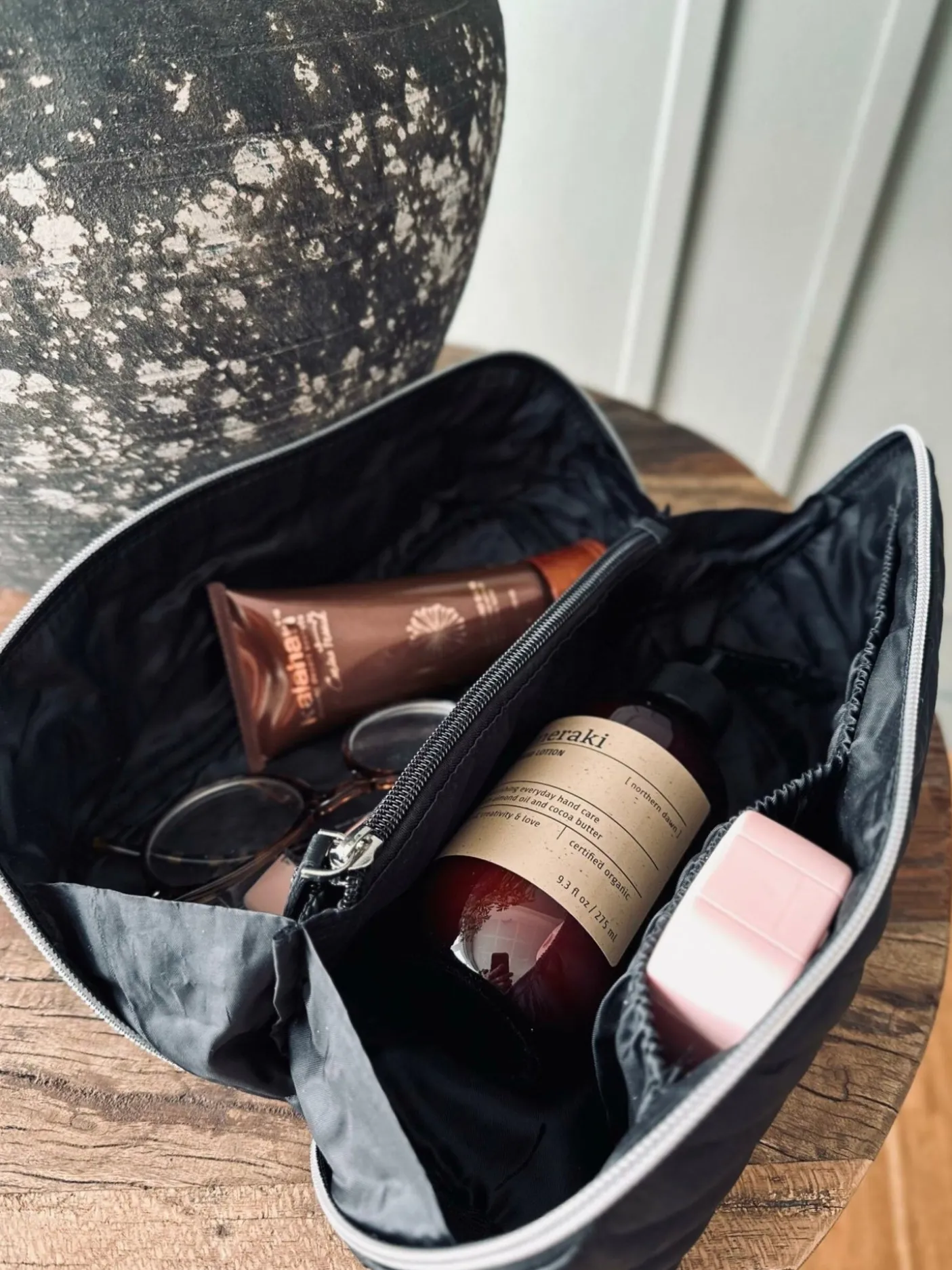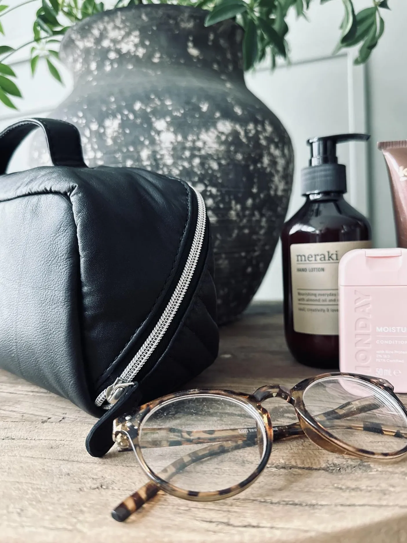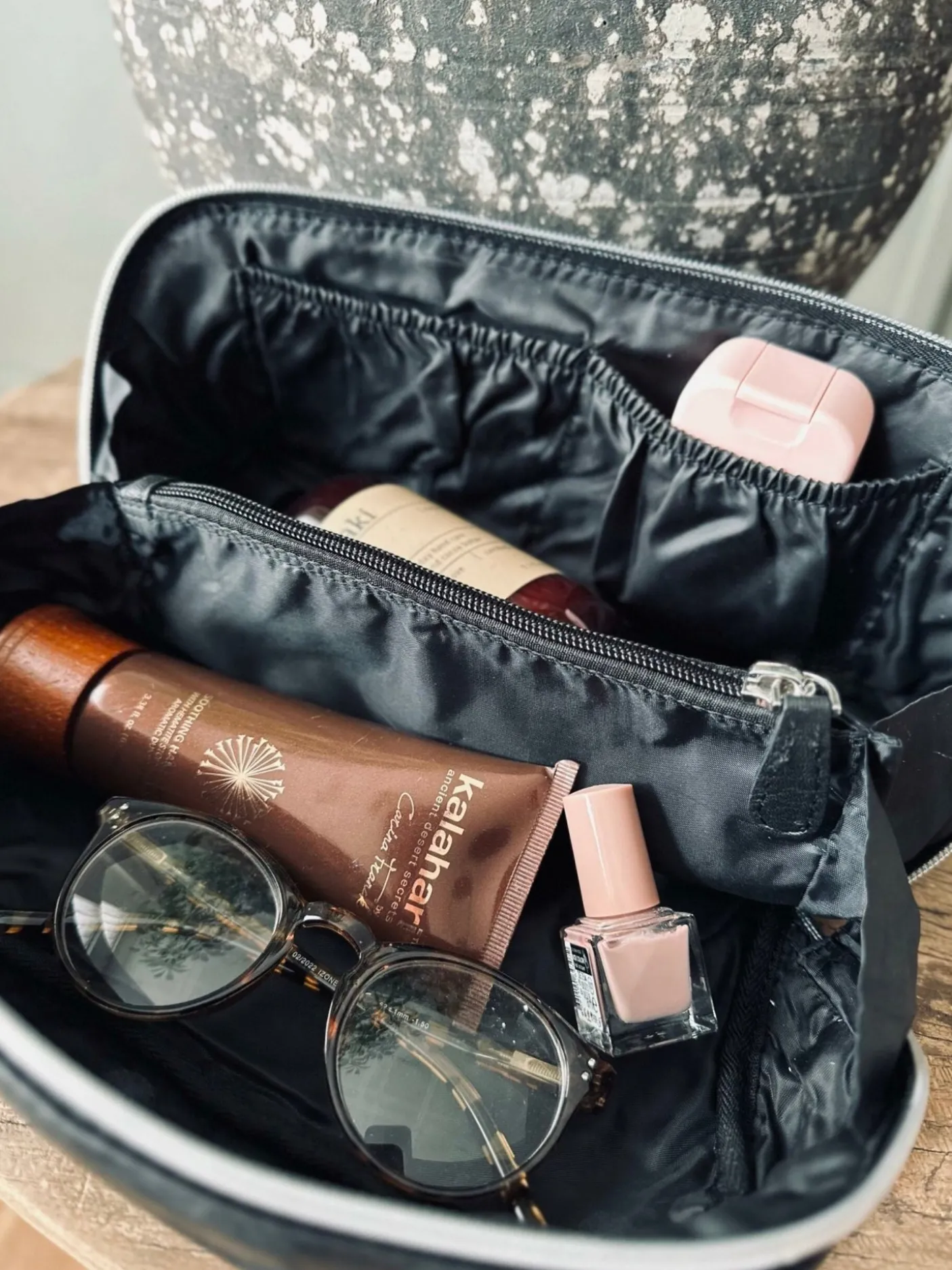 Toilettasken har opdelt rum, som gør indholdet mere overskueligt.