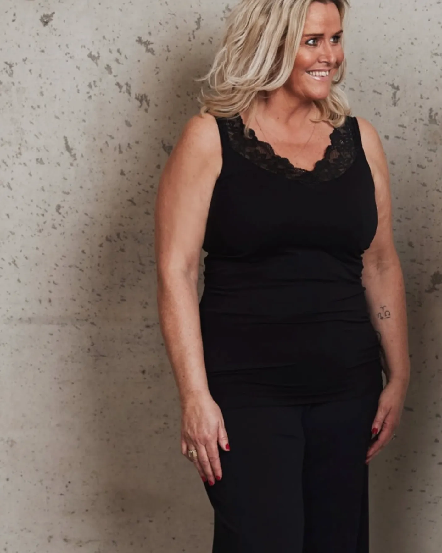 Rib top med blonde ned i V. Toppen kan vendes, så V-udskæringen er på ryggen.