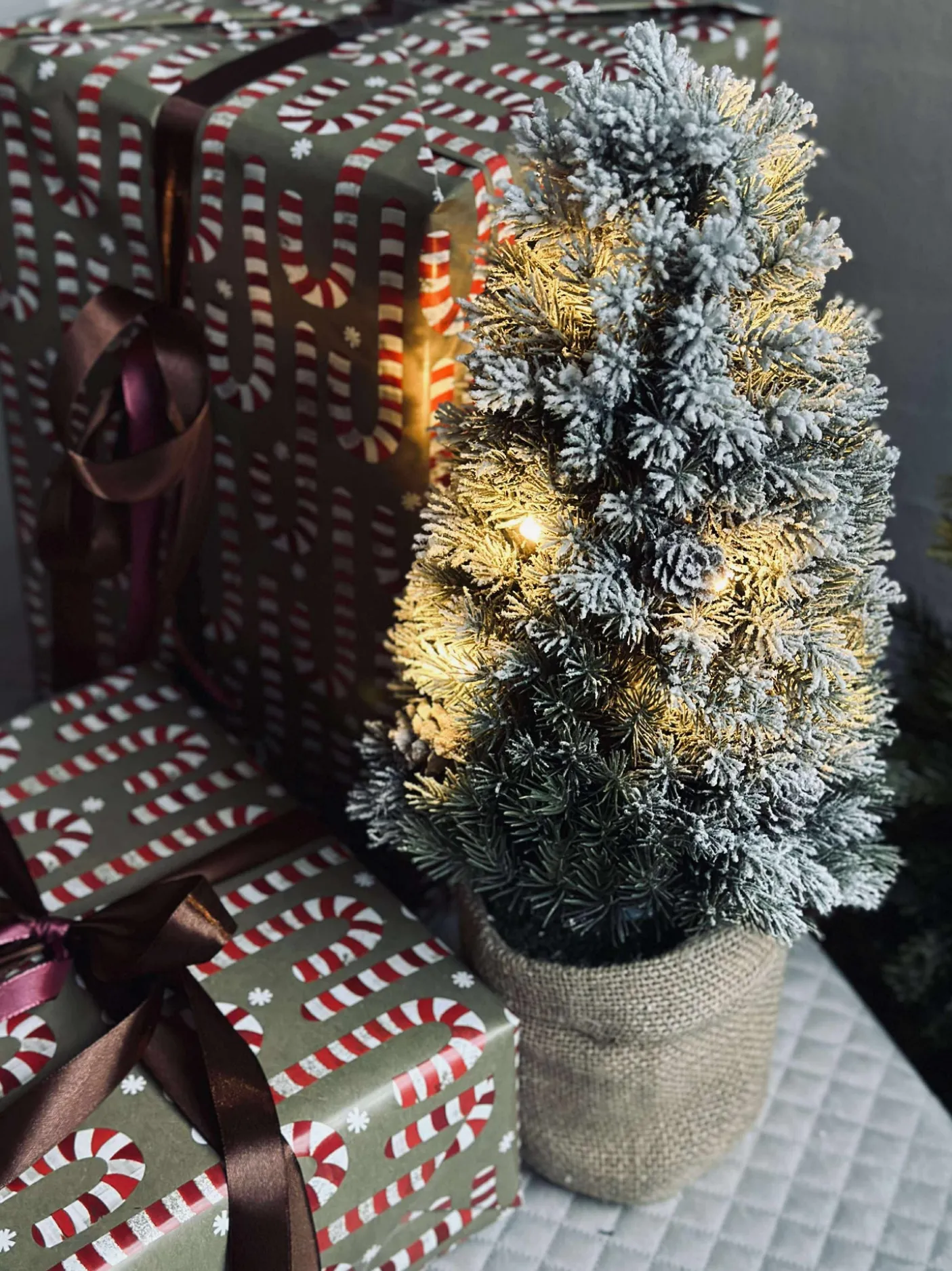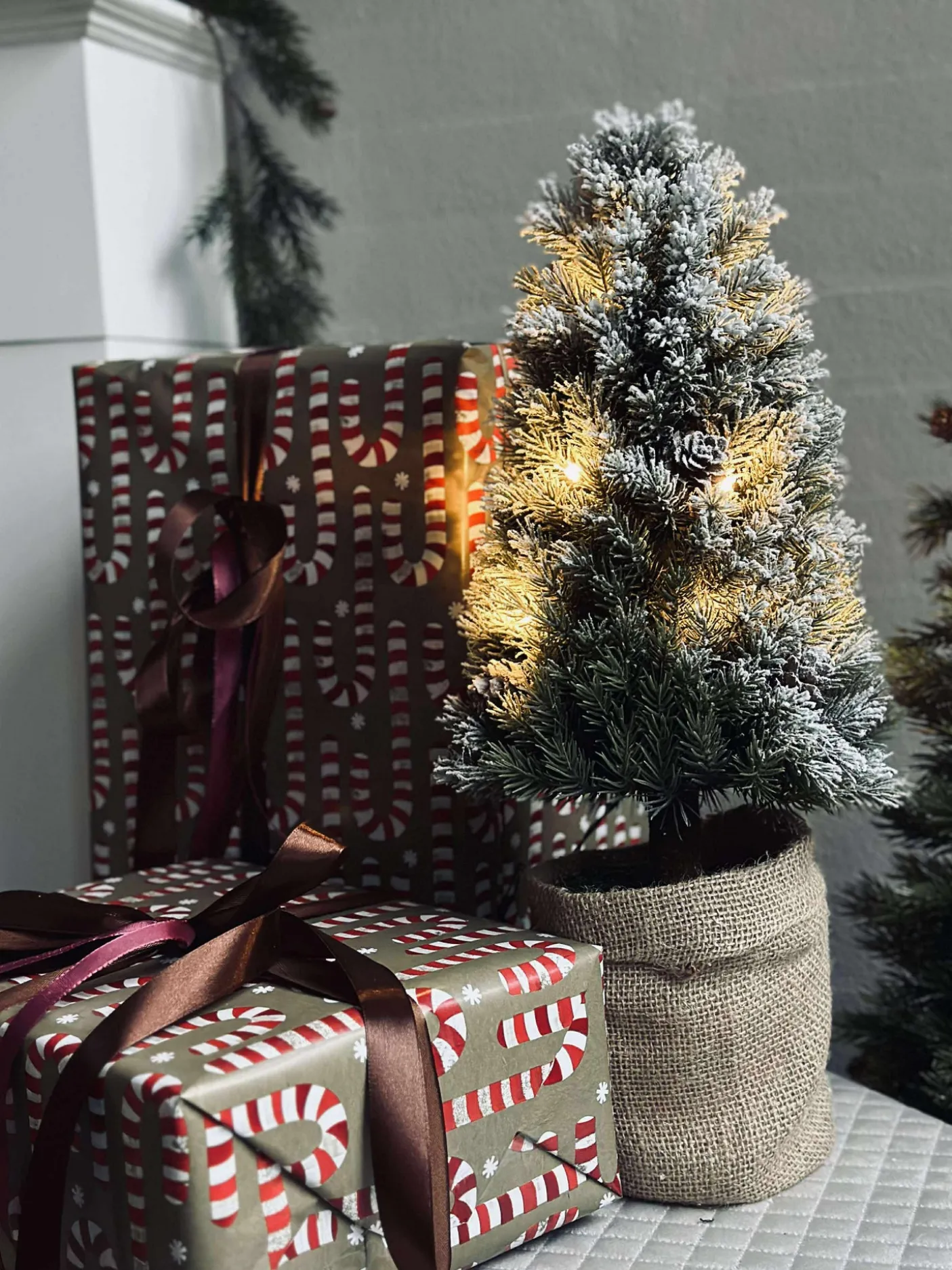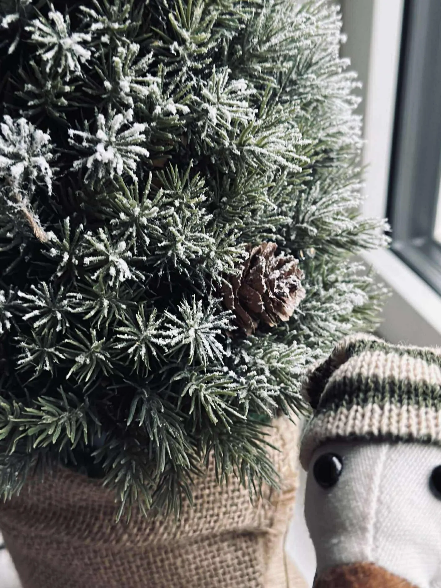 Fineste træ med små kogler og potte med jute.