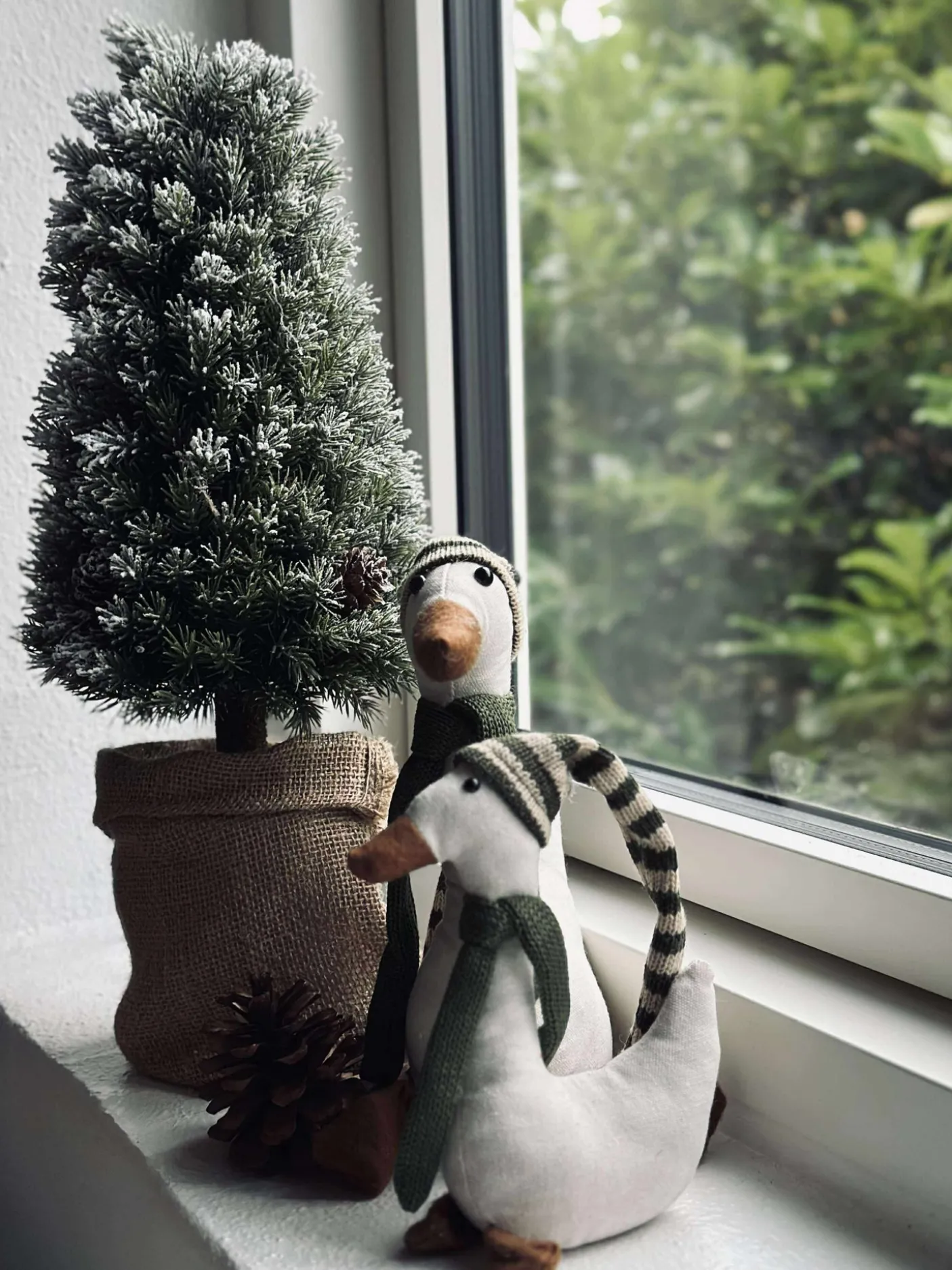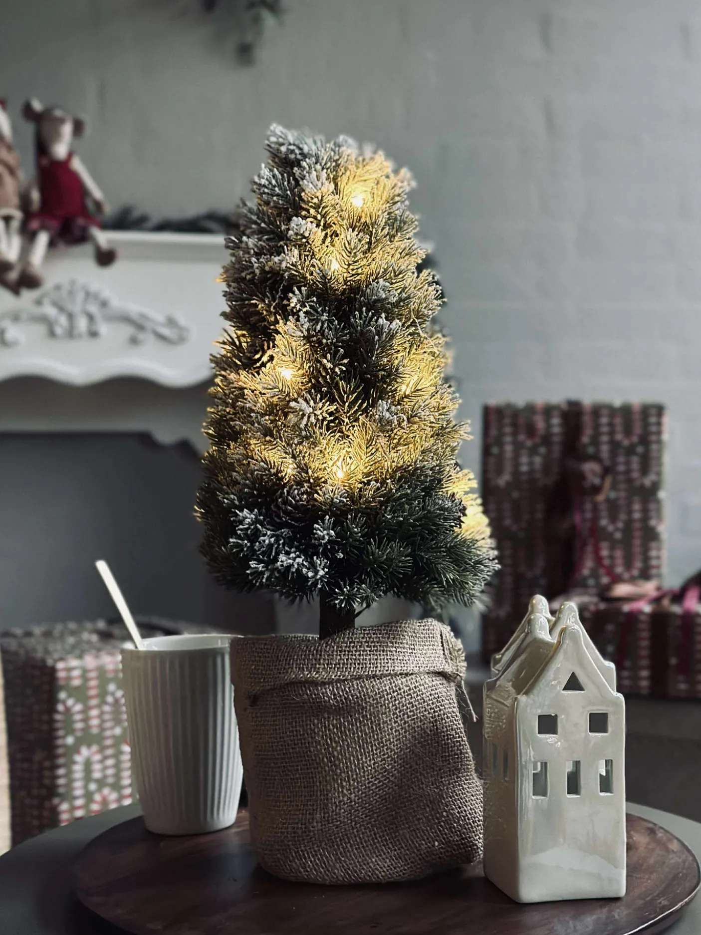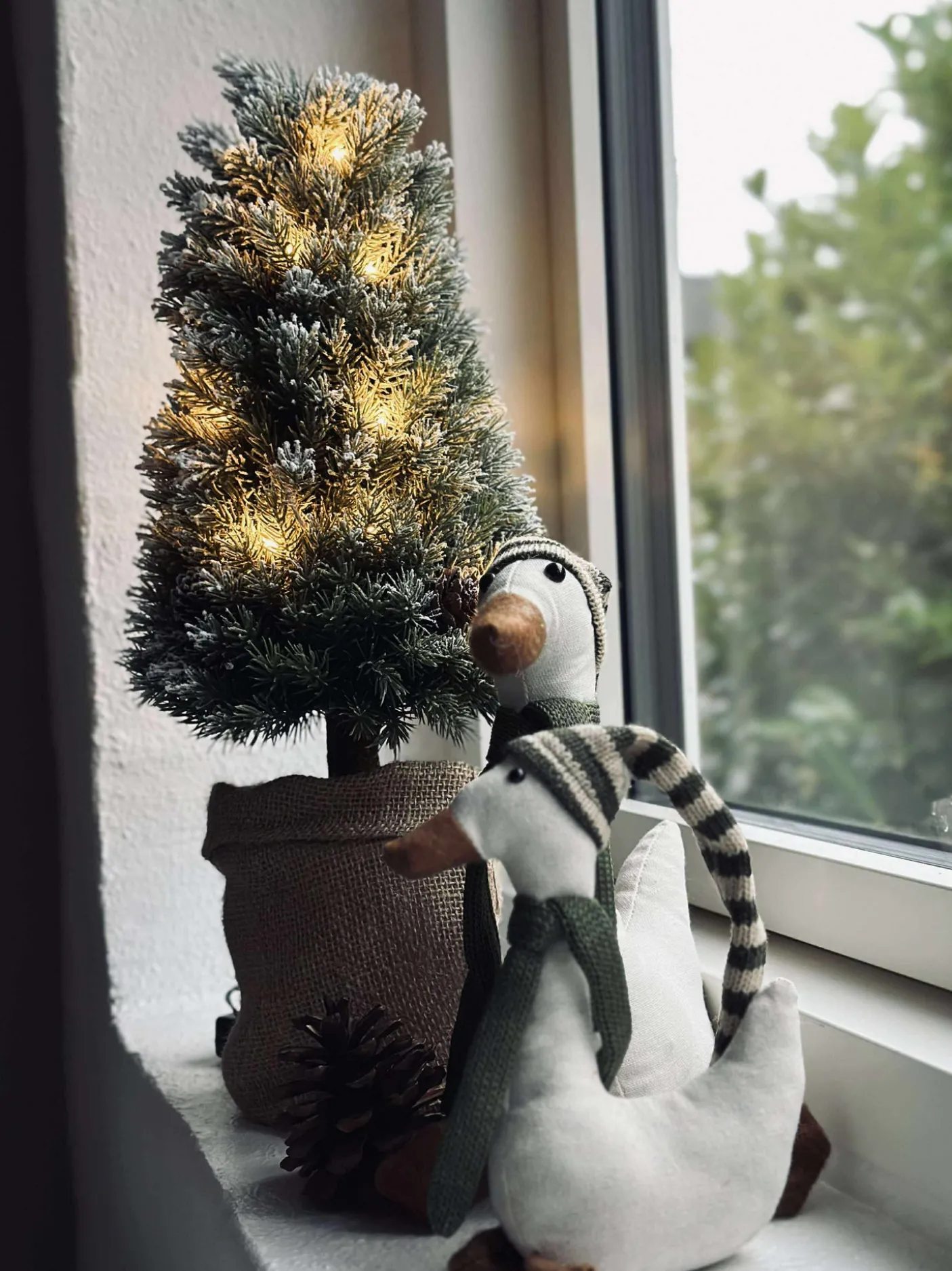 Fineste træ med små kogler og potte med jute.