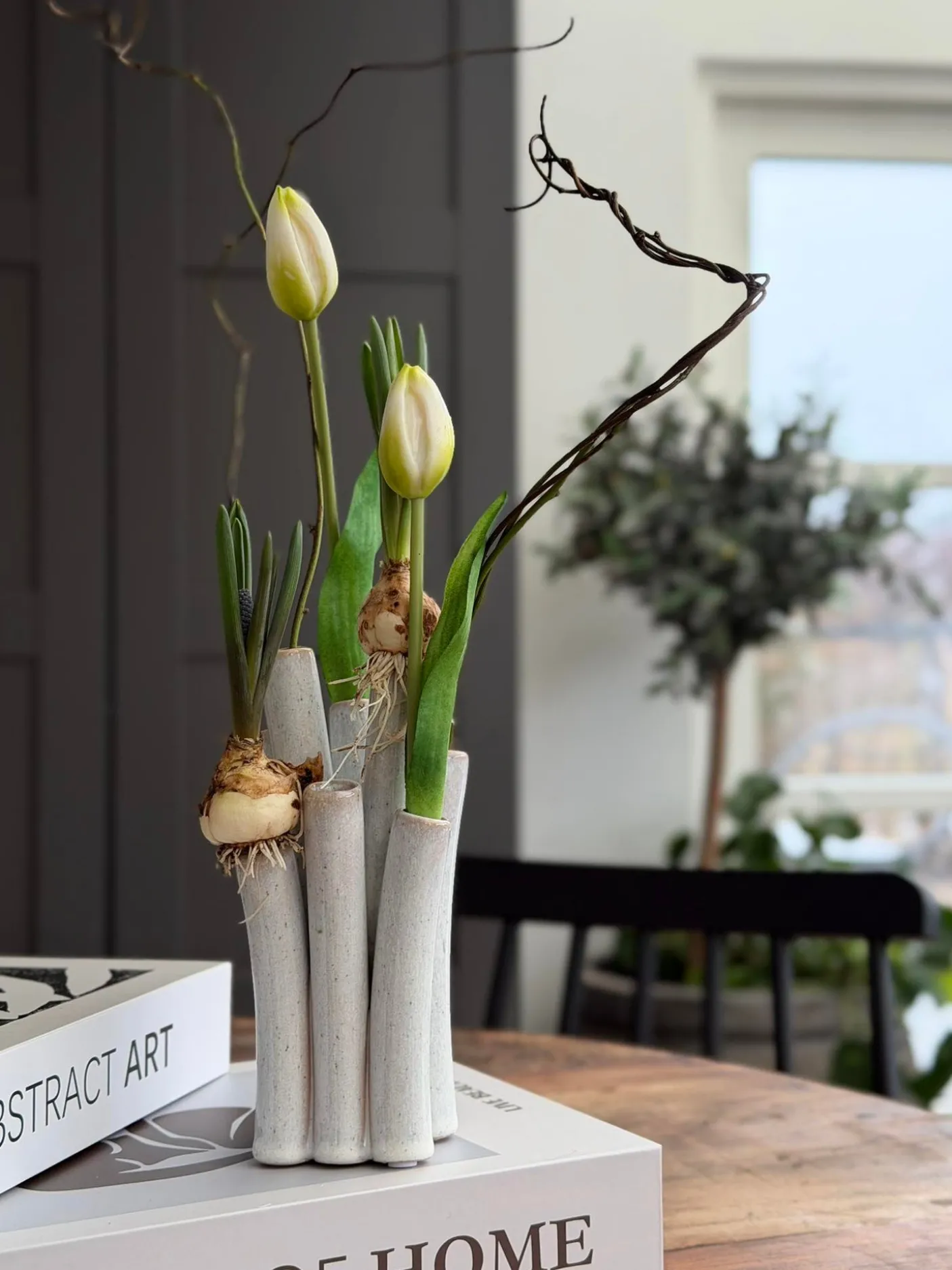 Vase Round Hvid er en dekorativ vase til små blomsterstilke. Højde 18,3 cm og diameter Ø 9,5 cm gør den velegnet til kompakte arrangementer. Fremstillet i keramik og udført i dusede farver, der skaber et afdæmpet udtryk. Den enkle form giver mulighed for både at stå alene og indgå i mindre grupper.