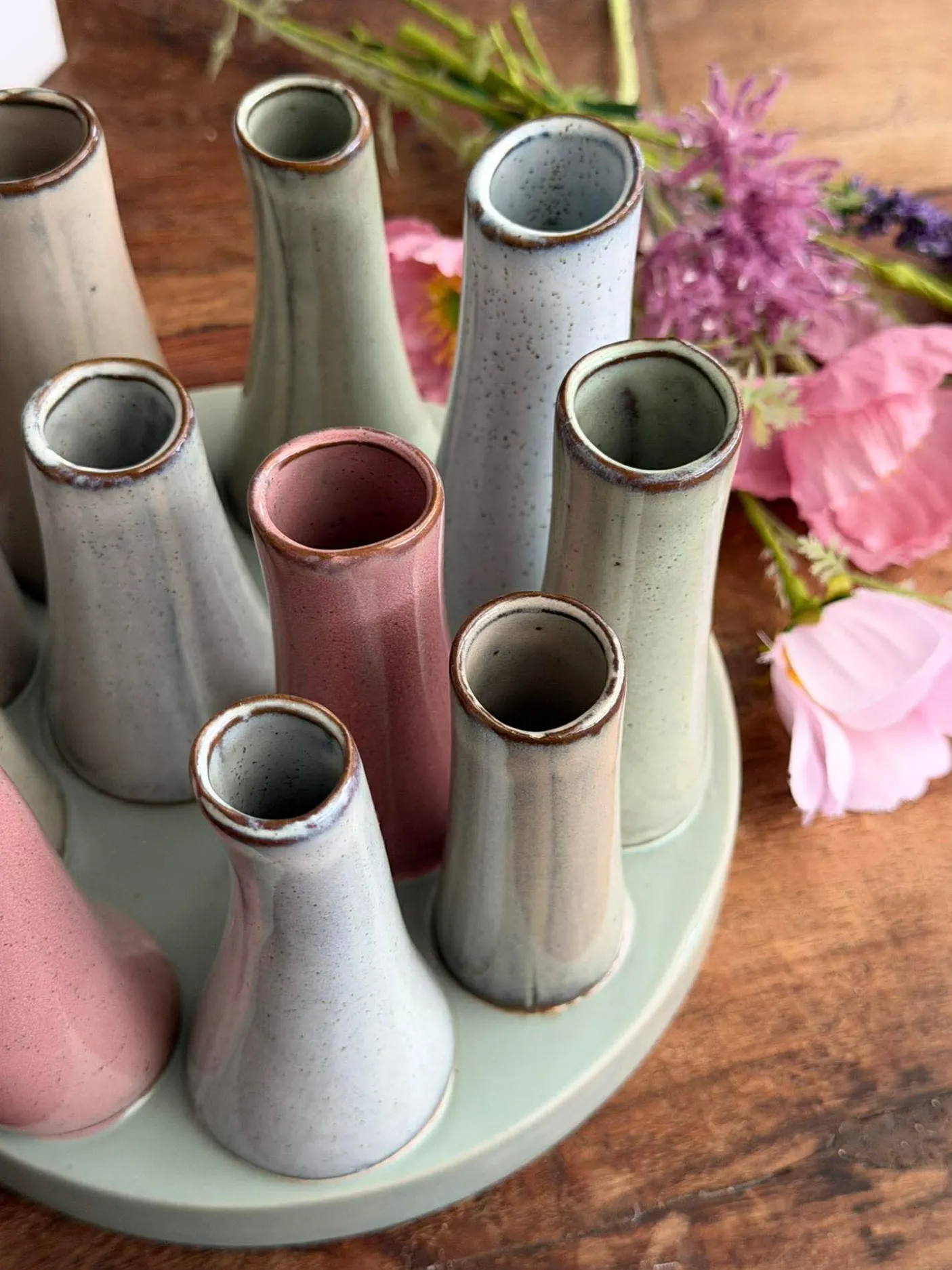 Materiale: keramik. Vasen har et råt-mix præg i sit udtryk, hvor overfladen og formen skaber et afdæmpet, taktilt look der komplimenterer både enkle og mere sammensatte opsætninger.