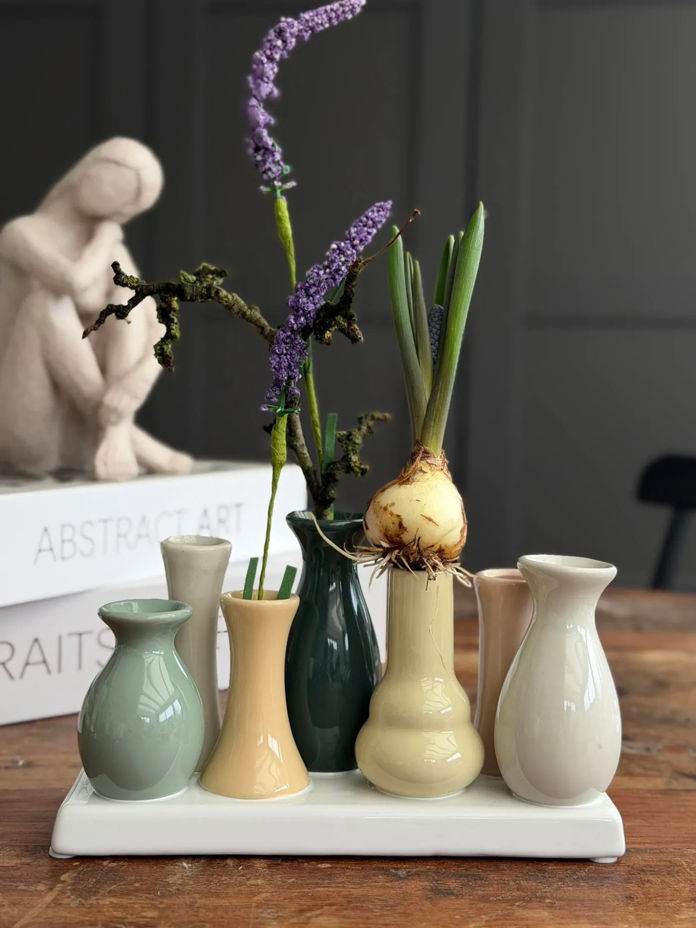 Vase Siluetta er en dekorativ vase til små blomsterstilke, designet som en diskret detalje i hjemmet. Højde 10,5 cm, Længde 18 cm og Bredde 7 cm angiver dens kompakte format, og materialet er keramik. De dusede farver skaber et blødt, afdæmpet udtryk, der arbejder indirekte med resten af indretningen.