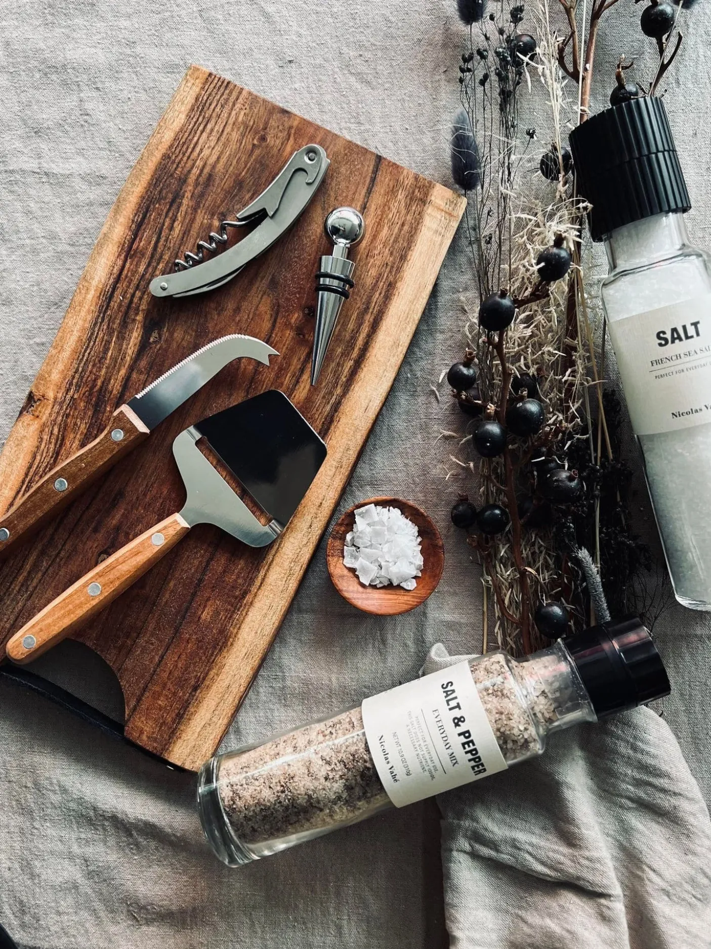 Vin og oste sæt – oplukker og knive er et samlet sæt til servering af vin og ost. Det ensfarvede, sølvfarvede udtryk giver et roligt og klassisk look på bordet, uanset om du dækker op til tapas eller en enkel osteservering.