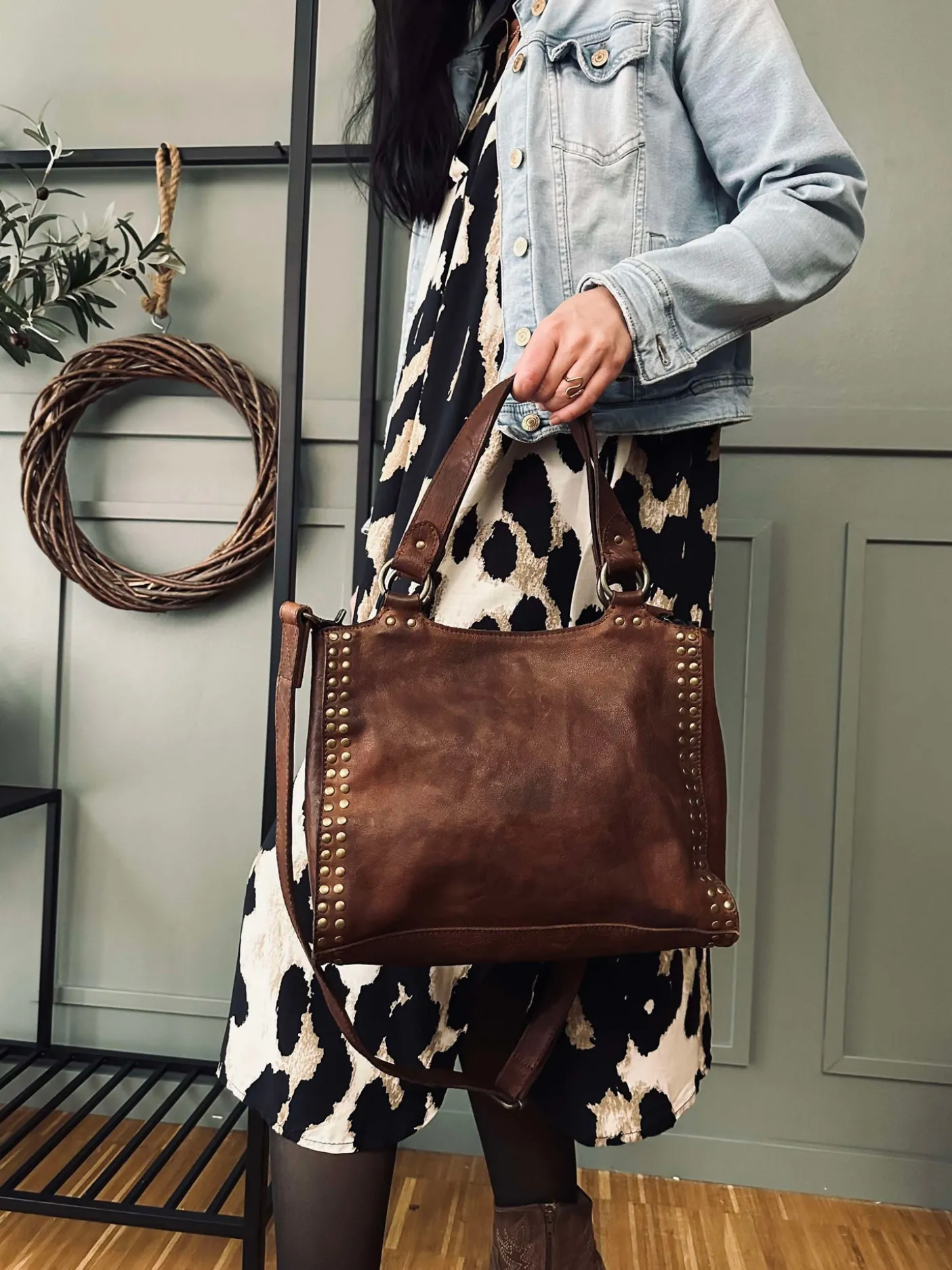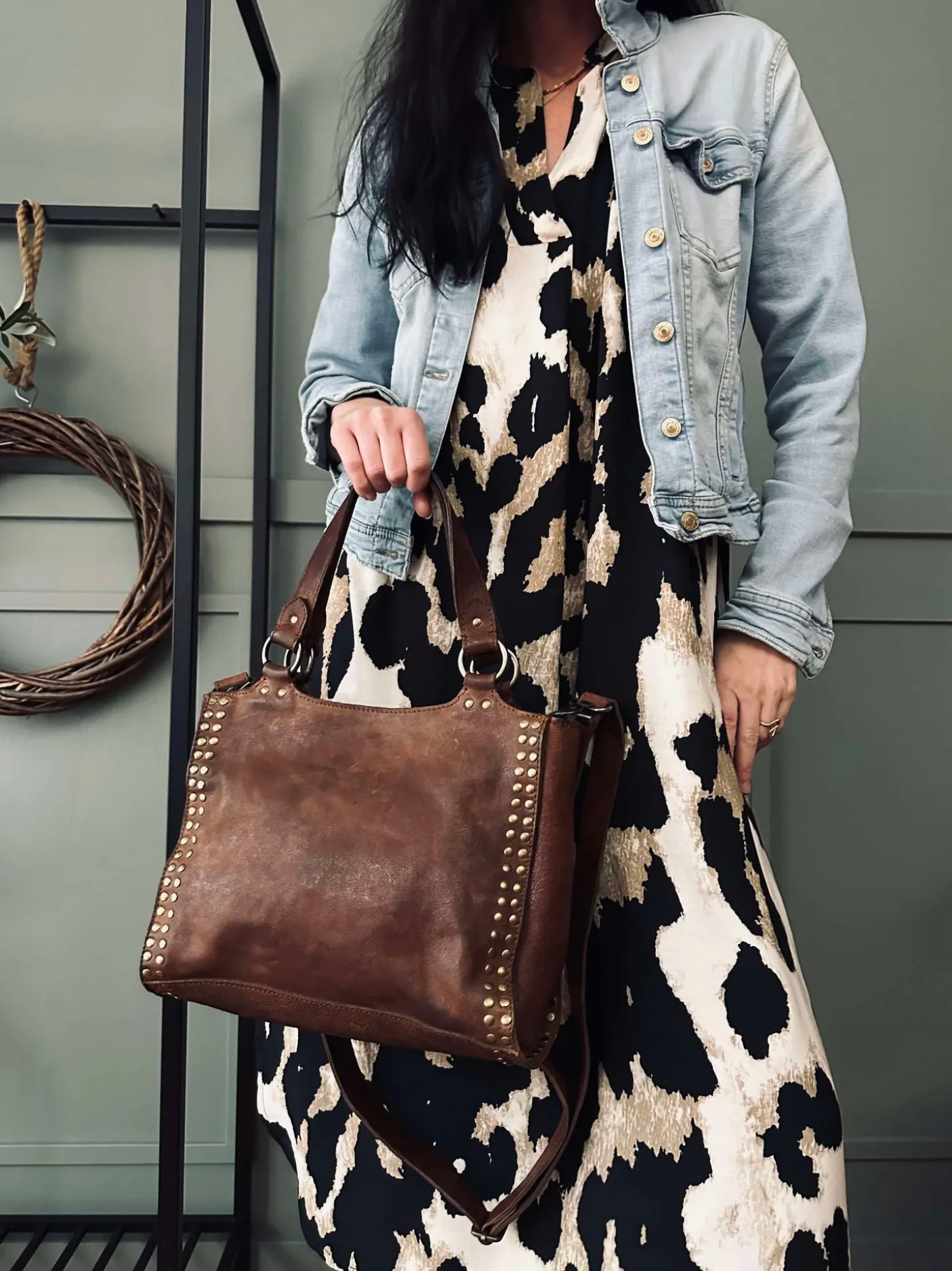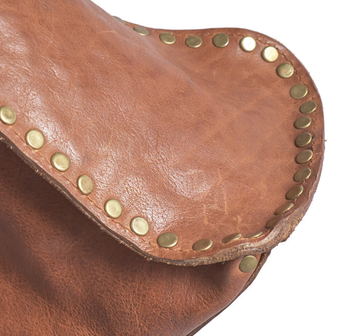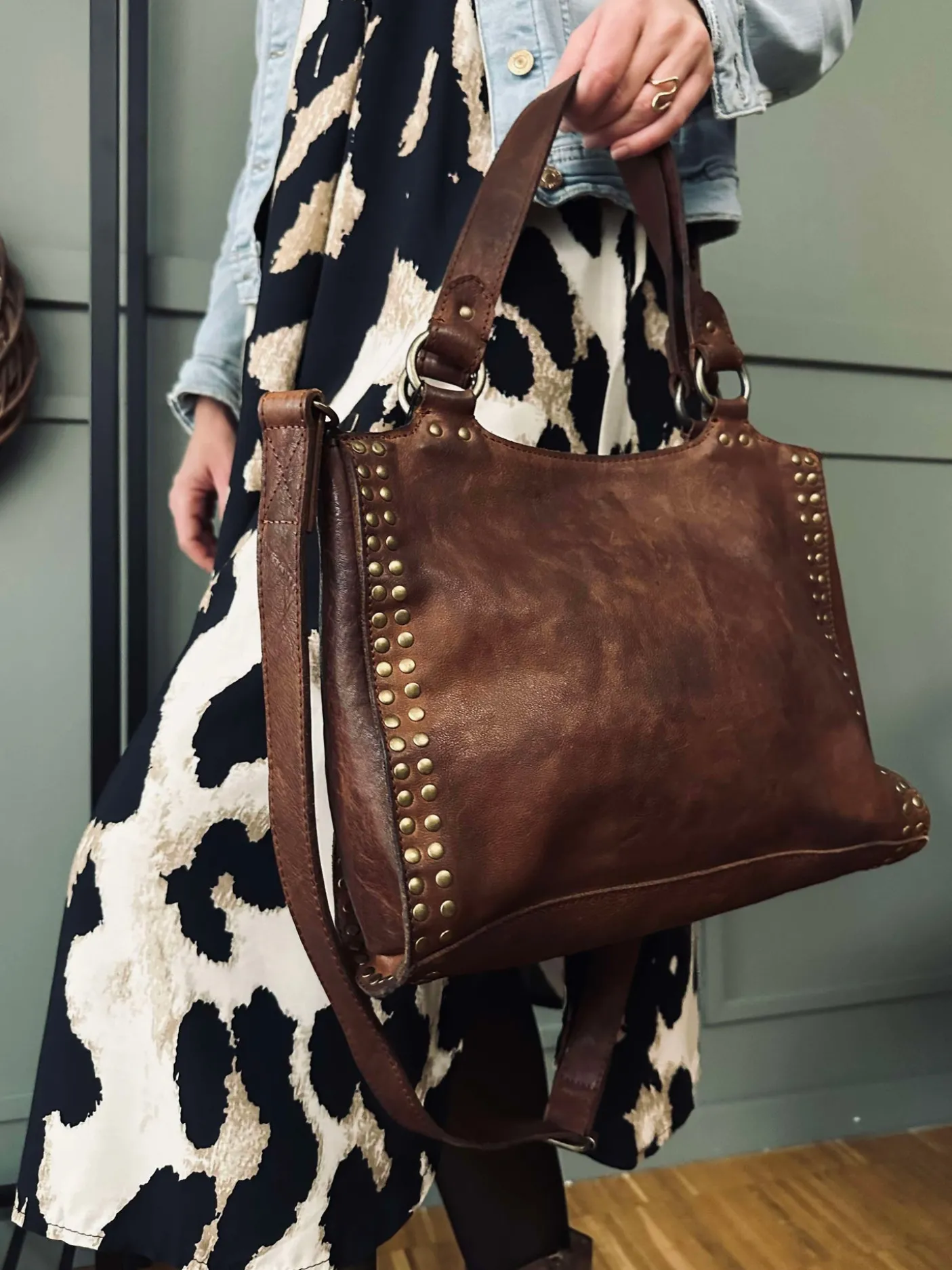 Forsiden af tasken er prydet med smukke guldfarvede nitter, der tilføjer et chikt strejf af sofistikering til dit hverdagsoutfit.