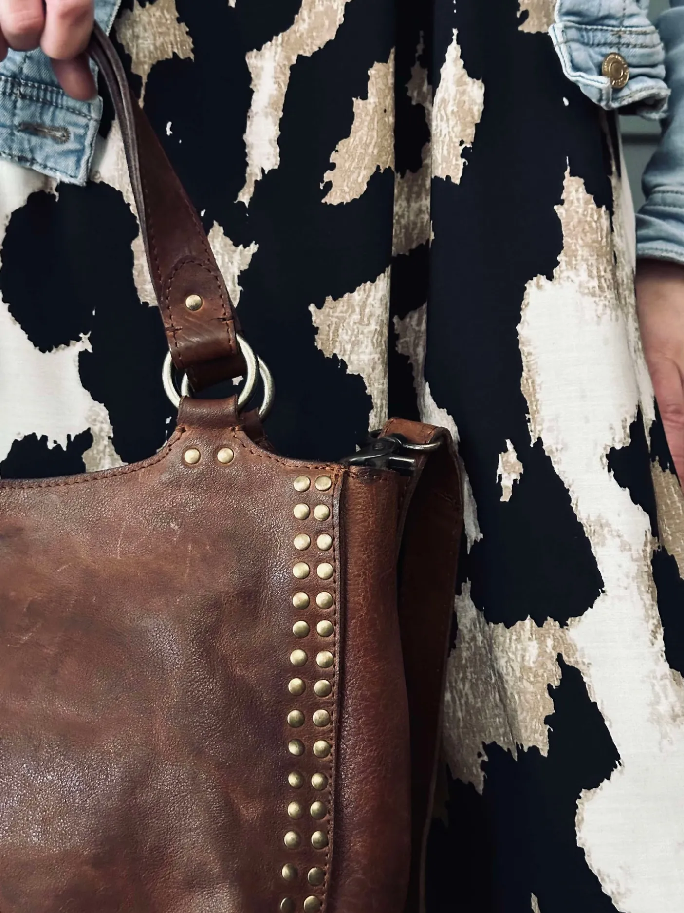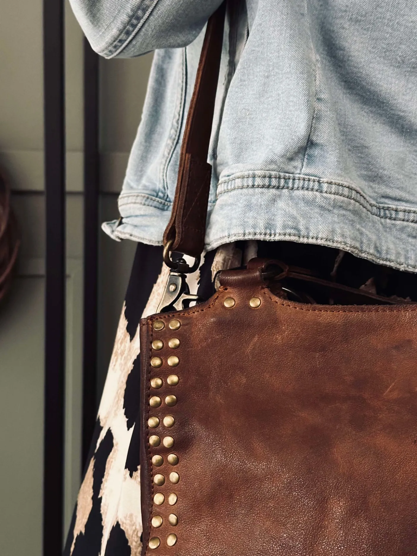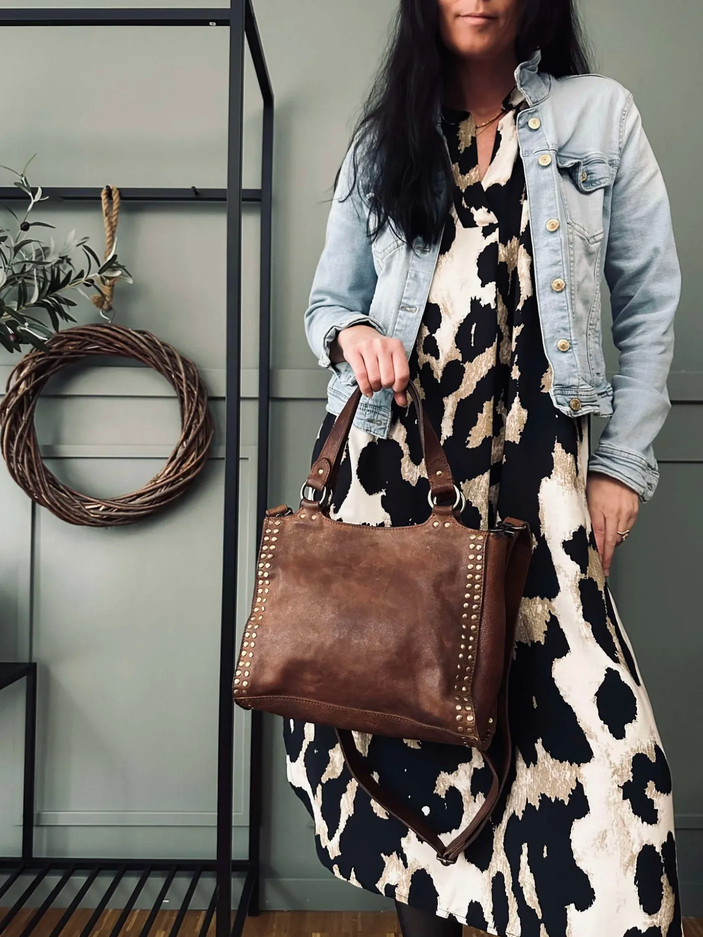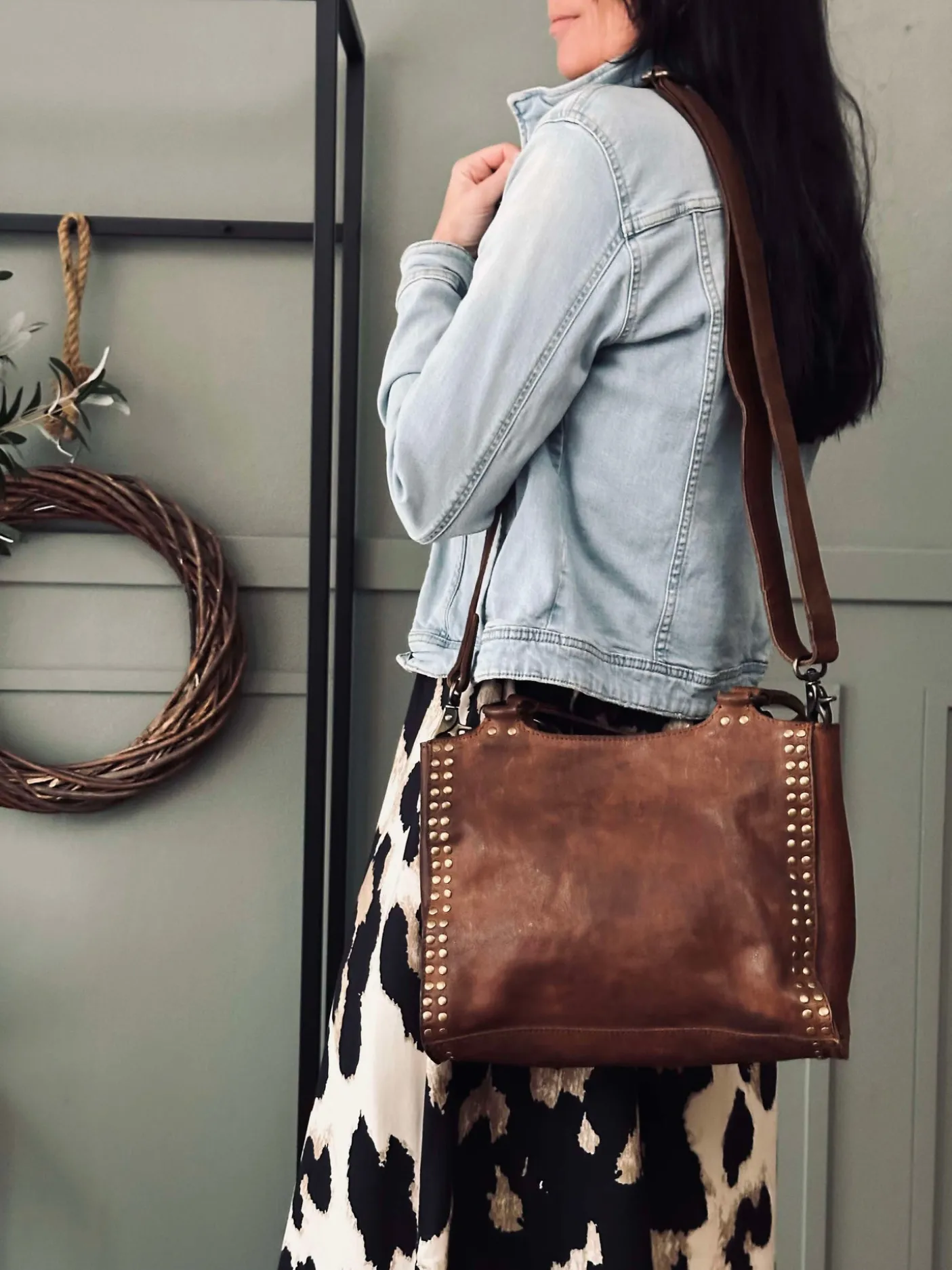 Forsiden af tasken er prydet med smukke guldfarvede nitter, der tilføjer et chikt strejf af sofistikering til dit hverdagsoutfit.