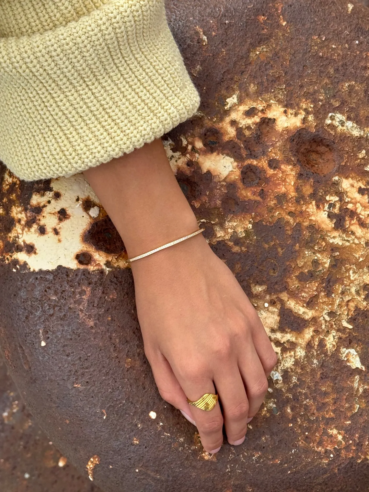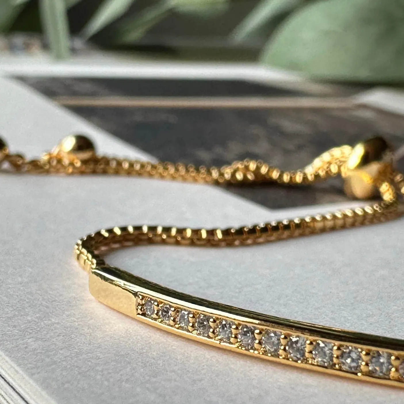 Smukt og enkelt armbånd. Det har et look som et enkelt tennis-armbånd, og alle CZ sten er fattet i en bøjle der lægger sig om håndleddet. Armbåndet er forgyldt. Det er fleksibelt og passer derfor alle.