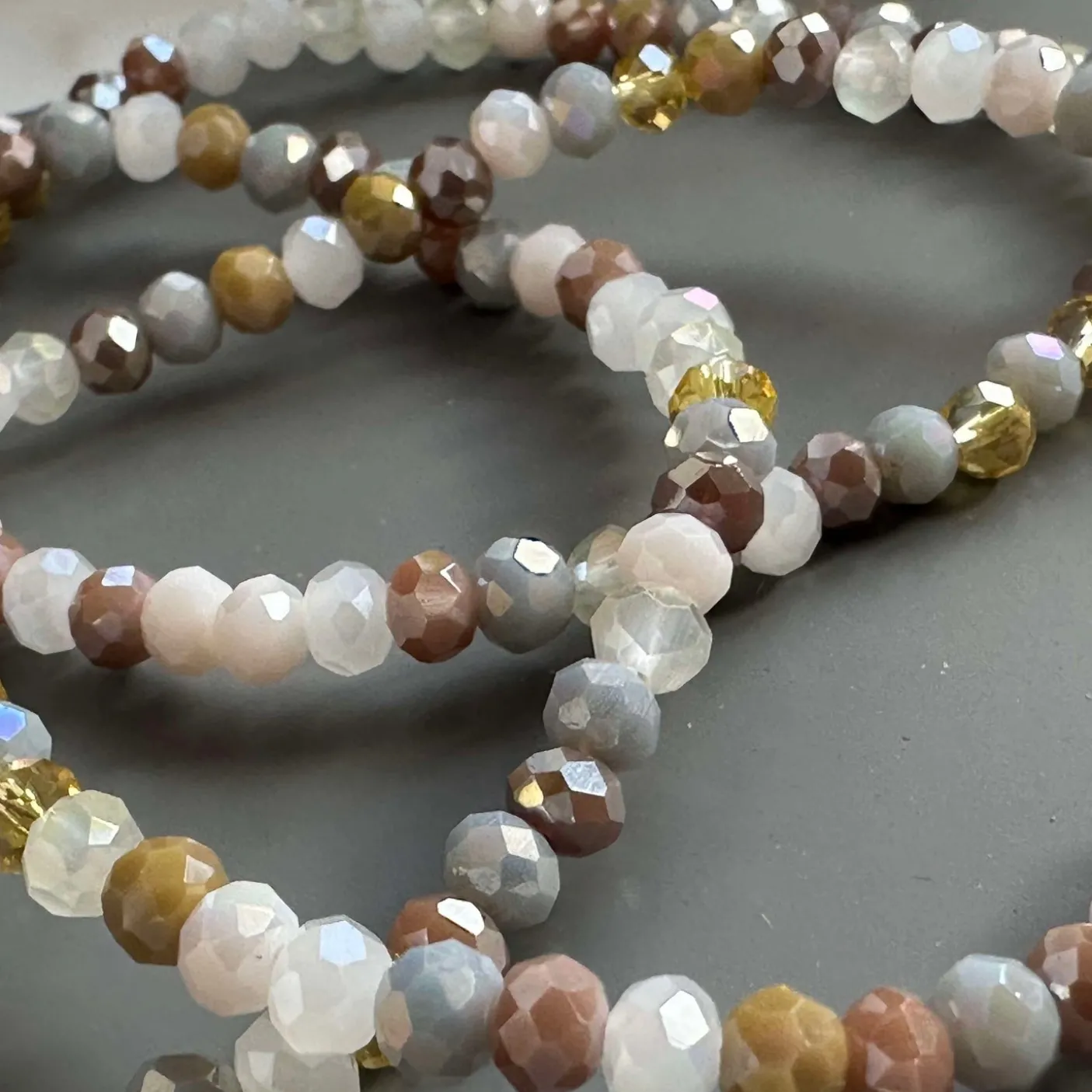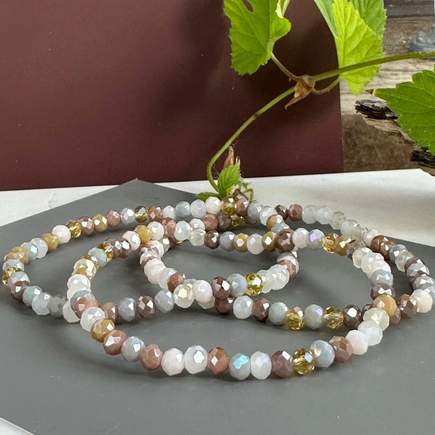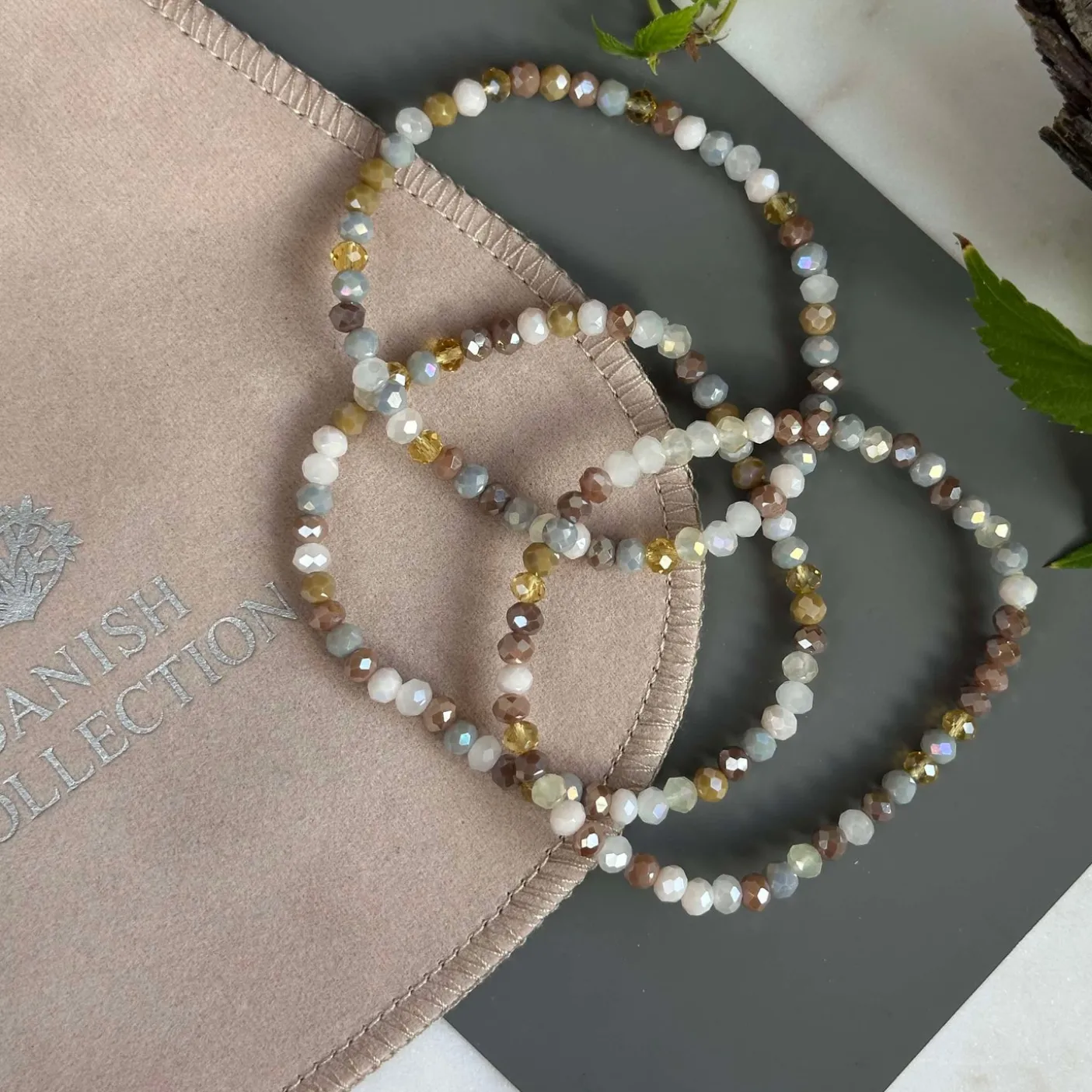 3 smukke armbånd i et sæt – præsenteret i en lækker velour gavepose. I sættet får du tre elastiske armbånd, der passer str XS til L – lækre farver i neutrale nuancer, og med facetterede perler.