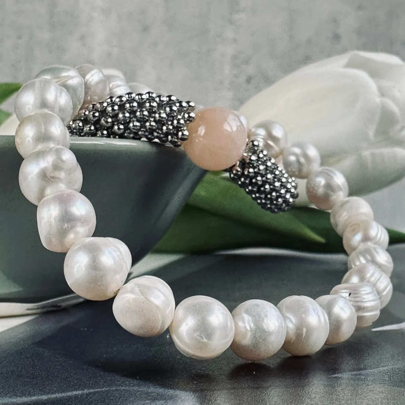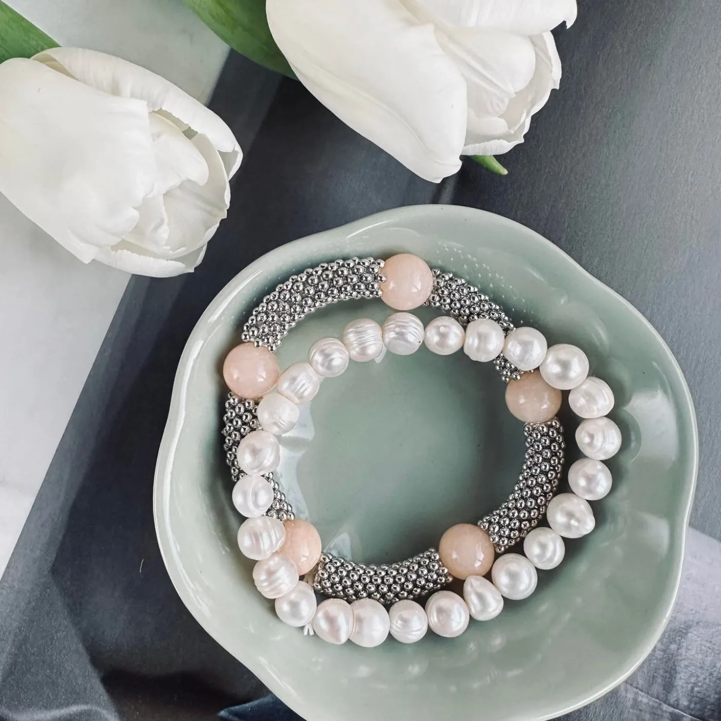Fantastisk og feminint armbånds-sæt med ferskvandsperler samt et armbånd med natursten.