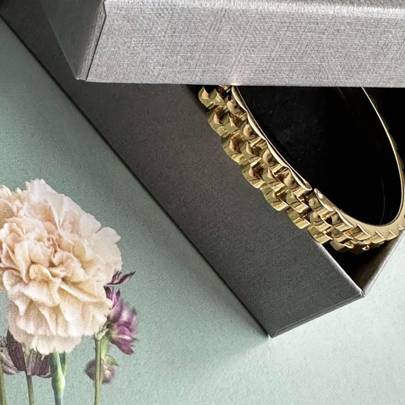 Materiale: rustfrit stål forgyldt med 18K guld, som giver et gyldent, ensfarvet finish.