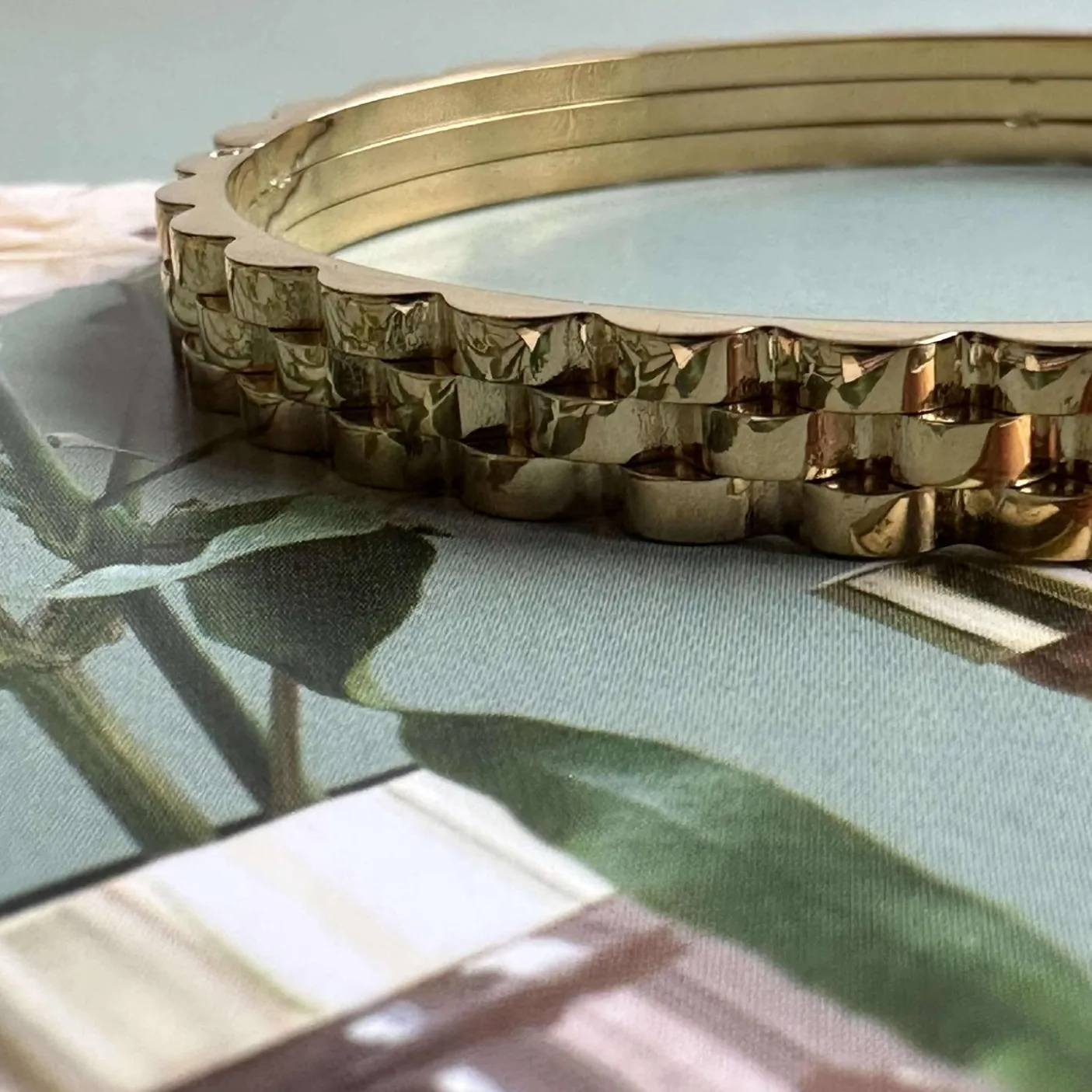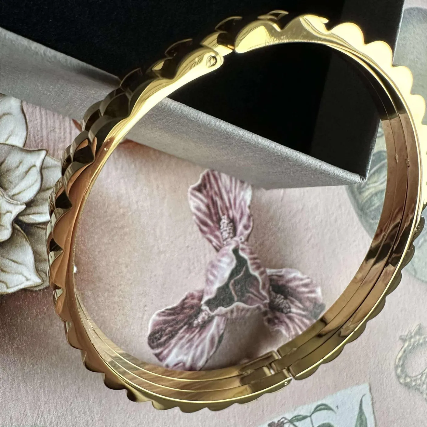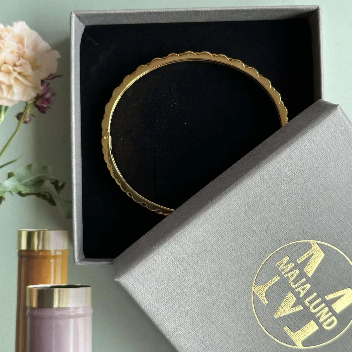 Armbånd Bangle MARITA er en klassisk bangle i rund form, velegnet til både hverdag og fest. Fremstillet i rustfrit stål og forgyldt med 18K guld, med indre mål 16 cm. Udtrykket er tidløst og ensfarvet, hvilket gør det enkelt at mikse med andre armbånd.
