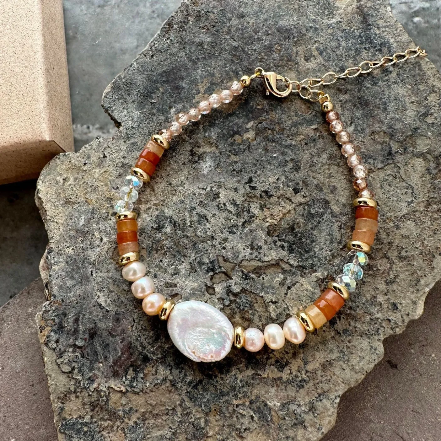 Armbånd med ægte og unikke ferskvandsperler. Isat en smykkelås , fremstillet i 18K forgyldt messing.