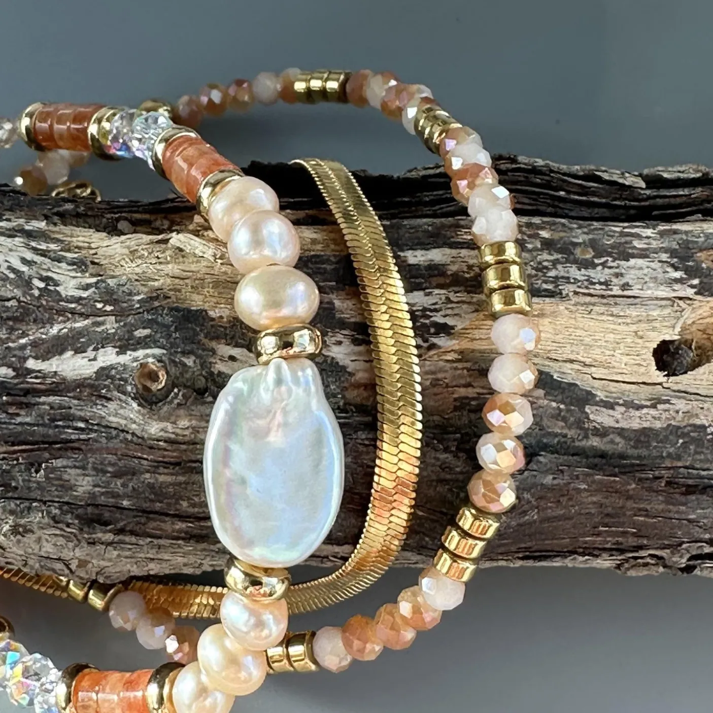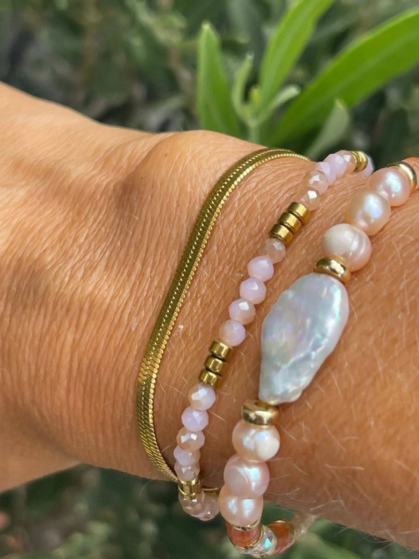 Plus et stk elastik perle armbånd i beige mix farver og sidst et snake armbånd i rustfrit