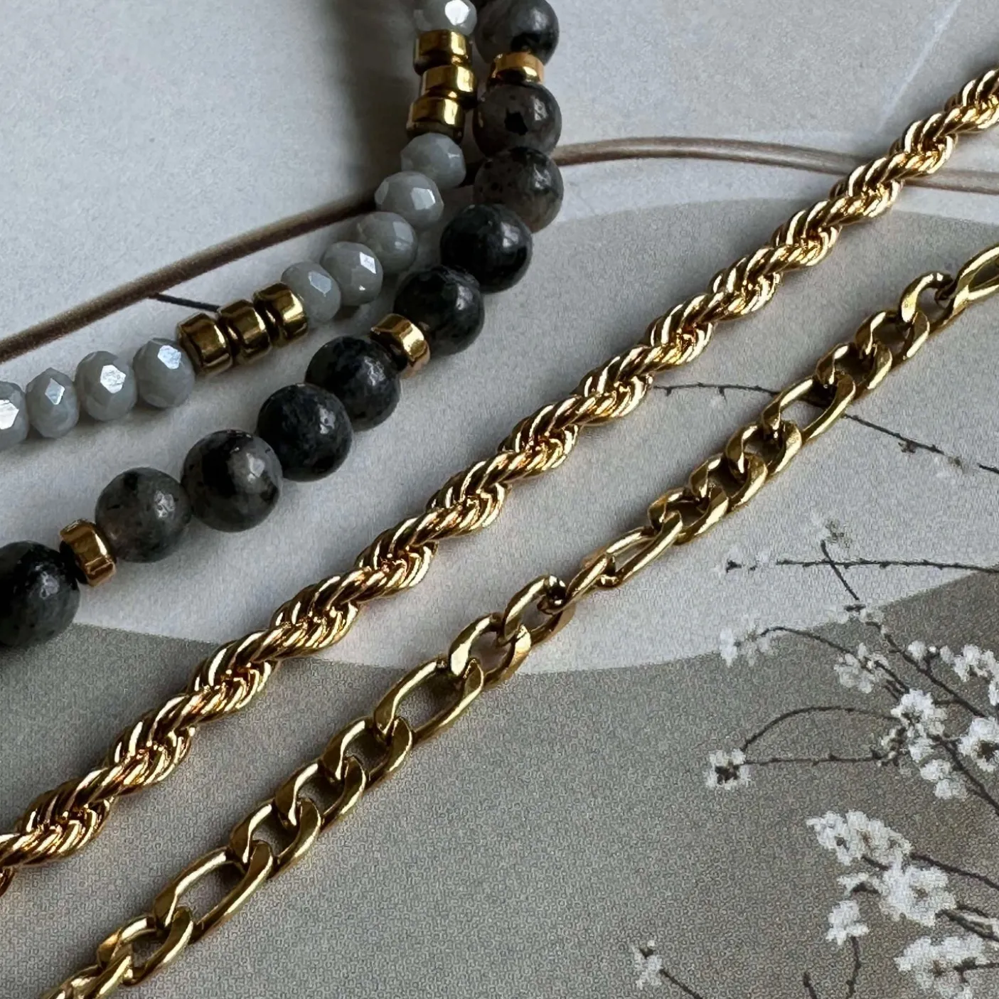 1 stk snoet armbånd samt 1 link armbånd, begge i rustfrit stål forgyldt med 18K guld.