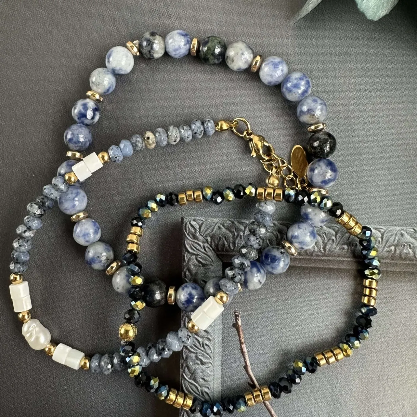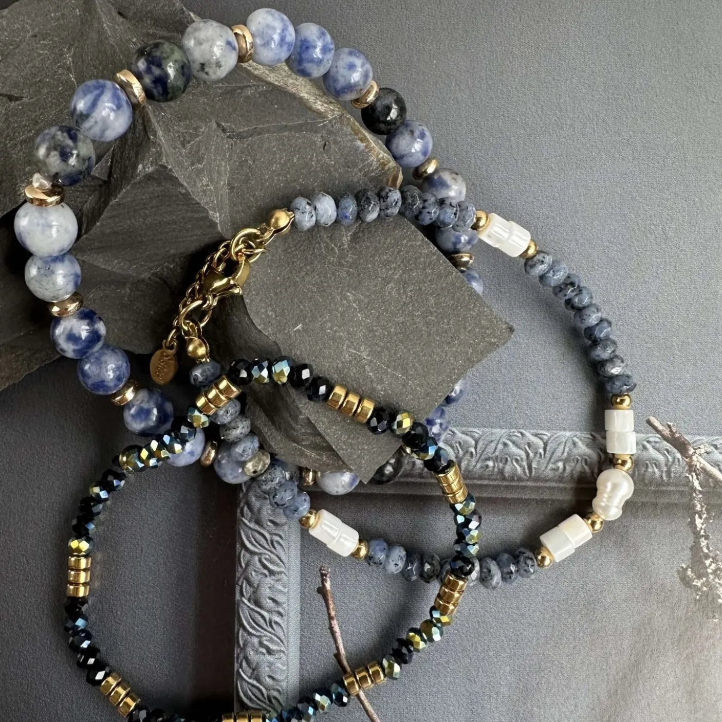 De tre små fine perler i midten er ægte ferskvandsperler. Et sæt med tre armbånd til en stærk pris.