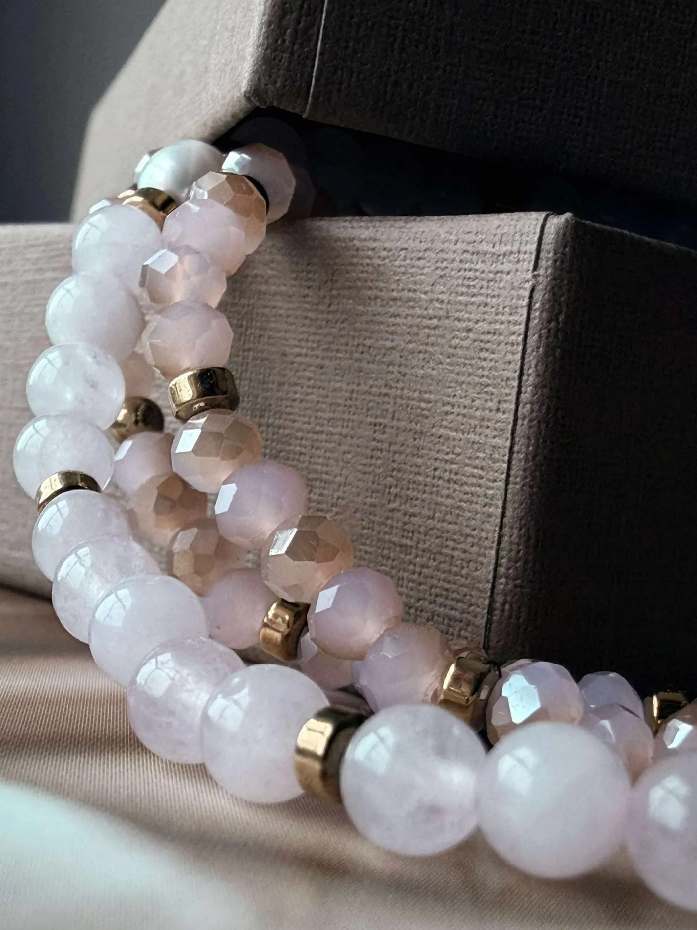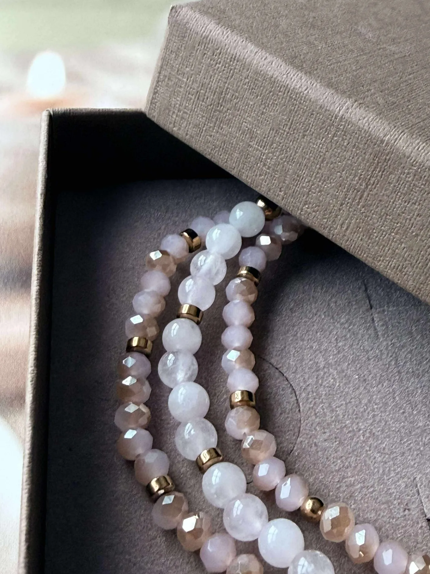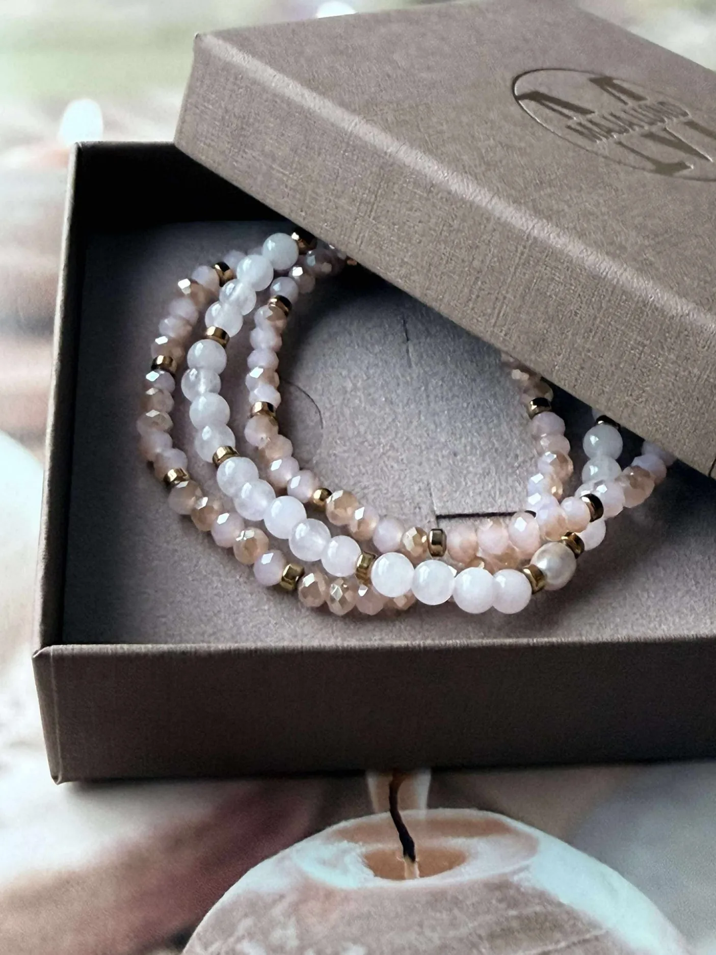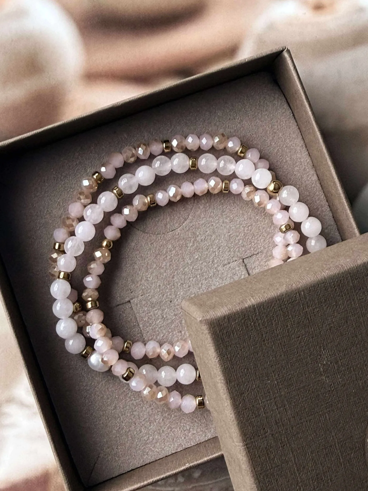 3 armbånd i et sæt – præsenteret i en flot gaveæske. I sættet får du 3 elastiske armbånd, der passer str XS-L. De små armbånd er med 3mm facetterede sten og det lidt større i midten er med natur-sten, hvor du i midten har en ægte ferskvandsperle.