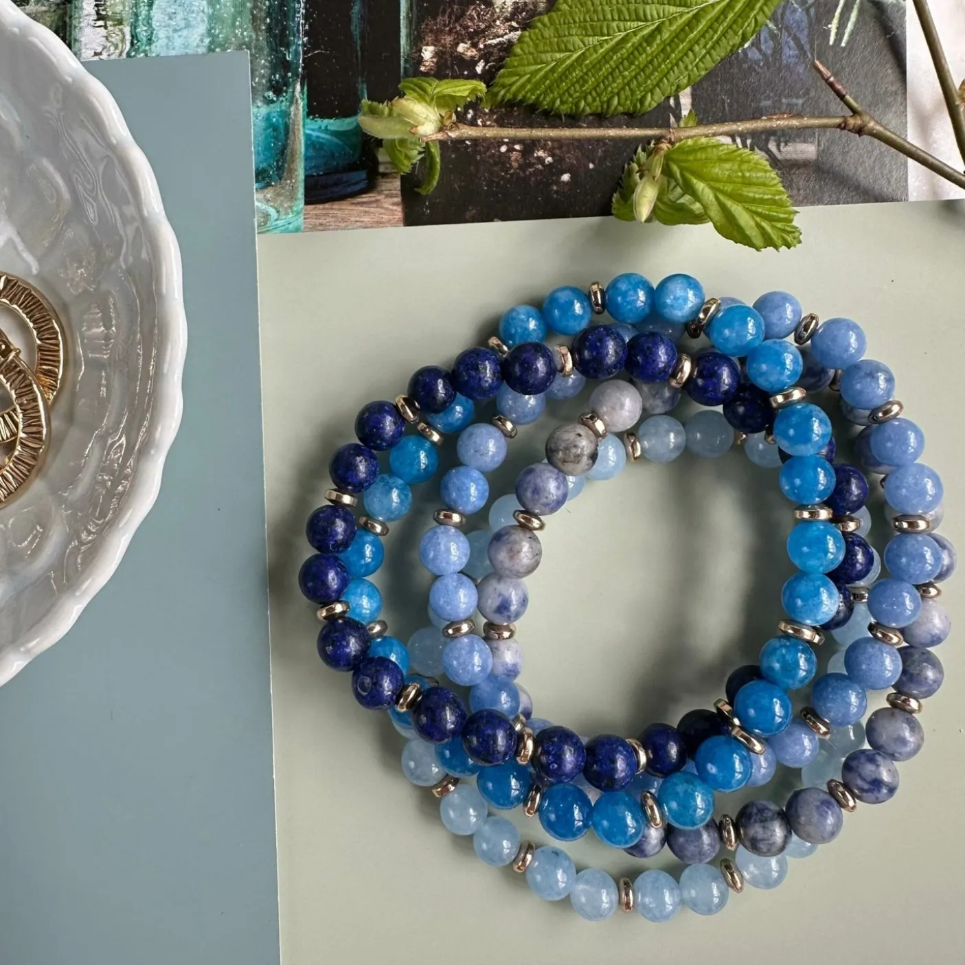 Smukt armbånd i kombination af unikke natursten og guldbelagte perler i et blåt mix.