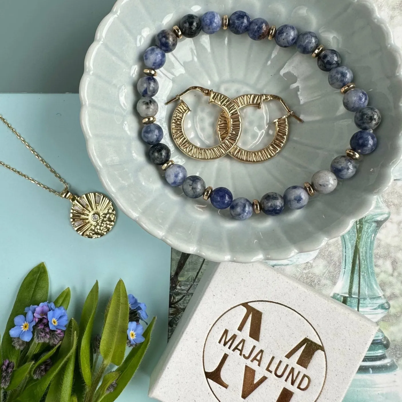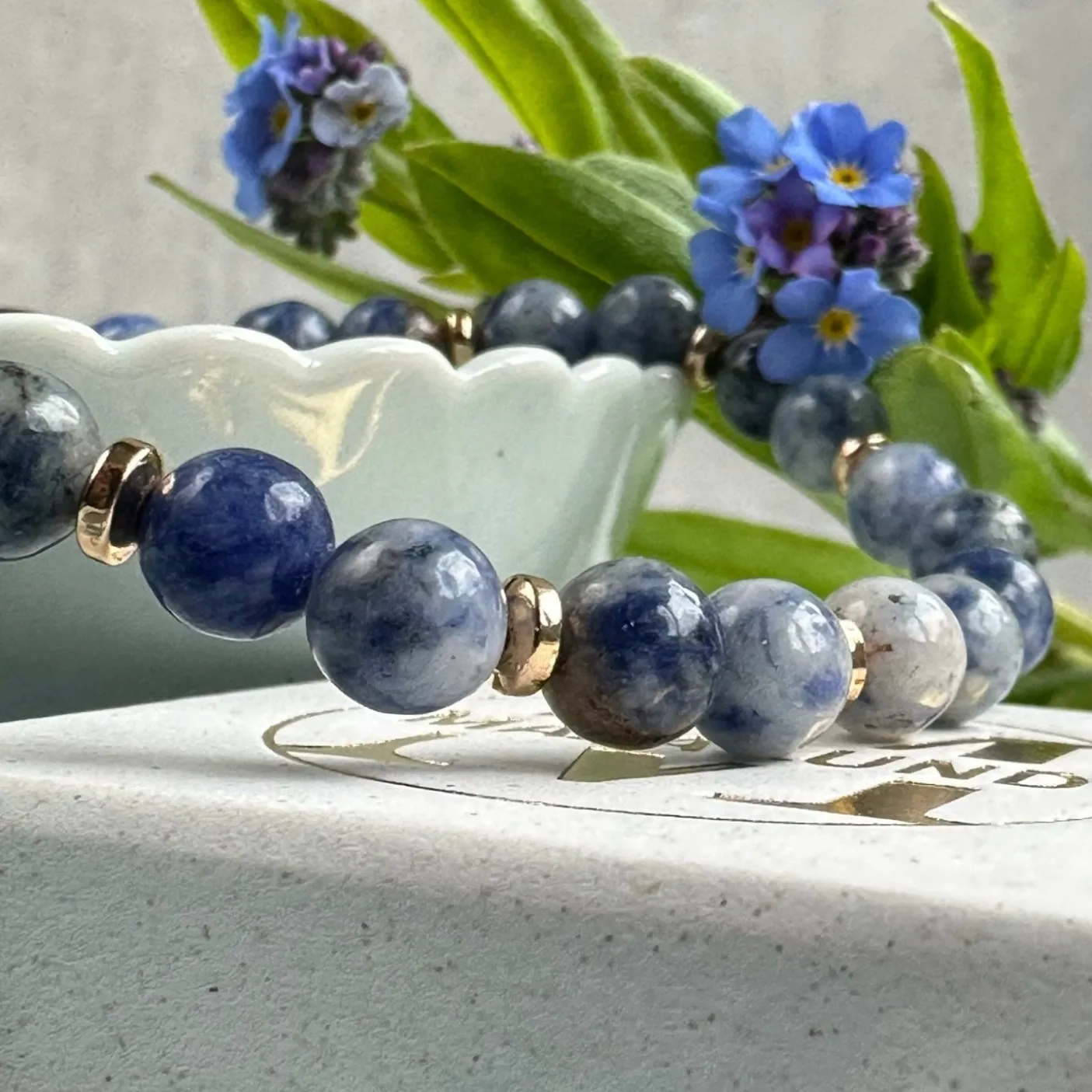 Smukt armbånd i unikke natursten og guldbelagte perler.