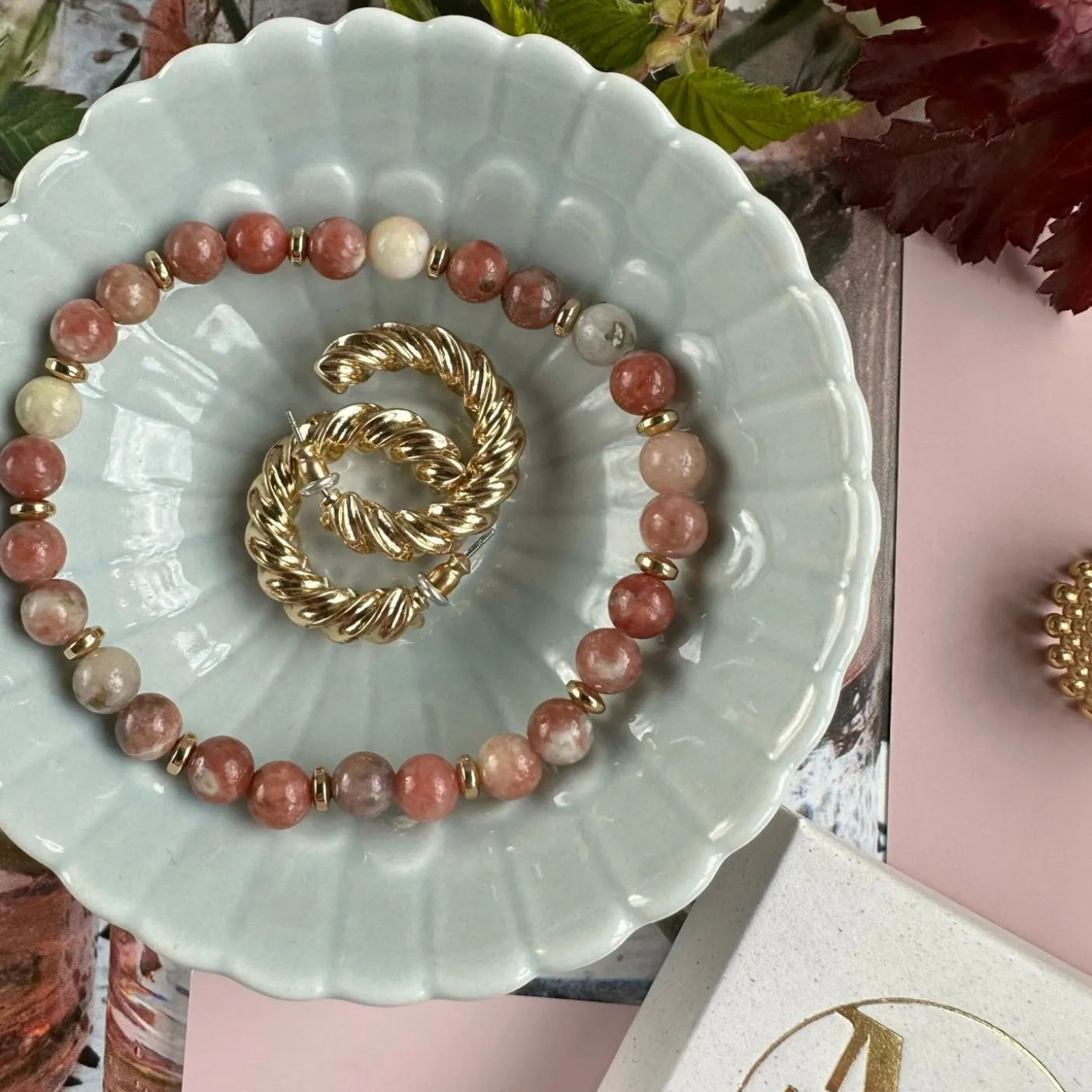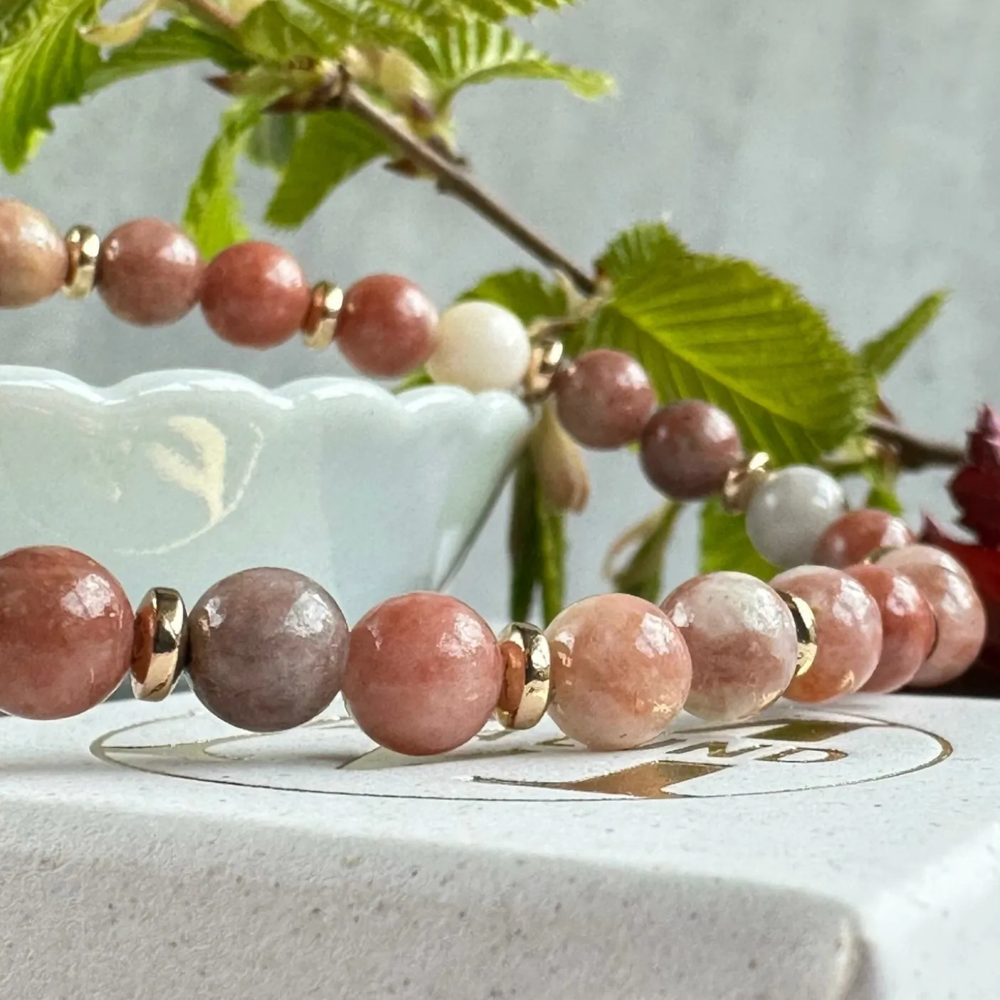 Smukt armbånd i unikke natursten og guldbelagte perler.