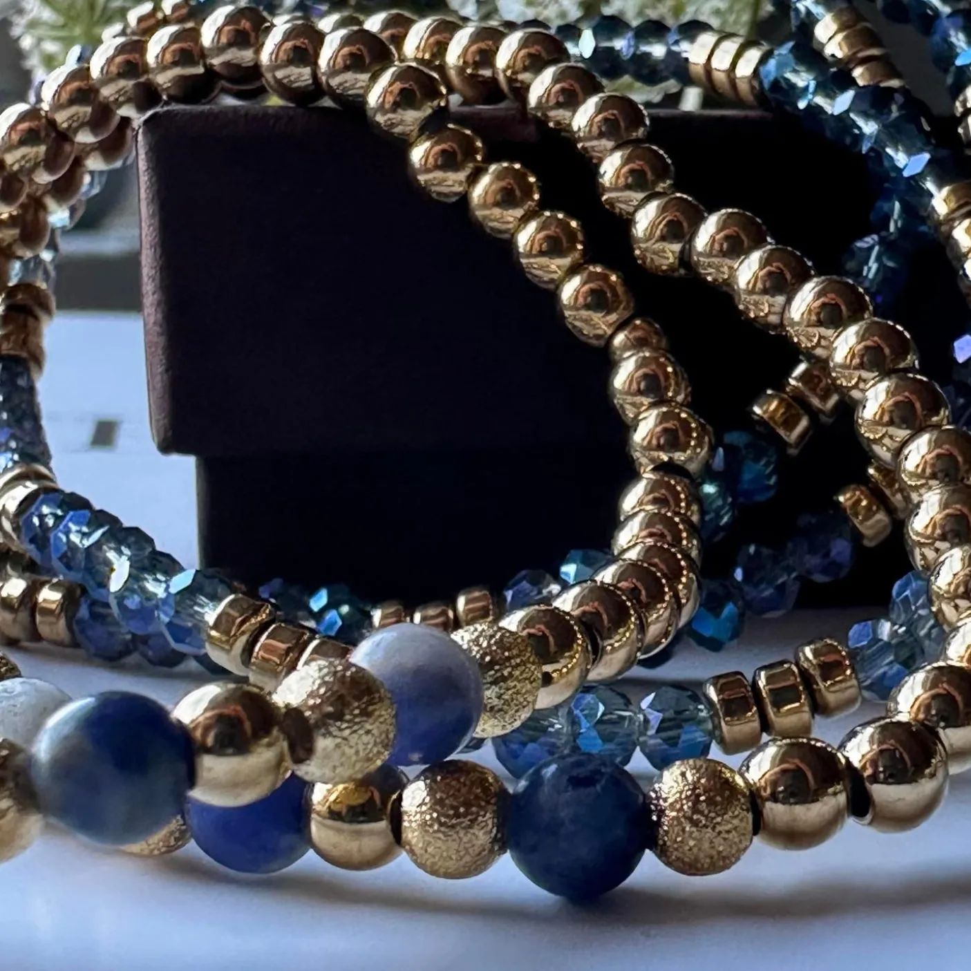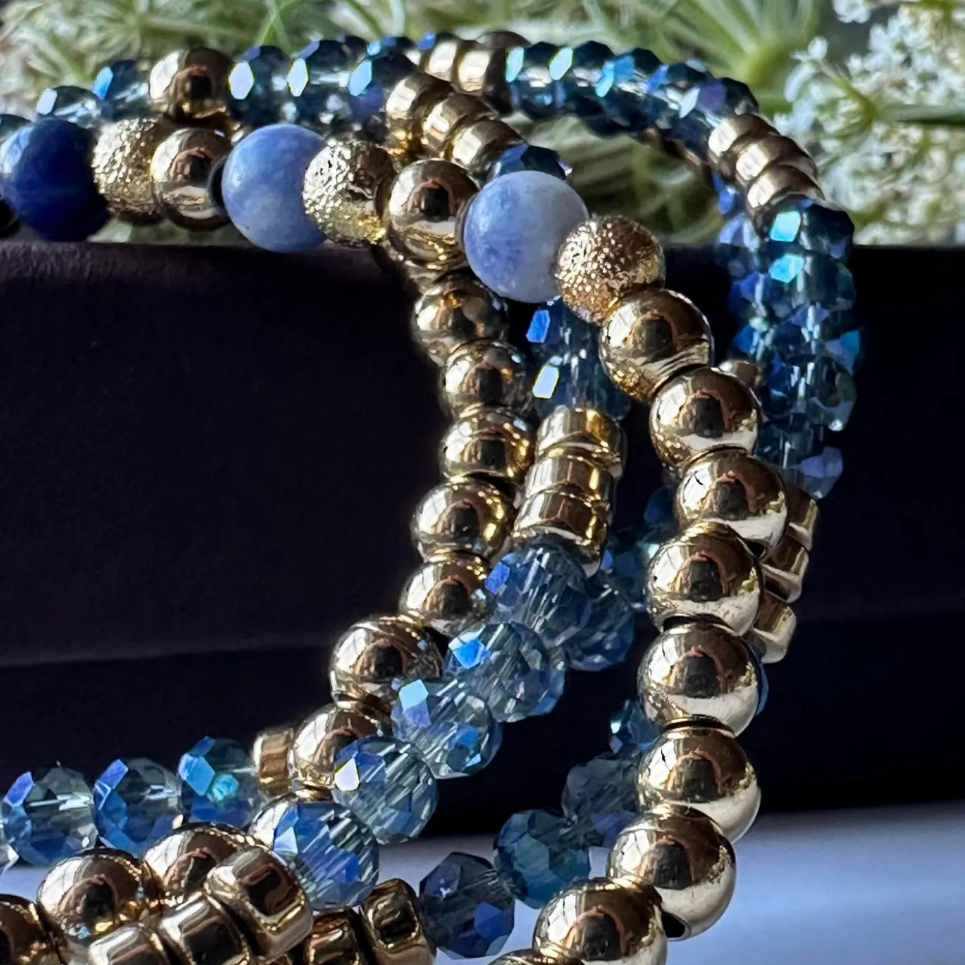 De små armbånd er med 3mm facetterede sten, de to andre er udført i rustfrit stål og med 4mm naturstens-perler i.